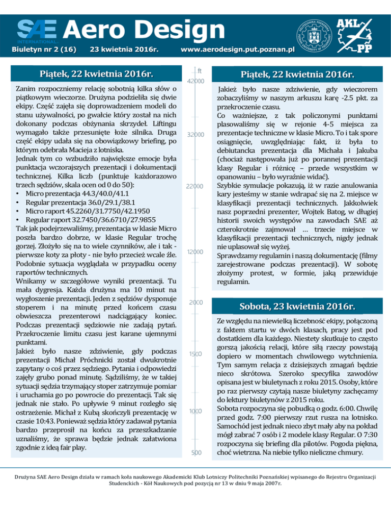 Biuletyn nr 2 (16) 23 kwietnia 2016r. Piątek, 22 kwietnia 2016r. Zanim rozpoczniemy relację sobotnią kilka słów o piątkowym wieczorze. Drużyna podzieliła się dwie ekipy. Część zajęła się doprowadzeniem modeli do stanu używalności, po gwałcie który został na nich dokonany podczas obżynania skrzydeł. Liftingu wymagało także przesunięte łoże silnika. Druga część ekipy udała się na obowiązkowy briefing, po którym odebrała Macieja z lotniska. Jednak tym co wzbudziło największe emocje była punktacja wczorajszych prezentacji i dokumentacji technicznej. Kilka liczb (punktuje każdorazowo trzech sędziów, skala ocen od 0 do 50): • Micro prezentacja 44.3/40.0/41.1 • Regular prezentacja 36.0/29.1/38.1 • Micro raport 45.2260/31.7750/42.1950 • Regular raport 32.7450/36.6710/27.9855 Tak jak podejrzewaliśmy, prezentacja w klasie Micro poszła bardzo dobrze, w klasie Regular trochę gorzej. Złożyło się na to wiele czynników, ale i tak pierwsze koty za płoty - nie było przecież wcale źle. Podobnie sytuacja wyglądała w przypadku oceny raportów technicznych. Wnikamy w szczegółowe wyniki prezentacji. Tu mała dygresja. Każda drużyna ma 10 minut na wygłoszenie prezentacji. Jeden z sędziów dysponuje stoperem i na minutę przed końcem czasu obwieszcza prezenterowi nadciągający koniec. Podczas prezentacji sędziowie nie zadają pytań. Przekroczenie limitu czasu jest karane ujemnymi punktami. Jakież było nasze zdziwienie, gdy podczas prezentacji Michał Próchnicki został dwukrotnie zapytany o coś przez sędziego. Pytania i odpowiedzi zajęły grubo ponad minutę. Sądziliśmy, że w takiej sytuacji sędzia trzymający stoper zatrzymuje pomiar i uruchamia go po powrocie do prezentacji. Tak się jednak nie stało. Po upływie 9 minut rozległo się ostrzeżenie. Michał z Kubą skończyli prezentację w czasie 10:43. Ponieważ sędzia który zadawał pytania bardzo przeprosił na końcu za przeszkadzanie uznaliśmy, że sprawa będzie jednak załatwiona zgodnie z ideą fair play. www.aerodesign.put.poznan.pl ft 42000 32000 22000 12000 2000 1500 1000 500 Piątek, 22 kwietnia 2016r. Jakież było nasze zdziwienie, gdy wieczorem zobaczyliśmy w naszym arkuszu karę -2.5 pkt. za przekroczenie czasu. Co ważniejsze, z tak policzonymi punktami plasowaliśmy się w rejonie 4-5 miejsca za prezentacje techniczne w klasie Micro. To i tak spore osiągnięcie, uwzględniając fakt, iż była to debiutancka prezentacja dla Michała i Jakuba (chociaż następowała już po porannej prezentacji klasy Regular i różnicę – przede wszystkim w opanowaniu – było wyraźnie widać). Szybkie symulacje pokazują, iż w razie anulowania kary jesteśmy w stanie wdrapać się na 2. miejsce w klasyfikacji prezentacji technicznych. Jakkolwiek nasz poprzedni prezenter, Wojtek Batog, w długiej historii swoich występów na zawodach SAE aż czterokrotnie zajmował … trzecie miejsce w klasyfikacji prezentacji technicznych, nigdy jednak nie uplasował się wyżej. Sprawdzamy regulamin i naszą dokumentację (filmy zarejestrowane podczas prezentacji). W sobotę złożymy protest, w formie, jaką przewiduje regulamin. Sobota, 23 kwietnia 2016r. Ze względu na niewielką liczebność ekipy, połączoną z faktem startu w dwóch klasach, pracy jest pod dostatkiem dla każdego. Niestety skutkuje to często gorszą jakością relacji, które siłą rzeczy powstają dopiero w momentach chwilowego wytchnienia. Tym samym relacja z dzisiejszych zmagań będzie nieco skrótowa. Szeroko specyfika zawodów opisana jest w biuletynach z roku 2015. Osoby, które po raz pierwszy czytają nasze biuletyny zachęcamy do lektury biuletynów z 2015 roku. Sobota rozpoczyna się pobudką o godz. 6:00. Chwilę przed godz. 7:00 pierwszy rzut rusza na lotnisko. Samochód jest jednak nieco zbyt mały aby na pokład mógł zabrać 7 osób i 2 modele klasy Regular. O 7:30 rozpoczyna się briefing dla pilotów. Pogoda piękna, choć wietrzna. Na niebie tylko nieliczne chmury. Drużyna SAE Aero Design działa w ramach koła naukowego Akademicki Klub Lotniczy Politechniki Poznańskiej wpisanego do Rejestru Organizacji Studenckich - Kół Naukowych pod pozycją nr 13 w dniu 9 maja 2007r. Biuletyn nr 2 (16) 23 kwietnia 2016r. Sobota, 23 kwietnia 2016r. Zawody rozpoczynają się kolejką lotów klasy Micro, po nich latają samoloty Regular, a następnie Advanced. W rejonie naszego stanowiska pracy rozwieszamy polską flagę, flagę Politechniki Poznańskiej i Poznania. W sumie ekip z Polski jest tu aż cztery. Dobrą markę wyrobiła startująca tu od zamierzchłych czasów Politechnika Warszawska, ale kolejne ekipy tylko tę opinię ugruntowują. Z modelem Micro podchodzimy do pierwszego startu. Silnie wieje, powietrze jest bardzo turbulentne. Nasz model, podobnie jak wiele innych na tych zawodach, jest pozbawiony lotek. Ma to na celu zminimalizowanie wagi (serwomechanizmów), niestety z drugiej strony model jest bardzo podatny na podmuchu wiatru. W stabilnych warunkach nie stanowi to problemu, gorzej jest gdy wieje silny wiatr. Maciej pilotuje, standardowo Krzysztof wyrzuca model do lotu. Wstrzymujemy oddech jednak na niewiele się to zdaje. Lot nie trwa nawet 3 sekund. Model otrzymuje silny podmuch, obraca się wzdłuż osi podłużnej o 180° i w położeniu plecowym rozbija się o ziemię. Skrzydło jest konstrukcyjne, zbudowane z dźwigarów i żeberek. Niewiele z niego zostało. Oczywiście wszystko można odbudować, na razie jednak uruchomimy drugi egzemplarz Micro, oby miał więcej szczęścia. O godzinie 9:50 nadchodzi czas na start naszego Regulara. Na pokładzie 26.4 funta czyli około 12 kg. Pogoda słoneczna choć jeszcze rześko. www.aerodesign.put.poznan.pl ft 42000 32000 22000 12000 Sobota, 23 kwietnia 2016r. Po wyjściu na pas mamy 3 minuty do dyspozycji, jeśli w tym czasie nie uda się wystartować tracimy kolejkę. Maciej z Krzysztofem wychodzą na pas. Swoją drogą Valley F