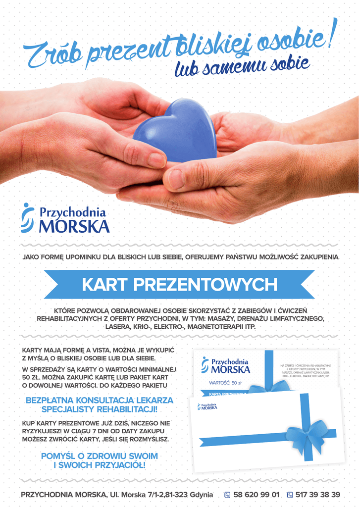 e ! i b o s o j e i k s i l b t n e z e r p b ó r Z lub samemu sobie JAKO FORMĘ UPOMINKU DLA BLISKICH LUB SIEBIE, OFERUJEMY PAŃSTWU MOŻLIWOŚĆ ZAKUPIENIA KART PREZENTOWYCH KTÓRE POZWOLĄ OBDAROWANEJ OSOBIE SKORZYSTAĆ Z ZABIEGÓW I ĆWICZEŃ REHABILITACYJNYCH Z OFERTY PRZYCHODNI, W TYM: MASAŻY, DRENAŻU LIMFATYCZNEGO, LASERA, KRIO-, ELEKTRO-, MAGNETOTERAPII ITP. KARTY MAJĄ FORMĘ A VISTA, MOŻNA JE WYKUPIĆ Z MYŚLĄ O BLISKIEJ OSOBIE LUB DLA SIEBIE. W SPRZEDAŻY SĄ KARTY O WARTOŚCI MINIMALNEJ 50 ZŁ. MOŻNA ZAKUPIĆ KARTĘ LUB PAKIET KART O DOWOLNEJ WARTOŚCI. DO KAŻDEGO PAKIETU BEZPŁATNA KONSULTACJA LEKARZA SPECJALISTY REHABILITACJI! KARTY MOŻNA ŁĄCZYĆ W ZESTAWY O WYŻSZEJ SUMIE DATA WAŻNOŚCI KARTY: ____________________ NA OKAZICIELA NR KARTY: 004745818028 KUP KARTY PREZENTOWE JUŻ DZIŚ, NICZEGO NIE RYZYKUJESZ! W CIĄGU 7 DNI OD DATY ZAKUPU MOŻESZ ZWRÓCIĆ KARTY, JEŚLI SIĘ ROZMYŚLISZ. POMYŚL O ZDROWIU SWOIM I SWOICH PRZYJACIÓŁ! PRZYCHODNIA MORSKA, Ul. Morska 7/1-2,81-323 Gdynia 58 620 99 01 517 39 38 39 KARTY PREZENTOWE ZABIEGI I/LUB ĆWICZENIA REHABILITACYJNE Z BEZPŁATNĄ KONSULTACJĄ LEKARSKĄ Karta prezentowa to znakomity pomysł na prezent świąteczny lub prezent z innej okazji dla bliskiej Ci osoby. Karta taka pozwala na wykupienie zabiegów i/lub ćwiczeń rehabilitacyjnych bez konieczności umawiania pacjenta nakonkretny termin. Jeżeli pragniesz zapewnić i sfinansować opiekę leczniczą lub rehabilitacyjną bliskiej osobie, taka karta prezentowa jest idealnym rozwiązaniem! Cena karty obejmuje koszt zabiegów i/lub ćwiczeń będących w ofercie przychodni. Każdy korzystający z zestawu kart prezentowych, otrzymuje bezpłatnie konsultację lekarską specjalisty rehabilitacji, który kwalifikuje do zabiegów lub ćwiczeń rehabilitacyjnych zoceną wskazań iprzeciwwskazań do ich wykonania. Możliwy jest zakup zestawu kart na dowolną kwotę. JAK WYKUPIĆ KARTĘ PREZENTOWĄ JAK SKORZYSTAĆ Z KARTY 1. Telefonicznie, mailowo lub osobiście umówić się na pierwszą wizytę podając nr karty prezentowej. Osobiście – odwiedzając przychodnię. Telefonicznie pod nr telefonu: 58 620-99-01 albo 517-39-38-39 lub via e-mail [email protected]. 2. Na pierwszą wizytę korzystający z karty powinien zgłosić się osobiście wraz z dowodem tożsamości. Korzystając z tej formy zakupu, można: - opłacić kartę i odebrać bezpośrednio w przychodni (płatność gotówką lub kartą płatniczą); - opłacić kartę przelewem i po zaksięgowaniu płatności na koncie przychodni otrzymać ją listem lub odebrać osobiście; [email protected] www.przychodniamorska.pl Potwierdzenie zakupu stanowi paragon lub faktura wystawiana przez przychodnię na wskazaną przez Kupującego osobę lub firmę. PROSIMY O ZAPOZNANIE SIĘ Z POWYŻSZYMI ZASADAMI I PONIŻSZYM REGULAMINEM REGULAMIN OKREŚLAJĄCY ZASADY ZAKUPU I KORZYSTANIA Z KART PREZENTOWYCH PRZYCHODNI MORSKIEJ 1. Karta upominkowa jest kartą na okaziciela. 2. Z jednej karty lub zestawu kart może korzystać tylko jedna osoba (na zabiegi i ćwiczenia nabyte za pomocą jednego zestawu kart może zgłosić się wyłącznie jego pierwotny okaziciel). 3. Karta jest podstawą udzielenia świadczenia leczniczego/usługi i podlega zwrotowi przychodni w momencie zgłoszenia się na pierwszą wizytę. 4. Karta upominkowa upoważnia jedynie do wykonania zabiegów znajdujących się w ofercie przychodni. 5. Okres ważności karty wynosi 4 miesiące i jest zapisany na karcie. Na życzenie Kupującego kartę, okres ważności karty dłuższy niż 4 miesiące jest ustalony przy jej zakupie i zapisany na karcie. 6. Aby karta nie straciła ważności, pierwsza wizyta musi odbyć się najpóźniej w ostatnim dniu ważności karty. 7. Od dnia pierwszej wizyty wszystkie zabiegi i/lub ćwiczenia opisane w karcie muszą odbyć się według uzgodnionego harmonogramu ale nie dłużej niż w ciągu 3 tygodni. Jeżeli, z winy korzystającego z karty, nie odbędą się w uzgodnionym terminie w okresie do 3 tygodni, niewykorzystane zabiegi/ ćwiczenia przepadają i nie podlegają późniejszemu wykonaniu lub zwrotowi ich wartości. 8. Niewykorzystane karty nie podlegają zwrotowi. Możliwy jest zwrot zakupionych kart w terminie 7 dni od daty zakupu, bez podawania przyczyny. 9. Kartę można wykorzystać jedynie w Przychodni Morskiej wGdyni przy ulicy Morskiej 7/1-2. PRZYCHODNIA MORSKA, Ul. Morska 7/1-2,81-323 Gdynia 58 620 99 01 517 39 38 39