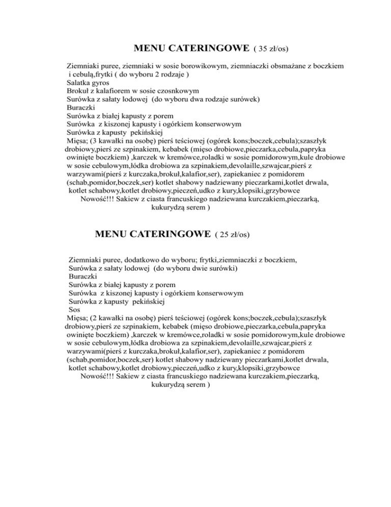 MENU CATERINGOWE ( 35 zł/os) Ziemniaki puree, ziemniaki w sosie borowikowym, ziemniaczki obsmażane z boczkiem i cebulą,frytki ( do wyboru 2 rodzaje ) Salatka gyros Brokuł z kalafiorem w sosie czosnkowym Surówka z sałaty lodowej (do wyboru dwa rodzaje surówek) Buraczki Surówka z białej kapusty z porem Surówka z kiszonej kapusty i ogórkiem konserwowym Surówka z kapusty pekińskiej Mięsa; (3 kawałki na osobę) pierś teściowej (ogórek kons;boczek,cebula);szaszłyk drobiowy,pierś ze szpinakiem, kebabek (mięso drobiowe,pieczarka,cebula,papryka owinięte boczkiem) ,karczek w kremówce,roladki w sosie pomidorowym,kule drobiowe w sosie cebulowym,łódka drobiowa za szpinakiem,devolaille,szwajcar,pierś z warzywami(pierś z kurczaka,brokuł,kalafior,ser), zapiekaniec z pomidorem (schab,pomidor,boczek,ser) kotlet shabowy nadziewany pieczarkami,kotlet drwala, kotlet schabowy,kotlet drobiowy,pieczeń,udko z kury,klopsiki,grzybowce Nowość!!! Sakiew z ciasta francuskiego nadziewana kurczakiem,pieczarką, kukurydzą serem ) MENU CATERINGOWE ( 25 zł/os) Ziemniaki puree, dodatkowo do wyboru; frytki,ziemniaczki z boczkiem, Surówka z sałaty lodowej (do wyboru dwie surówki) Buraczki Surówka z białej kapusty z porem Surówka z kiszonej kapusty i ogórkiem konserwowym Surówka z kapusty pekińskiej Sos Mięsa; (2 kawałki na osobę) pierś teściowej (ogórek kons;boczek,cebula);szaszłyk drobiowy,pierś ze szpinakiem, kebabek (mięso drobiowe,pieczarka,cebula,papryka owinięte boczkiem) ,karczek w kremówce,roladki w sosie pomidorowym,kule drobiowe w sosie cebulowym,łódka drobiowa za szpinakiem,devolaille,szwajcar,pierś z warzywami(pierś z kurczaka,brokuł,kalafior,ser), zapiekaniec z pomidorem (schab,pomidor,boczek,ser) kotlet shabowy nadziewany pieczarkami,kotlet drwala, kotlet schabowy,kotlet drobiowy,pieczeń,udko z kury,klopsiki,grzybowce Nowość!!! Sakiew z ciasta francuskiego nadziewana kurczakiem,pieczarką, kukurydzą serem )