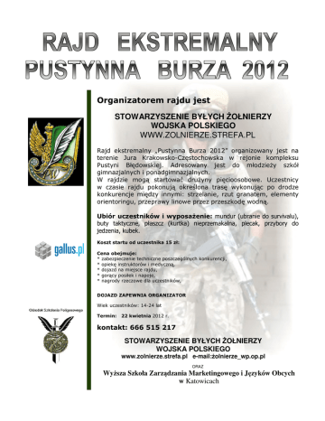 Organizatorem rajdu jest STOWARZYSZENIE BYŁYCH ŻOŁNIERZY WOJSKA POLSKIEGO WWW.ZOLNIERZE.STREFA.PL Rajd ekstremalny „Pustynna Burza 2012” organizowany jest na terenie Jura Krakowsko-Częstochowska w rejonie kompleksu Pustyni Błędowskiej. Adresowany jest do młodzieży szkół gimnazjalnych i ponadgimnazjalnych. W rajdzie mogą startować drużyny pięcioosobowe. Uczestnicy w czasie rajdu pokonują określona trasę wykonując po drodze konkurencje między innymi: strzelanie, rzut granatem, elementy orientoringu, przeprawy linowe przez przeszkodę wodną. Ubiór uczestników i wyposaŜenie: mundur (ubranie do survivalu), buty taktyczne, płaszcz (kurtka) nieprzemakalna, plecak, przybory do jedzenia, kubek. Koszt startu od uczestnika 15 zł: Cena obejmuje: * zabezpieczenie techniczne poszczególnych konkurencji, * opiekę instruktorów i medyczną, * dojazd na miejsce rajdu, * gorący posiłek i napoje, * nagrody rzeczowe dla uczestników, DOJAZD ZAPEWNIA ORGANIZATOR Wiek uczestników: 14-24 lat Termin: 22 kwietnia 2012 r. kontakt: 666 515 217 STOWARZYSZENIE BYŁYCH ŻOŁNIERZY WOJSKA POLSKIEGO www.zolnierze.strefa.pl e-mail:żolnierze_wp.op.pl ORAZ Wyższa Szkoła Zarządzania Marketingowego i Języków Obcych w Katowicach