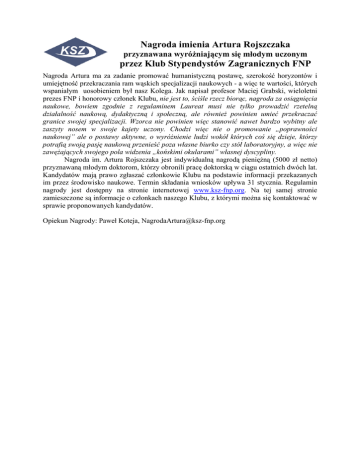 Nagroda imienia Artura Rojszczaka przyznawana wyróżniającym się młodym uczonym przez Klub Stypendystów Zagranicznych FNP Nagroda Artura ma za zadanie promować humanistyczną postawę, szerokość horyzontów i umiejętność przekraczania ram wąskich specjalizacji naukowych - a więc te wartości, których wspaniałym uosobieniem był nasz Kolega. Jak napisał profesor Maciej Grabski, wieloletni prezes FNP i honorowy członek Klubu, nie jest to, ściśle rzecz biorąc, nagroda za osiągnięcia naukowe, bowiem zgodnie z regulaminem Laureat musi nie tylko prowadzić rzetelną działalność naukową, dydaktyczną i społeczną, ale również powinien umieć przekraczać granice swojej specjalizacji. Wzorca nie powinien więc stanowić nawet bardzo wybitny ale zaszyty nosem w swoje kajety uczony. Chodzi więc nie o promowanie „poprawności naukowej” ale o postawy aktywne, o wyróżnienie ludzi wokół których coś się dzieje, którzy potrafią swoją pasję naukową przenieść poza własne biurko czy stół laboratoryjny, a więc nie zawężających swojego pola widzenia „końskimi okularami” własnej dyscypliny. Nagroda im. Artura Rojszczaka jest indywidualną nagrodą pieniężną (5000 zł netto) przyznawaną młodym doktorom, którzy obronili pracę doktorską w ciągu ostatnich dwóch lat. Kandydatów mają prawo zgłaszać członkowie Klubu na podstawie informacji przekazanych im przez środowisko naukowe. Termin składania wniosków upływa 31 stycznia. Regulamin nagrody jest dostępny na stronie internetowej www.ksz-fnp.org. Na tej samej stronie zamieszczone są informacje o członkach naszego Klubu, z którymi można się kontaktować w sprawie proponowanych kandydatów. Opiekun Nagrody: Paweł Koteja, [email protected]