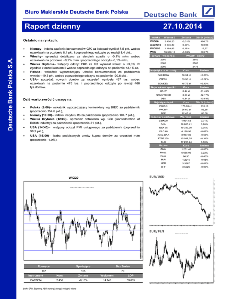 Biuro Maklerskie Deutsche Bank Polska Raport dzienny 27.10.2014 Wartość Zmiana Obrót (mln zł) WIG20 2 426,20 -0,31% 496,75 mWIG40 3 535,30 0,59% 108,98 WIG250 1 189,96 0,18% 18,27 53 320,13 -0,03% 670,76 Indeks Ostatnio na rynkach: Deutsche Bank Polska S.A. Niemcy– indeks zaufania konsumentów GfK za listopad wyniósł 8,5 pkt. wobec oczekiwań na poziomie 8,1 pkt. i poprzedniego odczytu po rewizji 8,4 pkt., Włochy– sprzedaż detaliczna za sierpień spadła o -0,1% m/m wobec oczekiwań na poziomie +0,2% m/m i poprzedniego odczytu -0,1% m/m, Wielka Brytania– wstępny odczyt PKB za Q3 wykazał wzrost o +3,0% r/r zgodnie z oczekiwaniami i wobec poprzedniego odczytu na poziomie +3,1% r/r, Polska– wskaźnik wyprzedzający ufności konsumenckiej za październik wyniósł -19,3 pkt. wobec poprzedniego odczytu na poziomie -20,6 pkt., USA– sprzedaż nowych domów za wrzesień wyniosła 467 tys. wobec oczekiwań na poziomie 475 tys. i poprzedniego odczytu po rewizji 466 tys.domów. WIG WIG20 - wsparcia WIG20 - opory 2350 2552 2300 2505 2200 Kurs Zmiana RAINBOW 16,34 zł +6.80% ZEPAK 33,50 zł +6.52% DOMDEV 45,75 zł +6.40% Największe spadki Kurs Zmiana GANT 0,44 zł -21.43% RANKPROGR 3,03 zł -12.17% DSS 0,34 zł -10.53% Najaktywniejsi Kurs Obrót (mln zł) PEKAO 175,00 zł 110,15 PKOBP 36,60 zł 83,58 PGE 22,47 zł 80,08 Indeksy światowe Wartość Zmiana S&P500 1 964,58 0,71% DJIA 16 805,41 0,76% IBEX 35 10 339,30 0,05% CAC 40 4 128,90 -0,69% Xetra DAX 8 987,80 -0,66% FTSE 250 15 089,55 -0,31% BUX 17 298,24 0,00% Nazwa Kurs Zmiana -0,08% Dziś warto zwrócić uwagę na: Polska (9:00)– wskaźnik wyprzedzający koniunktury wg BIEC za październik (poprzednio 154,6 pkt.), Niemcy (10:00)– indeks Instytutu Ifo za październik (poprzednio 104,7 pkt.), Wielka Brytania (12:00)– sprzedaż detaliczna wg. CBI (Confederation of British Industry) za październik (poprzednio 31 pkt.), USA (14:45)– wstępny odczyt PMI usługowego za październik (poprzednio 58,9 pkt.), USA (15:00)– liczba podpisanych umów kupna domów za wrzesień m/m (poprzednio -1,0%). a 2475 Największe wzrosty Złoto 1 231,40 Miedź 6 685,00 0,22% Ropa 86,30 -0,45% EUR 4,2245 -0,08% USD 3,3387 -0,01% CHF 3,5026 -0,06% EUR/USD WIG20 EURUSD (1.28173, 1.28441, 1. 27052, 1.28032, -0.00140) 1.405 1.400 1.395 1.390 1.385 W IG20 (2,434.43, 2,446.49, 2, 421. 75, 2,426.20, -7.64014) 21 28 4 12 18 N ov ember 25 2 9 16 D ecember 23 7 13 2014 20 27 3 10 February 17 24 3 10 March 17 24 31 7 April 14 22 28 5 May 12 19 26 2 9 June 2655 2650 2645 2640 2635 2630 2625 2620 2615 2610 2605 2600 2595 2590 2585 2580 2575 2570 2565 2560 2555 2550 2545 2540 2535 2530 2525 2520 2515 2510 2505 2500 2495 2490 2485 2480 2475 2470 2465 2460 2455 2450 2445 2440 2435 2430 2425 2420 2415 2410 2405 2400 2395 2390 2385 2380 2375 2370 2365 2360 2355 2350 2345 2340 2335 2330 2325 2320 2315 2310 2305 2300 2295 2290 2285 2280 2275 2270 2265 2260 2255 2250 16 23 30 7 July 14 21 28 4 11 August 18 25 1 8 15 September 22 29 6 13 October 20 27 1.380 1.375 1.370 1.365 1.360 1.355 1.350 1.345 1.340 1.335 1.330 1.325 1.320 1.315 1.310 1.305 1.300 1.295 1.290 1.285 1.280 1.275 1.270 1.265 1.260 1.255 1.250 1.245 1.240 30 6 2014 13 20 27 3 10 February 17 24 3 10 March 17 24 31 7 April 14 21 28 5 May 12 19 26 2 June 9 16 23 30 7 July 14 21 28 4 11 August 18 25 1 8 September 15 22 29 6 October 13 20 27 EUR/PLN EURPLN (4.21730, 4. 23710, 4.20470, 4.22740, +0.00980) 4.275 4.270 4.265 4.260 4.255 4.250 4.245 4.240 4.235 4.230 4.225 4.220 4.215 4.210 4.205 4.200 4.195 4.190 4.185 4.180 4.175 4.170 4.165 3 10 N ov ember 4.160 4.155 4.150 4.145 Rosnące Spadające Bez Zmian 167 165 79 4.140 4.135 4.130 4.125 4.120 4.115 4.110 Instrument Kurs Zmiana Wolumen LOP FW20Z14 2 436 -0,16% 14 145 59 605 4.105 4.100 4.095 4.090 4.085 4.080 4.075 30 6 2014 źródło: GPW, Bloomberg, NBP, money.pl, stooq.pl, wyliczenia własne 13 20 27 3 10 February 17 24 3 10 March 17 24 31 7 April 14 21 28 5 May 12 19 26 2 June 9 16 23 30 7 July 14 21 28 4 11 August 18 25 1 8 September 15 22 29 6 October 13 20 27 Deutsche Bank Polska S.A. „Dzień Energetyka” Doniesienia z unijnego szczytu w Brukseli w sprawie polityki klimatycznej zdominowały początek piątkowego handlu na warszawskiej giełdzie. Darmowe uprawnienia dla polskiej energetyki na emisję dwutlenku węgla do 2030 roku i dodatkowe środki na modernizację sektora energetycznego dodały paliwa do wzrostów spółkom z tej branży. Akcje PGE zyskały ponad 3,6%, o 1,2% urosła Energa, natomiast Tauron wzrósł jedynie o 0,2%, mimo bardzo dobrego początku. Najwyższe poziomy w dotychczasowej giełdowej historii zanotowały walory ZE PAK, zamykając dzień zwyżką o 6,5%. Piątkowej sesji do udanych nie zaliczą natomiast akcjonariusze Pekao, które spadło o -2,5%, słabo wypadły także JSW i Lotos zniżkując nieco ponad -2%. Traciły poza tym PZU i PKN Orlen, przez co indeks WIG20 zakończył sesję spadkiem o -0,3%. Lepiej poradziły sobie jednakże wskaźniki średnich i mniejszych spółek: WIG50 wzrósł o 0,7%, a WIG250 zyskał prawie 0,2%. Dobrze przyjęte zostały wyniki Dom Development, którego dokonania w 3. kwartale przebiły oczekiwania analityków (zysk netto wyższy o 50% od konsensusu). Akcje dewelopera wzrosły o 6,4%. Niemal 4% zyskały walory Getin Noble Banku odreagowując wcześniejsze spadki. S&P500 2080 2070 2060 2050 2040 2030 2020 2010 2000 1990 1980 1970 1960 1950 1940 1930 1920 1910 1900 1890 1880 1870 1860 1850 1840 1830 1820 1810 1800 1790 1780 1770 1760 1750 1740 1730 1720 1710 1700 1690 1680 1670 1660 1650 1640 1630 1620 1610 1600 1590 1580 1570 1560 1550 1540 1530 1520 1510 1500 1490 1480 1470 1460 1450 1440 1430 1420 1410 1400 1390 1380 1370 1360 1350 1340 1330 1320 1310 1300 1290 SP500 (1,855.95, 1,876.01, 1,835.02, 1,862.76, +0.27002) 2012 December 2013 February March April May June July August September October Nov ember December 2014 February March April May June July August September Octob