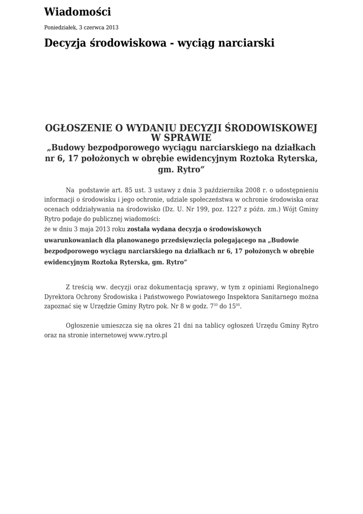 Wiadomości Poniedziałek, 3 czerwca 2013 Decyzja środowiskowa - wyciąg narciarski OGŁOSZENIE O WYDANIU DECYZJI ŚRODOWISKOWEJ W SPRAWIE „Budowy bezpodporowego wyciągu narciarskiego na działkach nr 6, 17 położonych w obrębie ewidencyjnym Roztoka Ryterska, gm. Rytro” Na podstawie art. 85 ust. 3 ustawy z dnia 3 października 2008 r. o udostępnieniu informacji o środowisku i jego ochronie, udziale społeczeństwa w ochronie środowiska oraz ocenach oddziaływania na środowisko (Dz. U. Nr 199, poz. 1227 z późn. zm.) Wójt Gminy Rytro podaje do publicznej wiadomości: że w dniu 3 maja 2013 roku została wydana decyzja o środowiskowych uwarunkowaniach dla planowanego przedsięwzięcia polegającego na „Budowie bezpodporowego wyciągu narciarskiego na działkach nr 6, 17 położonych w obrębie ewidencyjnym Roztoka Ryterska, gm. Rytro” Z treścią ww. decyzji oraz dokumentacją sprawy, w tym z opiniami Regionalnego Dyrektora Ochrony Środowiska i Państwowego Powiatowego Inspektora Sanitarnego można zapoznać się w Urzędzie Gminy Rytro pok. Nr 8 w godz. 730 do 1500. Ogłoszenie umieszcza się na okres 21 dni na tablicy ogłoszeń Urzędu Gminy Rytro oraz na stronie internetowej www.rytro.pl Rytro, dn. 3 maja 2013 r.. GKŚ.6220.15.2013 DECYZJA Na podstawie art. 71 ust 2 pkt 2, art. 75 ust 1 pkt 4, art. 84 oraz art. 85 ust 1 ustawy z dnia 3 października 2008 r. o udostępnieniu informacji o środowisku i jego ochronie, udziale społeczeństwa w ochronie środowiska oraz o ocenach oddziaływania na środowisko (Dz. U. Nr 199, poz. 1227), a także § 3 ust. 1 pkt. 49 rozporządzenia Rady Ministrów z dnia 9 listopada 2010 r. w sprawie przedsięwzięć mogących znacząco oddziaływać na środowisko (Dz. U. Nr 213 poz. 1397) oraz art. 104 i art. 107 ustawy z dnia 14 czerwca 1960 r. Kodeks postępowania administracyjnego (Dz. U. z 2013 r. poz. 267.) po rozpatrzeniu wniosku złożonego przez RYTER-SKI S.C. B. Czerwiński, B. Handzel, 33-340 Rytro 302. stwierdzam : brak potrzeby prowadzenia oceny oddziaływania na środowisko przedsięwzięcia polegającego na: „Budowie bezpodporowego wyciągu narciarskiego na działkach nr 6, 17 położonych w obrębie ewidencyjnym Roztoka Ryterska, gm. Rytro” Uzasadnienie RYTER-SKI S.C. B. Czerwiński, B. Handzel, 33-340 Rytro 302. złożyli wniosek o wydanie decyzji o środowiskowych uwarunkowaniach zgody na realizację przedsięwzięcia polegającego na „Budowie bezpodporowego wyciągu narciarskiego na działkach nr 6, 17 położonych w obrębie ewidencyjnym Roztoka Ryterska, gm. Rytro” Zgodnie z § 3 ust. 1 pkt. 49 rozporządzenia Rady Ministrów z dnia 9 listopada 2010 r. w sprawie określenia rodzajów przedsięwzięć mogących znacząco oddziaływać na środowisko (Dz. U. z 2010 r. Nr 213 poz. 1397 z późn. zm.) planowana inwestycja zaliczana jest do grupy przedsięwzięć, dla których sporządzenie raportu o oddziaływaniu na środowisko może być wymagane. Na podstawie art. 64 ust. 1 ustawy z dnia 3 października 2008 r. o udostępnieniu informacji i jego ochronie, udziale społeczeństwa w ochronie środowiska oraz ocenach oddziaływania na środowisko (Dz. U. Nr 199, poz. 1227) Wójt Gminy Rytro zwrócił się do Państwowego Powiatowego Inspektora Sanitarnego w Nowym Sączu oraz Regionalnego Dyrektora Ochrony Środowiska Wydział Spraw Terenowych w Starym Sączu z prośbą o opinię dotyczącą konieczności przeprowadzenia oceny oddziaływania na środowisko ww. inwestycji oraz ewentualnego zakresu raportu. Państwowy Powiatowy Inspektor Sanitarny wydał opinię znak PSE-NNZ-420-110/13 z dnia 16 maja 2013 r. stwierdzającą brak potrzeby przeprowadzenia oceny oddziaływania na środowisko przedsięwzięcia polegającego na „Budowie bezpodporowego wyciągu narciarskiego na działkach nr 6, 17 położonych w obrębie ewidencyjnym Roztoka Ryterska, gm. Rytro” Regionalny Dyrektor Ochrony Środowiska postanowieniem znak ST II.4240.67.2013.KA z dnia 13 maja 2013 r. również stwierdził o braku konieczności przeprowadzenia oceny oddziaływania na środowisko ww. przedsięwzięcia. Biorąc pod uwagę charakterystykę przedsięwzięcia oraz ww. Wójt Gminy Rytro wydał postanowienie znak GKŚ.6220.15.2013 z dnia 21 maja 2013 r. o odstąpieniu od obowiązku przeprowadzenia oceny oddziaływania na środowisko ww. przedsięwzięcia. W ramach postępowania uwzględniono łączne uwarunkowania wymienione w art. 63 ust. 1 ustawy z dnia 3 października 2008 r. o udostępnieniu informacji o środowisku i jego ochronie, udziale społeczeństwa w ochronie środowiska oraz o ocenach oddziaływania na środowisko (Dz. U. Nr 199, poz. 1227), 1. RODZAJ, SKALA I USYTUOWANIE PRZEDSIĘWZIĘCIA Przedmiotem przedsięwzięcia jest budowa bezpodporowego wyciągu narciarskiego typu BJ-300/II o planowanej długości około 120m i przepustowości około 750 osób/godz. Inwestycja realizowana będzie na terenie istniejącego ośrodka narciarskiego i stanowi uzupełnienie jego oferty rekreacyjnej. Inwestorem zamierzonego przedsięwzięcia jest: RYTER-SKI S.C. B. Czerwiński, B. Handzel, 33-340 Rytro 302. Nazwa przedsięwzięcia: „Budowa bezpodporowego wyciągu narciarskiego na działkach nr 6, 17 położonych w obrębie ewidencyjnym Roztoka Ryterska, gm. Rytro” 1.1. RODZAJ PRZEDSIĘWZIĘCIA Omawiane przedsięwzięcie w świetle zapisów rozporządzenia Rady Ministrów z dnia 9 listopada 2010 r. w sprawie przedsięwzięć mogących znacząco oddziaływać na środowisko (Dz. U. Nr 213, poz. 1397) zalicza się do przedsięwzięć mogących potencjalnie znacząco oddziaływać na środowisko i wymienione jest w § 3 ust. 1 pkt 49 (trasy narciarskie, tory bobslejowe, wyciągi narciarskie, w tym wyciągi do narciarstwa wodnego, skocznie narciarskie, oraz urządzenia im towarzyszące). Planowana inwestycja jest zakwalifikowana do przedsięwzięć, dla których obowiązek sporządzenia raportu może być wymagany. 1.2. USYTUOWANIE PRZEDSIĘWZIĘC
