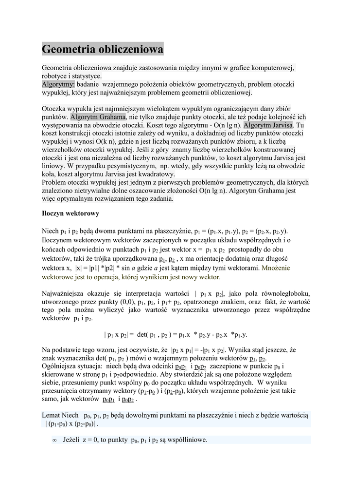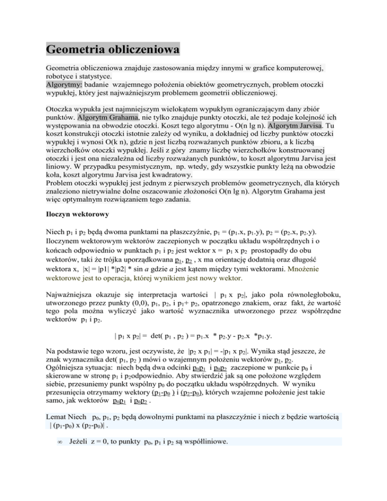Geometria obliczeniowa Geometria obliczeniowa znajduje zastosowania między innymi w grafice komputerowej, robotyce i statystyce. Algorytmy: badanie wzajemnego położenia obiektów geometrycznych, problem otoczki wypukłej, który jest najważniejszym problemem geometrii obliczeniowej. Otoczka wypukła jest najmniejszym wielokątem wypukłym ograniczającym dany zbiór punktów. Algorytm Grahama, nie tylko znajduje punkty otoczki, ale też podaje kolejność ich występowania na obwodzie otoczki. Koszt tego algorytmu - O(n lg n). Algorytm Jarvisa. Tu koszt konstrukcji otoczki istotnie zależy od wyniku, a dokładniej od liczby punktów otoczki wypukłej i wynosi O(k n), gdzie n jest liczbą rozważanych punktów zbioru, a k liczbą wierzchołków otoczki wypukłej. Jeśli z góry znamy liczbę wierzchołków konstruowanej otoczki i jest ona niezależna od liczby rozważanych punktów, to koszt algorytmu Jarvisa jest liniowy. W przypadku pesymistycznym, np. wtedy, gdy wszystkie punkty leżą na obwodzie koła, koszt algorytmu Jarvisa jest kwadratowy. Problem otoczki wypukłej jest jednym z pierwszych problemów geometrycznych, dla których znaleziono nietrywialne dolne oszacowanie złożoności O(n lg n). Algorytm Grahama jest więc optymalnym rozwiązaniem tego zadania. Iloczyn wektorowy Niech p1 i p2 będą dwoma punktami na płaszczyźnie, p1 = (p1.x, p1.y), p2 = (p2.x, p2.y). Iloczynem wektorowym wektorów zaczepionych w początku układu współrzędnych i o końcach odpowiednio w punktach p1 i p2 jest wektor x = p1 x p2 prostopadły do obu wektorów, taki że trójka uporządkowana p1, p2 , x ma orientację dodatnią oraz długość wektora x, |x| = |p1| *|p2| * sin a gdzie a jest kątem między tymi wektorami. Mnożenie wektorowe jest to operacja, której wynikiem jest nowy wektor. Najważniejsza okazuje się interpretacja wartości | p1 x p2|, jako pola równoległoboku, utworzonego przez punkty (0,0), p1, p2, i p1+ p2, opatrzonego znakiem, oraz fakt, że wartość tego pola można wyliczyć jako wartość wyznacznika utworzonego przez współrzędne wektorów p1 i p2. | p1 x p2| = det( p1 , p2 ) = p1.x * p2.y - p2.x *p1.y. Na podstawie tego wzoru, jest oczywiste, że |p2 x p1| = -|p1 x p2|. Wynika stąd jeszcze, że znak wyznacznika det( p1, p2 ) mówi o wzajemnym położeniu wektorów p1, p2. Ogólniejsza sytuacja: niech będą dwa odcinki p0p1 i p0p2 zaczepione w punkcie p0 i skierowane w stronę p1 i p2odpowiednio. Aby stwierdzić jak są one położone względem siebie, przesuniemy punkt wspólny p0 do początku układu współrzędnych. W wyniku przesunięcia otrzymamy wektory (p1-p0 ) i (p2-p0), których wzajemne położenie jest takie samo, jak wektorów p0p1 i p0p2 . Lemat Niech p0, p1, p2 będą dowolnymi punktami na płaszczyźnie i niech z będzie wartością | (p1-p0) x (p2-p0)| . • Jeżeli z = 0, to punkty p0, p1 i p2 są współliniowe. • • Jeżeli z < 0, to punkt p2 leży po prawej stronie prostej wyznaczonej przez wektor p0p1. Jeżeli z > 0, to punkt p2 leży po lewej stronie prostej wyznaczonej przez wektor p0p1. Z lematu wynika, że jeśli | (p1-p0) x (p2-p0)| >0, to p2 jest położone względem p1 przeciwnie do ruchu wskazówek zegara, lub inaczej, przesuwając się wzdłuż wektora od punktu p0 do p1, punkt p2 mamy zawsze po lewej ręce p2 leży w kierunku zgodnym z ruchem wskazówek zegara względem p1. http://informatyka.wroc.pl/node/455?page=0,0 http://www-users.mat.umk.pl/~stencel/acm/algorytmika_praktyczna.pdf http://edu.pjwstk.edu.pl/wyklady/asd/scb/asd13/index13.html http://informatykaplus.edu.pl/upload/list/czytelnia/geometra_obliczeniowa.pdf http://www.algorytm.org/geometria-obliczeniowa/ http://was.zaa.mimuw.edu.pl/?q=node/15 http://www.asdpb.republika.pl/asdwyk15.pdf http://www.asdpb.republika.pl/wyk38.pdf Zadania Zadanie 1 Dany jest zbiór n prostokątów na płaszczyźnie (o bokach niekoniecznie równoległych do osi). Należy znaleźć obwód części wspólnej tych prostokątów, lub stwierdzić że jest ona pusta. Zadanie 2 Dany jest zbiór n prostokątów na płaszczyźnie o bokach równoległych do osi. Pionowe boki wszystkich prostokątów mają długość 1. Należy znaleźć pole sumy tych prostokątów. Zadanie 3 Wielokąt nazywamy monotonicznym, gdy istnieje taka prosta k (kierunek monotoniczności), że dowolna prosta prostopadła do k przecina wielokąt w co najwyżej dwóch punktach. Przekątną wielokąta nazywamy odcinek całkowicie zawarty w wielokącie, łączący jego dwa wierzchołki. Wielokąt reprezentowany jest przez ciąg kolejnych wierzchołków. Zaproponuj algorytm podziału wielokąta monotonicznego nie przecinającymi się przekątnymi na maksymalnie dużo trójkątów, gdy znany jest jego kierunek monotoniczności. Zadanie 4 Dany jest zbiór n odcinków na płaszczyźnie. Zaproponuj efektywny algorytm sprawdzający, czy tworzą one brzeg dokładnie jednego wielokąta prostego (bez przecięć krawędzi i dziur). Zadanie 5 Dany jest zbiór n odcinków na płaszczyźnie. W jednym punkcie płaszczyzny mogą spotykać się tylko dwa odcinki i jeśli tak jest, to spotykają się one tylko w końcach. Sprawdź, czy odcinki tworzą łamaną zamkniętą i jeśli tak jest, oblicz pole wielokąta ograniczonego tą łamaną. Zadanie 6 Dany jest zbiór S zawierający n trójkątów na płaszczyźnie. Boki dowolnych dwóch trójkątów z S są rozłączne (ale może się zdarzyć, że jeden trojkąt zawiera się w drugim). Znajdź wszystkie trójkąty z S, które nie zawierają się w innym trójkącie z S Zadanie 7 Znajdź wszystkie przecięcia danych n okręgów w czasie O((n+k) log(n+k)), gdzie k to liczba przecięć. Można założyć, że w żadnym punkcie nie przetną się więcej niż dwa okręgi.