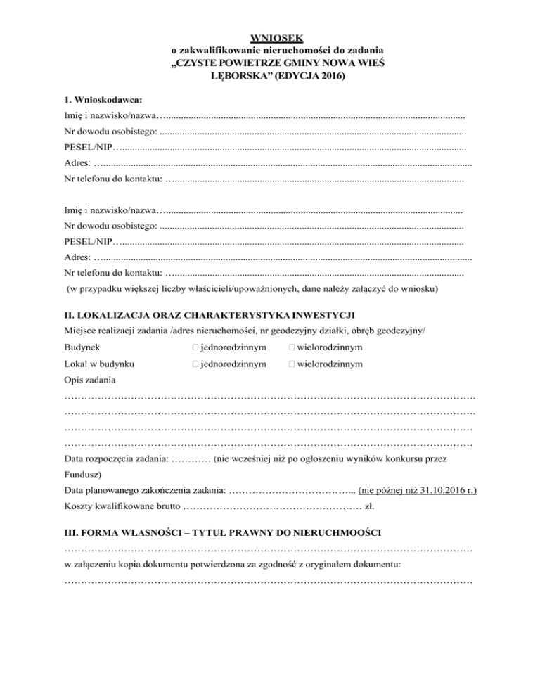 WNIOSEK o zakwalifikowanie nieruchomości do zadania „CZYSTE POWIETRZE GMINY NOWA WIEŚ LĘBORSKA” (EDYCJA 2016) 1. Wnioskodawca: Imię i nazwisko/nazwa…........................................................................................................................ Nr dowodu osobistego: ........................................................................................................................... PESEL/NIP….......................................................................................................................................... Adres: ….................................................................................................................................................... Nr telefonu do kontaktu: ….................................................................................................................... Imię i nazwisko/nazwa…....................................................................................................................... Nr dowodu osobistego: .......................................................................................................................... PESEL/NIP…......................................................................................................................................... Adres: ….................................................................................................................................................... Nr telefonu do kontaktu: ….................................................................................................................... (w przypadku większej liczby właścicieli/upoważnionych, dane należy załączyć do wniosku) II. LOKALIZACJA ORAZ CHARAKTERYSTYKA INWESTYCJI Miejsce realizacji zadania /adres nieruchomości, nr geodezyjny działki, obręb geodezyjny/ Budynek jednorodzinnym wielorodzinnym Lokal w budynku jednorodzinnym wielorodzinnym Opis zadania ……………………………………………………………………………………………………………. ……………………………………………………………………………………………………………. …………………………………………………………………………………………………………… …………………………………………………………………………………………………………… Data rozpoczęcia zadania: ………… (nie wcześniej niż po ogłoszeniu wyników konkursu przez Fundusz) Data planowanego zakończenia zadania: ………………………………... (nie późnej niż 31.10.2016 r.) Koszty kwalifikowane brutto ……………………………………………… zł. III. FORMA WŁASNOŚCI – TYTUŁ PRAWNY DO NIERUCHMOOŚCI …………………………………………………………………………………………………………… w załączeniu kopia dokumentu potwierdzona za zgodność z oryginałem dokumentu: …………………………………………………………………………………………………………… VI. ZAKRES PLANOWANYCH PRAC OBJĘTYCH WNIOSKIEM: w przypadku, gdy zadanie dotyczyć będzie likwidacji kotłów/pieców opalanych węglem, koksem i zastąpieniu ich: kotłami opalanymi gazem, olejem opałowym lub biomasą, źródłami ciepła wykorzystującymi odnawialne źródła energii (kolektorami słonecznymi lub pompami ciepła) należy wypełnić poniższy punkt A. w przypadku, gdy zadanie dotyczyć będzie ograniczenia zużycia opału w kotłach zasilanych węglem lub koksem poprzez instalację kolektorów słonecznych lub pomp ciepła na potrzeby wytwarzania c.w.u. (bez likwidacji źródła węglowego) - należy wypełnić poniższy punkt B. A W ramach zadania planuję likwidację: TAK kotła opalanego: węglem lub koksem NIE w ilości. …..., znajdującego się w: ……………………………………………… moc dotychczasowa kotła w kW: ……………………………………………… pieca kaflowego: opalanego węglem lub koksem: TAK NIE w ilości……, znajdującego się w: ………………………………………………… moc dotychczasowa pieca w kW: ………………………………………………… Ilość zużywanego paliwa (węgla/koksu) rocznie w tonach: ……………………………. i zastąpienie go (właściwe zakreślić): kotłem opalanym gazem kotłem opalanym olejem opałowym kotłem opalanym biomasą pompą ciepła kolektorami słonecznymi (w zależności o wyborze nowego źródła ciepła, poniżej wypełnić właściwe:) Rocznie będę zużywał gazu/oleju/drewna/słomy*: ….… (gaz w m3/rok, olej/drewno/słoma w tonach/rok) Ilość kolektorów słonecznych, które będę musiał zainstalować: .… szt. o łącznej powierzchni … m 2 . Moc nowej pompy ciepła w (kW): … . W ramach zadania nie planuję likwidacji źródła węglowego, ale planuję ograniczenie zużycia opalu (węgla, koksu) wykorzystywanego jako źródło ciepła w nieruchomości, o której mowa w pkt II. poprzez: instalacje kolektorów słonecznych TAK NIE instalacje pompy ciepła TAK NIE Ilość kolektorów słonecznych, które będę musiał zainstalować: .… szt. o łącznej powierzchni … m 2. Moc nowej pompy ciepła w (kW): … . Obecnie użytkuję: piec kaflowy – szt. ……. : piec etażowy – szt. ……. : TAK TAK NIE NIE znajdujący/e się w: ……………………………………………………o mocy w kW…………………… Ilość zużywanego paliwa (węgla/koksu) rocznie w tonach: ……………………………………………. 4. Informacja na temat nowego źródła ciepła: Rodzaj urządzenia/paliwa po realizacji zadania Wielkość mocy „nowego" źródła ciepła: kotła, pompy, (w kW), kolektory w m2 Planowany koszt kwalifikowany „nowego" źródła ciepła (PLN) kocioł opalany gazem kocioł opalany olejem opa