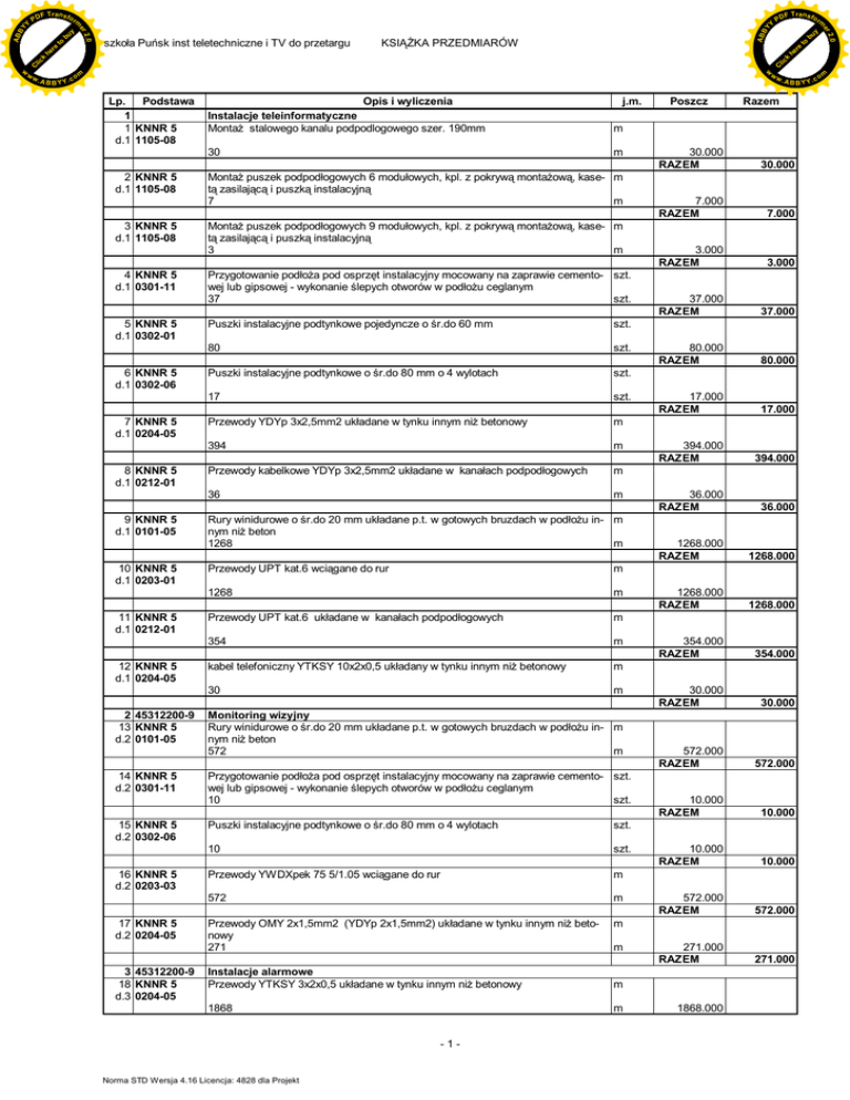 Y y bu to re KA PRZEDMIARÓW A B B Y Y.c k C lic k lic C w. om w w w w rm he KSI F T ra n sf o ABB to szko a Pu sk inst teletechniczne i TV do przetargu PD he re Y 2.0 2.0 bu y rm er Y F T ra n sf o ABB PD er Y Lp. Podstawa 1 1 KNNR 5 d.1 1105-08 2 KNNR 5 d.1 1105-08 3 KNNR 5 d.1 1105-08 4 KNNR 5 d.1 0301-11 5 KNNR 5 d.1 0302-01 6 KNNR 5 d.1 0302-06 7 KNNR 5 d.1 0204-05 8 KNNR 5 d.1 0212-01 9 KNNR 5 d.1 0101-05 10 KNNR 5 d.1 0203-01 11 KNNR 5 d.1 0212-01 12 KNNR 5 d.1 0204-05 2 45312200-9 13 KNNR 5 d.2 0101-05 14 KNNR 5 d.2 0301-11 15 KNNR 5 d.2 0302-06 16 KNNR 5 d.2 0203-03 17 KNNR 5 d.2 0204-05 3 45312200-9 18 KNNR 5 d.3 0204-05 Opis i wyliczenia Instalacje teleinformatyczne Monta stalowego kanalu podpodlogowego szer. 190mm j.m. m 30 m Monta puszek podpod ogowych 6 modu owych, kpl. z pokryw monta ow , kase- m zasilaj i puszk instalacyjn 7 m Monta puszek podpod ogowych 9 modu owych, kpl. z pokryw monta ow , kase- m zasilaj i puszk instalacyjn 3 m Przygotowanie pod a pod osprz t instalacyjny mocowany na zaprawie cemento- szt. wej lub gipsowej - wykonanie lepych otworów w pod u ceglanym 37 szt. Puszki instalacyjne podtynkowe pojedyncze o r.do 60 mm szt. 80 szt. Puszki instalacyjne podtynkowe o r.do 80 mm o 4 wylotach szt. 17 szt. Przewody YDYp 3x2,5mm2 uk adane w tynku innym ni betonowy m 394 m Przewody kabelkowe YDYp 3x2,5mm2 uk adane w kana ach podpod ogowych m 36 m Rury winidurowe o r.do 20 mm uk adane p.t. w gotowych bruzdach w pod nym ni beton 1268 m m 1268 m Przewody UPT kat.6 uk adane w kana ach podpod ogowych m 354 m kabel telefoniczny YTKSY 10x2x0,5 uk adany w tynku innym ni betonowy m 30 m m Puszki instalacyjne podtynkowe o r.do 80 mm o 4 wylotach szt. 10 szt. Przewody YWDXpek 75 5/1.05 wci gane do rur m 572 m Przewody OMY 2x1,5mm2 (YDYp 2x1,5mm2) uk adane w tynku innym ni betonowy 271 m m Instalacje alarmowe Przewody YTKSY 3x2x0,5 uk adane w tynku innym ni betonowy m 1868 m Norma STD Wersja 4.16 Licencja: 4828 dla Projekt Razem 30.000 RAZEM 30.000 7.000 RAZEM 7.000 3.000 RAZEM 3.000 37.000 RAZEM 37.000 80.000 RAZEM 80.000 17.000 RAZEM 17.000 394.000 RAZEM 394.000 36.000 RAZEM 36.000 1268.000 RAZEM 1268.000 1268.000 RAZEM 1268.000 354.000 RAZEM 354.000 30.000 RAZEM 30.000 572.000 RAZEM 572.000 10.000 RAZEM 10.000 10.000 RAZEM 10.000 572.000 RAZEM 572.000 271.000 RAZEM 271.000 u in- m Przygotowanie pod a pod osprz t instalacyjny mocowany na zaprawie cemento- szt. wej lub gipsowej - wykonanie lepych otworów w pod u ceglanym 10 szt. -1- A B B Y Y.c u in- m Przewody UPT kat.6 wci gane do rur Monitoring wizyjny Rury winidurowe o r.do 20 mm uk adane p.t. w gotowych bruzdach w pod nym ni beton 572 Poszcz w. 1868.000 om Y y bu to re KA PRZEDMIARÓW A B B Y Y.c k C lic k lic C w. om w w w w rm he KSI F T ra n sf o ABB to szko a Pu sk inst teletechniczne i TV do przetargu PD he re Y 2.0 2.0 bu y rm er Y F T ra n sf o ABB PD er Y Lp. Podstawa 19 KNNR 5 d.3 0204-05 20 KNNR 5 d.3 0203-03 4 45312200-9 21 KNNR 5 d.4 0205-01 22 KNNR 5 d.4 0301-08 23 KNNR 5 d.4 0302-01 24 KNNR 5 d.4 0101-02 25 KNNR 5 d.4 0203-01 26 KNNR 5 d.4 1102-11 27 KNNR 5 d.4 1101-01 Opis i wyliczenia j.m. Przewody YTKSY 5x2x0,5 uk adane w tynku innym ni betonowy m 15 m Przewody YTKSYekw 3x2x0,5 wci gane do rur karbowanych m 730 m Instalacje telewizyjne Przewód koncentryczny RG6 ukladany pt w gotowych bruzdach w pod ni betonowe 525 m Puszki instalacyjne podtynkowe pojedyncze o r.do 60 mm szt. 14 szt. Rury winidurowe o r.do 28 mm uk adane p.t. w gotowych bruzdach w betonie m 3 m Przewody RG6 wci gane do rur m 12 m Konstrukcje wsporcze osadzane w otworach z zabetonowaniem o masie do 18 kg szt. - do 4 mocowa . Monta masztu antenowego z odci gami 1 szt. Konstrukcje wsporcze przykr cane o masie do 1 kg - 1 mocowanie. Monta anten szt. TV 4 szt. Norma STD Wersja 4.16 Licencja: 4828 dla Projekt A B B Y Y.c Razem 1868.000 15.000 RAZEM 15.000 730.000 RAZEM 730.000 525.000 RAZEM 525.000 14.000 RAZEM 14.000 14.000 RAZEM 14.000 3.000 RAZEM 3.000 12.000 RAZEM 12.000 1.000 RAZEM 1.000 4.000 RAZEM 4.000 u innym m Przygotowanie pod a pod osprz t instalacyjny mocowany przez przykr cenie do szt. konsolek osadzonych w pod u - wykonanie lepych otworów w pod u ceglanym 14 szt. -2- Poszcz RAZEM w. om