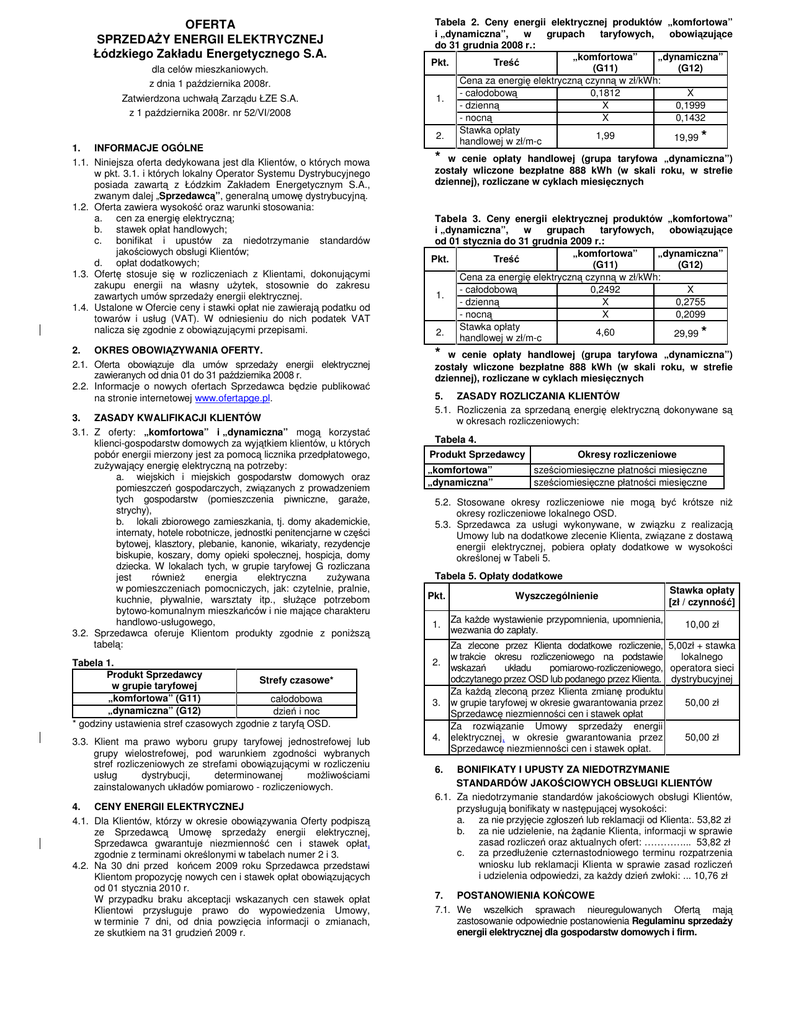 OFERTA SPRZEDAŻY ENERGII ELEKTRYCZNEJ Łódzkiego Zakładu Energetycznego S.A. dla celów mieszkaniowych. z dnia 1 października 2008r. Zatwierdzona uchwałą Zarządu ŁZE S.A. z 1 października 2008r. nr 52/VI/2008 1. INFORMACJE OGÓLNE 1.1. Niniejsza oferta dedykowana jest dla Klientów, o których mowa w pkt. 3.1. i których lokalny Operator Systemu Dystrybucyjnego posiada zawartą z Łódzkim Zakładem Energetycznym S.A., zwanym dalej „Sprzedawcą”, generalną umowę dystrybucyjną. 1.2. Oferta zawiera wysokość oraz warunki stosowania: a. cen za energię elektryczną; b. stawek opłat handlowych; c. bonifikat i upustów za niedotrzymanie standardów jakościowych obsługi Klientów; d. opłat dodatkowych; 1.3. Ofertę stosuje się w rozliczeniach z Klientami, dokonującymi zakupu energii na własny użytek, stosownie do zakresu zawartych umów sprzedaży energii elektrycznej. 1.4. Ustalone w Ofercie ceny i stawki opłat nie zawierają podatku od towarów i usług (VAT). W odniesieniu do nich podatek VAT nalicza się zgodnie z obowiązującymi przepisami. 2. OKRES OBOWIĄZYWANIA OFERTY. 2.1. Oferta obowiązuje dla umów sprzedaży energii elektrycznej zawieranych od dnia 01 do 31 października 2008 r. 2.2. Informacje o nowych ofertach Sprzedawca będzie publikować na stronie internetowej www.ofertapge.pl. 3. ZASADY KWALIFIKACJI KLIENTÓW 3.1. Z oferty: „komfortowa” i „dynamiczna” mogą korzystać klienci-gospodarstw domowych za wyjątkiem klientów, u których pobór energii mierzony jest za pomocą licznika przedpłatowego, zużywający energię elektryczną na potrzeby: a. wiejskich i miejskich gospodarstw domowych oraz pomieszczeń gospodarczych, związanych z prowadzeniem tych gospodarstw (pomieszczenia piwniczne, garaże, strychy), b. lokali zbiorowego zamieszkania, tj. domy akademickie, internaty, hotele robotnicze, jednostki penitencjarne w części bytowej, klasztory, plebanie, kanonie, wikariaty, rezydencje biskupie, koszary, domy opieki społecznej, hospicja, domy dziecka. W lokalach tych, w grupie taryfowej G rozliczana jest również energia elektryczna zużywana w pomieszczeniach pomocniczych, jak: czytelnie, pralnie, kuchnie, pływalnie, warsztaty itp., służące potrzebom bytowo-komunalnym mieszkańców i nie mające charakteru handlowo-usługowego, 3.2. Sprzedawca oferuje Klientom produkty zgodnie z poniższą tabelą: Tabela 2. Ceny energii elektrycznej produktów „komfortowa” i „dynamiczna”, w grupach taryfowych, obowiązujące do 31 grudnia 2008 r.: „komfortowa” „dynamiczna” Pkt. Treść (G11) (G12) Cena za energię elektryczną czynną w zł/kWh: - całodobową 0,1812 X 1. - dzienną X 0,1999 - nocną X 0,1432 Stawka opłaty 2. 1,99 19,99 * handlowej w zł/m-c * w cenie opłaty handlowej (grupa taryfowa „dynamiczna”) zostały wliczone bezpłatne 888 kWh (w skali roku, w strefie dziennej), rozliczane w cyklach miesięcznych Tabela 3. Ceny energii elektrycznej produktów „komfortowa” i „dynamiczna”, w grupach taryfowych, obowiązujące od 01 stycznia do 31 grudnia 2009 r.: „komfortowa” „dynamiczna” Pkt. Treść (G11) (G12) Cena za energię elektryczną czynną w zł/kWh: - całodobową 0,2492 X 1. - dzienną X 0,2755 - nocną X 0,2099 Stawka opłaty 2. 4,60 29,99 * handlowej w zł/m-c * w cenie opłaty handlowej (grupa taryfowa „dynamiczna”) zostały wliczone bezpłatne 888 kWh (w skali roku, w strefie dziennej), rozliczane w cyklach miesięcznych 5. ZASADY ROZLICZANIA KLIENTÓW 5.1. Rozliczenia za sprzedaną energię elektryczną dokonywane są w okresach rozliczeniowych: Tabela 4. Produkt Sprzedawcy „komfortowa” „dynamiczna” 5.2. Stosowane okresy rozliczeniowe nie mogą być krótsze niż okresy rozliczeniowe lokalnego OSD. 5.3. Sprzedawca za usługi wykonywane, w związku z realizacją Umowy lub na dodatkowe zlecenie Klienta, związane z dostawą energii elektrycznej, pobiera opłaty dodatkowe w wysokości określonej w Tabeli 5. Tabela 5. Opłaty dodatkowe Pkt. Wyszczególnienie Stawka opłaty [zł / czynność] 1. Za każde wystawienie przypomnienia, upomnienia, wezwania do zapłaty. 10,00 zł Tabela 1. Produkt Sprzedawcy Strefy czasowe* w grupie taryfowej „komfortowa” (G11) całodobowa „dynamiczna” (G12) dzień i noc * godziny ustawienia stref czasowych zgodnie z taryfą OSD. 2. 3.3. Klient ma prawo wyboru grupy taryfowej jednostrefowej lub grupy wielostrefowej, pod warunkiem zgodności wybranych stref rozliczeniowych ze strefami obowiązującymi w rozliczeniu usług dystrybucji, determinowanej możliwościami zainstalowanych układów pomiarowo - rozliczeniowych. 4. 4. CENY ENERGII ELEKTRYCZNEJ 4.1. Dla Klientów, którzy w okresie obowiązywania Oferty podpiszą ze Sprzedawcą Umowę sprzedaży energii elektrycznej, Sprzedawca gwarantuje niezmienność cen i stawek opłat, zgodnie z terminami określonymi w tabelach numer 2 i 3. 4.2. Na 30 dni przed końcem 2009 roku Sprzedawca przedstawi Klientom propozycję nowych cen i stawek opłat obowiązujących od 01 stycznia 2010 r. W przypadku braku akceptacji wskazanych cen stawek opłat Klientowi przysługuje prawo do wypowiedzenia Umowy, w terminie 7 dni, od dnia powzięcia informacji o zmianach, ze skutkiem na 31 grudzień 2009 r. Okresy rozliczeniowe sześciomiesięczne płatności miesięczne sześciomiesięczne płatności miesięczne 3. Za zlecone przez Klienta dodatkowe rozliczenie, 5,00zł + stawka w trakcie okresu rozliczeniowego na podstawie lokalnego wskazań układu pomiarowo-rozliczeniowego, operatora sieci odczytanego przez OSD lub podanego przez Klienta. dystrybucyjnej Za każdą zleconą przez Klienta zmianę produktu w grupie taryfowej w okresie gwarantowania przez 50,00 zł Sprzedawcę niezmienności cen i stawek opłat Za rozwiązanie Umowy sprzedaży energii elektrycznej, w okresie gwarantowania przez 50,00 zł Sprzedawcę niezmienności cen i stawek opłat. 6. BONIFIKATY I UPUSTY ZA NIEDOTRZYMANIE STANDARDÓW JAKOŚCIOWY