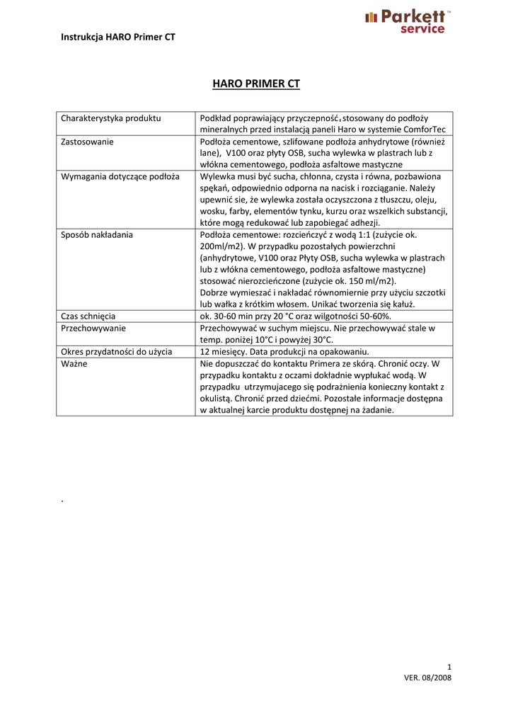 Instrukcja HARO Primer CT HARO PRIMER CT Charakterystyka produktu Zastosowanie Wymagania dotyczące podłoża Sposób nakładania Czas schnięcia Przechowywanie Okres przydatności do użycia Ważne Podkład poprawiający przyczepność stosowany do podłoży mineralnych przed instalacją paneli Haro w systemie ComforTec Podłoża cementowe, szlifowane podłoża anhydrytowe (również lane), V100 oraz płyty OSB, sucha wylewka w plastrach lub z włókna cementowego, podłoża asfaltowe mastyczne Wylewka musi być sucha, chłonna, czysta i równa, pozbawiona spękań, odpowiednio odporna na nacisk i rozciąganie. Należy upewnić sie, że wylewka została oczyszczona z tłuszczu, oleju, wosku, farby, elementów tynku, kurzu oraz wszelkich substancji, które mogą redukować lub zapobiegać adhezji. Podłoża cementowe: rozcieńczyć z wodą 1:1 (zużycie ok. 200ml/m2). W przypadku pozostałych powierzchni (anhydrytowe, V100 oraz Płyty OSB, sucha wylewka w plastrach lub z włókna cementowego, podłoża asfaltowe mastyczne) stosować nierozcieńczone (zużycie ok. 150 ml/m2). Dobrze wymieszać i nakładać równomiernie przy użyciu szczotki lub wałka z krótkim włosem. Unikać tworzenia się kałuż. ok. 30-60 min przy 20 °C oraz wilgotności 50-60%. Przechowywać w suchym miejscu. Nie przechowywać stale w temp. poniżej 10°C i powyżej 30°C. 12 miesięcy. Data produkcji na opakowaniu. Nie dopuszczać do kontaktu Primera ze skórą. Chronić oczy. W przypadku kontaktu z oczami dokładnie wypłukać wodą. W przypadku utrzymujacego się podrażnienia konieczny kontakt z okulistą. Chronić przed dziećmi. Pozostałe informacje dostępna w aktualnej karcie produktu dostępnej na żadanie. . 1 VER. 08/2008