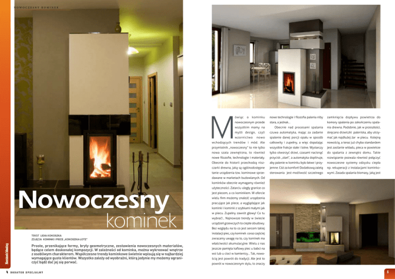 nowoczesny kominek M ówiąc o kominku nowoczesnym przede nowe technologie i filozofia palenia niby zamknięcia dopływu powietrza do stara, a jednak… komory spalenia po zakończeniu spala- wszystkim mamy na Obecnie nad procesami spalania nia drewna. Podobnie, jak w przeszłości, myśli design, czyli czuwa automatyka, mając za zadanie skręcano drzwiczki paleniska, aby utrzy- wzornictwo nowo spalenie danej porcji opału w sposób mać jak najdłużej żar w piecu. Kolejną wchodzących trendów i mód. Ale całkowity i zupełny, a więc dopalając nowością, a teraz już chyba standardem przymiotnik „nowoczesny” to nie tylko wszystkie frakcje stałe i lotne. Wystarczy jest zasilanie wkładu, pieca w powietrze nowa szata zewnętrzna, to również tylko otworzyć drzwi, czasami nacisnąć do spalania z zewnątrz domu. Takie nowe filozofie, technologie i materiały. przycisk „start”, a automatyka dopilnuje, rozwiązanie pozwala również połączyć Obecnie do historii przechodzą nisz- aby palenie w kominku było łatwe i przy- nowoczesne systemy odzysku ciepła czarki drewna, jaką są ogólnodostępne jemne. Cóż za komfort! Dodatkową zaletą np. rekuperacji z instalacjami kominko- tanie urządzenia tzw. kominowe sprze- sterowania jest możliwość szczelnego wymi. Zasada spalania biomasy, jaką jest dawane w marketach budowlanych. Od kominków obecnie wymagamy również Nowoczesny kominek Kominek Idealny Tekst Lidia Kokoszka Zdjęcia Kominki i Piece „Kokoszka-Lotz” 4 Proste, przenikające formy, bryły geometryczne, zestawienia nowoczesnych materiałów, będące celem doskonałej kompozycji. W zależności od kominka, można wykreować wnętrze z osobliwym charakterem. Współczesne trendy kominkowe świetnie wpisują się w najbardziej wymagające gusta klientów. Wszystko zależy od wyobraźni, którą jedynie my możemy ograniczyć bądź dać jej się porwać. dodatek specjalny użyteczności. Zatarciu uległy granice co jest piecem, a co kominkiem. W ofercie wielu firm możemy znaleźć urządzenia pracujące jak piece, a wyglądające jak kominki i kominki z szybkami małymi jak w piecu. Zupełny zawrót głowy! Co tu wybrać!... Najnowsze trendy w świecie urządzeń grzewczych to ciepłe obudowy. Bez względu na to co jest sercem takiej instalacji piec, czy kominek coraz częściej zwracamy uwagę na to, czy kominek ma właściwości akumulacyjne. Wielu z nas jeszcze pamięta kaflowy piec u babci na wsi lub u cioci w kamienicy… Tak, nowością jest powrót do tradycji. Ale jest to powrót w nowoczesnym stylu, to znaczy 5 nowoczesny kominek również drewno i brykiet drzewny, oparta natury jest naszą naturalną, atawistyczną żaroodporny, to surowce, które jako te jest na maksymalnym uzysku ciepła potrzebą. Jednak już daleko jesteśmy od pierwotne materiały powiązane z ogrzew- z porcji opału i jego późniejszej akumu- ogniska pośrodku izby dziennej. Aby być nictwem, coraz częściej wypierają, wełny lacji w wodzie bądź masie ceramicznej. zgodnym z ideą „pro-eko” nowoczesne mineralne i gips-kartony wszechobecne „Zimny” kominek już nie jest w modzie, kominki powinny spalać opał w sposób dotąd w kominkach. Można powiedzieć bo promieniowanie podczerwone, jakie optymalny, wtedy emitują najmniej zanie- stare tworzywo w nowej postaci, czyli emituje ciepła obudowa jest najzdrow- czyszczeń do atmosfery, powinny mieć znowu powrót do tradycji. szym i od zamierzchłych czasów spraw- również wysoką sprawność. Używając Po tym może przydługim ale jakże dzonym ciepłem. dobrych urządzeń oszczędzamy środo- istotnym wstępie dotyczącym tego co wisko, w którym żyjemy. w środku, możemy przejść do wykończe- Ciepło jest jedną z podstawowych stosowane nia, którym jest zewnętrzna, dla użytkow- się bezpieczeństwo i dostatek. Jednak w nowych zabudowach, to w większości nika najczęściej oglądana i najistotniejsza z biegiem lat szukamy bardziej wyrafino- materiały naturalne i zdrowe. Szamot, strona kominka. wanych jego źródeł. Potrzeba bycia bliżej ceramika żaroodporna, glina, beton potrzeb człowieka. Z ciepłem kojarzy Materiały obecnie Stylistyka nowoczesnych wnętrz, to proste formy, przenikające się podstawowe bryły geometryczne, zestawienia nowoczesnych materiałów z rustykalnymi, będącymi kontrapunktem całej kompozycji. W zależności od koncepcji wnętrza kominek może być takim rustykalnym elementem, może być też wtopiony we wnętrzu, tworząc kolejny element architektoniczny utrzymany w ogólnym wzornictwie, jak może również stanowić osobny mebel skupiający Kominek Idealny i organizujący całą przestrzeń. Bryła 6 kominka zdeterminowana jest w większości przypadków formatem szyby. Modne obecnie formaty architektoniczne, poziome świetnie wpasują się w estetykę dodatek specjalny REKLAMA nowoczesny kominek nowoczesnych wnętrz. Jednak te rozwiązania wymagają dużych przestrzeni i przestronnych pomieszczeń, zajmują także więcej miejsca. Alternatywą często stosowaną są paleniska z pionową wizją ognia. Zajmując mało miejsca pozwalają na aranżację prostych i kompaktowych form. Z równym powodzeniem cieszą się kompozycje symetryczne jak i asymetryczne, wszystko zależy od koncepcji wnętrza i indywidualnych preferencji użytkownika. Nowoczesny układ kompozycyjny organizujący całość obudowy kominkowej powinien być prosty i klarowny, zaaranżowany zgodnie z przyjętym wzornictwem całego wnętrza. Jako materiał wykończeniowy możemy zastosować kafle wielkogabarytowe, beton, kamień bądź szkło, które użyte w sposób minimalistyczny podkreślają jedynie zasadniczą bryłę kominka lub zupełnie przeciwnie, użyte w wielkich taflach, dają wrażenie uporządkowanych przestrzeni i czystych płaszczyzn. Nie wiadomo na co się zdecydować! Jedno i drugie się podoba! Do tego dodajmy jeszcze modne przeciwstawne zestawienia materiałów np. fakturowych z g