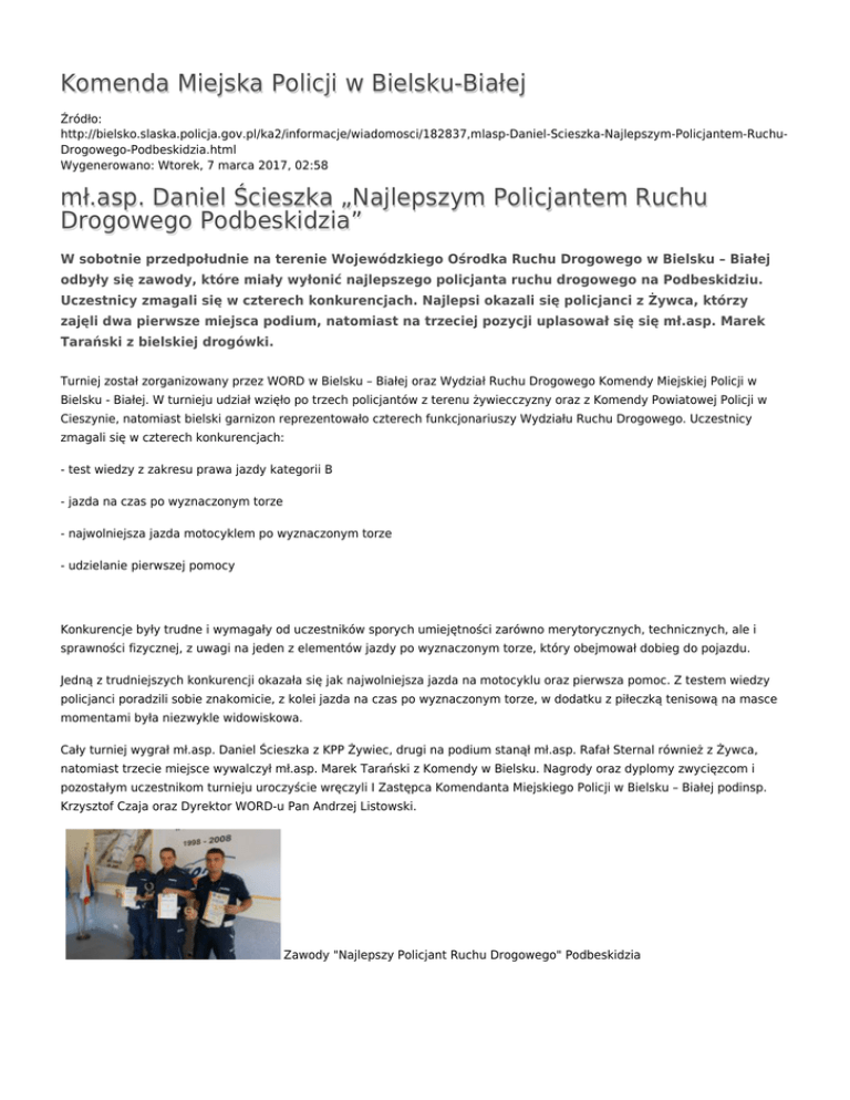 Komenda Miejska Policji w Bielsku-Białej Źródło: http://bielsko.slaska.policja.gov.pl/ka2/informacje/wiadomosci/182837,mlasp-Daniel-Scieszka-Najlepszym-Policjantem-RuchuDrogowego-Podbeskidzia.html Wygenerowano: Wtorek, 7 marca 2017, 02:58 mł.asp. Daniel Ścieszka „Najlepszym Policjantem Ruchu Drogowego Podbeskidzia” W sobotnie przedpołudnie na terenie Wojewódzkiego Ośrodka Ruchu Drogowego w Bielsku – Białej odbyły się zawody, które miały wyłonić najlepszego policjanta ruchu drogowego na Podbeskidziu. Uczestnicy zmagali się w czterech konkurencjach. Najlepsi okazali się policjanci z Żywca, którzy zajęli dwa pierwsze miejsca podium, natomiast na trzeciej pozycji uplasował się się mł.asp. Marek Tarański z bielskiej drogówki. Turniej został zorganizowany przez WORD w Bielsku – Białej oraz Wydział Ruchu Drogowego Komendy Miejskiej Policji w Bielsku - Białej. W turnieju udział wzięło po trzech policjantów z terenu żywiecczyzny oraz z Komendy Powiatowej Policji w Cieszynie, natomiast bielski garnizon reprezentowało czterech funkcjonariuszy Wydziału Ruchu Drogowego. Uczestnicy zmagali się w czterech konkurencjach: - test wiedzy z zakresu prawa jazdy kategorii B - jazda na czas po wyznaczonym torze - najwolniejsza jazda motocyklem po wyznaczonym torze - udzielanie pierwszej pomocy Konkurencje były trudne i wymagały od uczestników sporych umiejętności zarówno merytorycznych, technicznych, ale i sprawności fizycznej, z uwagi na jeden z elementów jazdy po wyznaczonym torze, który obejmował dobieg do pojazdu. Jedną z trudniejszych konkurencji okazała się jak najwolniejsza jazda na motocyklu oraz pierwsza pomoc. Z testem wiedzy policjanci poradzili sobie znakomicie, z kolei jazda na czas po wyznaczonym torze, w dodatku z piłeczką tenisową na masce momentami była niezwykle widowiskowa. Cały turniej wygrał mł.asp. Daniel Ścieszka z KPP Żywiec, drugi na podium stanął mł.asp. Rafał Sternal również z Żywca, natomiast trzecie miejsce wywalczył mł.asp. Marek Tarański z Komendy w Bielsku. Nagrody oraz dyplomy zwycięzcom i pozostałym uczestnikom turnieju uroczyście wręczyli I Zastępca Komendanta Miejskiego Policji w Bielsku – Białej podinsp. Krzysztof Czaja oraz Dyrektor WORD-u Pan Andrzej Listowski. Zawody "Najlepszy Policjant Ruchu Drogowego" Podbeskidzia Zainstaluj wtyczkę Flash, aby zobaczyć odtwarzacz. pobierz film - 19.63 MB Ocena: 5/5 (5) Tweetnij