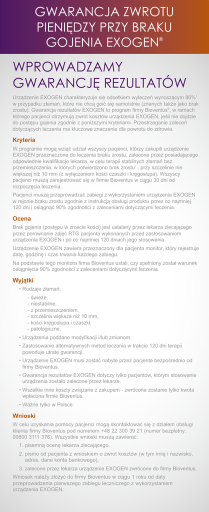 GWARANCJA ZWROTU PIENIĘDZY PRZY BRAKU GOJENIA EXOGEN ® WPROWADZAMY GWARANCJĘ REZULTATÓW Urządzenie EXOGEN charakteryzuje się odsetkiem wyleczeń wynoszącym 86%1 w przypadku złamań, które nie chcą goić się samoistnie (znanych także jako brak zrostu). Gwarancja rezultatów EXOGEN to program firmy Bioventus®, w ramach którego pacjenci otrzymują zwrot kosztów urządzenia EXOGEN, jeśli nie dojdzie do postępu gojenia zgodnie z poniższymi kryteriami. Przestrzeganie zaleceń dotyczących leczenia ma kluczowe znaczenie dla powrotu do zdrowia. Kryteria W programie mogą wziąć udział wszyscy pacjenci, którzy zakupili urządzenie EXOGEN przeznaczone do leczenia braku zrostu, zalecone przez posiadającego odpowiednie kwalifikacje lekarza, w celu terapii stabilnych złamań bez przemieszczenia, w których potwierdzono brak zrostu† , przy szczelinie nie większej niż 10 mm (z wyłączeniem kości czaszki i kręgosłupa). Wszyscy pacjenci muszą zarejestrować się w firmie Bioventus w ciągu 30 dni od rozpoczęcia leczenia. Pacjenci muszą przeprowadzać zabiegi z wykorzystaniem urządzenia EXOGEN w rejonie braku zrostu zgodnie z instrukcją obsługi produktu przez co najmniej 120 dni i osiągnąć 90% zgodności z zaleceniami dotyczącymi leczenia. Ocena Brak gojenia (postępu w zroście kości) jest ustalany przez lekarza zlecającego przez porównanie zdjęć RTG pacjenta wykonanych przed zastosowaniem urządzenia EXOGEN i po co najmniej 120 dniach jego stosowania. Urządzenie EXOGEN zawiera przeznaczony dla pacjenta monitor, który rejestruje datę, godzinę i czas trwania każdego zabiegu. Na podstawie tego monitora firma Bioventus ustali, czy spełniony został warunek osiągnięcia 90% zgodności z zaleceniami dotyczącymi leczenia. Wyjątki • Rodzaje złamań: - świeże, - niestabilne, - z przemieszczeniem, - szczelina większa niż 10 mm, - kości kręgosłupa i czaszki, - patologiczne. • Urządzenia poddane modyfikacji i/lub zmianom. • Zastosowanie alternatywnych metod leczenia w trakcie 120 dni terapii powoduje utratę gwarancji. • Urządzenie EXOGEN musi zostać nabyte przez pacjenta bezpośrednio od firmy Bioventus. • Gwarancja rezultatów EXOGEN dotyczy tylko pacjentów, którym stosowanie urządzenia zostało zalecone przez lekarza. • Wszelkie inne koszty związane z zakupem - zwrócona zostanie tylko kwota wpłacona firmie Bioventus. • Ważne tylko w Polsce. Wnioski W celu uzyskania pomocy pacjenci mogą skontaktować się z działem obsługi klienta firmy Bioventus pod numerem +48 22 300 39 21 (numer bezpłatny: 00800 3111 376). Wszystkie wnioski muszą zawierać: 1. pisemną ocenę lekarza zlecającego, 2. p ismo od pacjenta z wnioskiem o zwrot kosztów (w tym imię i nazwisko, adres, dane konta bankowego), 3. zalecone przez lekarza urządzenie EXOGEN zwrócone do firmy Bioventus. Wniosek należy złożyć do firmy Bioventus w ciągu 1 roku od daty przeprowadzenia pierwszego zabiegu leczniczego z wykorzystaniem urządzenia EXOGEN. GWARANCJA ZWROTU PIENIĘDZY PRZY BRAKU GOJENIA EXOGEN ® Odsetek wyleczeń wynoszący 86% w przypadku złamań, które nie chcą się goić samoistnie. 20 minut leczenia nie zakłóca codziennych czynności Zapytaj lekarza o Bibliografia: 1. Nolte PA, van der Krans A, Patka P, Janssen IMC, Ryaby JP, Albers GHR. Low-intensity pulsed ultrasound in the treatment of nonunions. J Trauma. 2001;51(4):693−703. Brak zrostu stwierdza się, gdy w miejscu złamania nie dochodzi do widocznych postępów gojenia. † Podsumowanie wskazań: urządzenie EXOGEN wskazane jest do nieinwazyjnego leczenia wszystkich ubytków kostnych (za wyjątkiem trzonów kręgów i czaszki), w tym opóźnionego zrostu, braku zrostu†, złamań przeciążeniowych i zespoleń stawów. Urządzenie EXOGEN wskazane jest także do przyspieszania procesu gojenia świeżych złamań oraz odbudowy po zabiegach osteotomii, transportu fragmentu kostnego i osteogenezy dystrakcyjnej. Pełne informacje o zaleceniach można znaleźć na etykiecie produktu i stronie internetowej www.exogen.com lub kontaktując się z działem obsługi klienta pod numerem +48 22 300 39 21 (numer bezpłatny: 00800 3111 376). Nie ma znanych przeciwwskazań dla zastosowania urządzenia EXOGEN. Bezpieczeństwo i skuteczność nie zostały ustalone u osób z niedojrzałym układem kostnym, kobiet w okresie ciąży lub karmienia piersią, pacjentów z rozrusznikami serca, w przypadku złamań wynikających z raka kości ani u pacjentów z zaburzeniami krążenia krwi lub zaburzeniami krzepnięcia. Niektórzy pacjenci mogą być uczuleni na żel do ultrasonografii. Bioventus Coöperatief U.A. Taurusavenue 31 2132 LS Hoofddorp Holandia Biuro Obsługi Klienta [email protected] Numer bezpłatny 00800 3111 376 Tel +48 22 300 39 21 www.BioventusGlobal.com www.exogen.com EXOGEN i logo Bioventus są zarejestrowanymi znakami towarowymi firmy Bioventus LLC. © 2014 Bioventus LLC SMK-000574 06/14