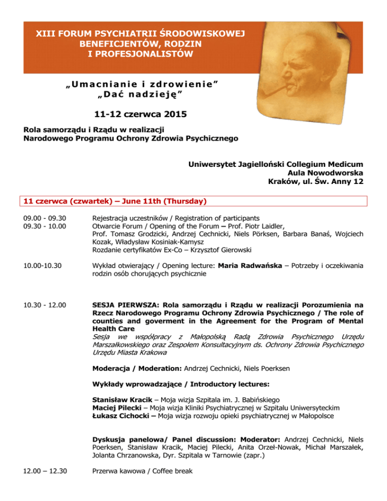 XIII FORUM PSYCHIATRII ŚRODOWISKOWEJ BENEFICJENTÓW, RODZIN I PROFESJONALISTÓW „Umacnianie i zdrowienie” „Dać nadzieję” 11-12 czerwca 2015 Rola samorządu i Rządu w realizacji Narodowego Programu Ochrony Zdrowia Psychicznego Uniwersytet Jagielloński Collegium Medicum Aula Nowodworska Kraków, ul. Św. Anny 12 11 czerwca (czwartek) – June 11th (Thursday) 09.00 - 09.30 09.30 - 10.00 Rejestracja uczestników / Registration of participants Otwarcie Forum / Opening of the Forum – Prof. Piotr Laidler, Prof. Tomasz Grodzicki, Andrzej Cechnicki, Niels Pörksen, Barbara Banaś, Wojciech Kozak, Władysław Kosiniak-Kamysz Rozdanie certyfikatów Ex-Co – Krzysztof Gierowski 10.00-10.30 Wykład otwierający / Opening lecture: Maria Radwańska – Potrzeby i oczekiwania rodzin osób chorujących psychicznie 10.30 - 12.00 SESJA PIERWSZA: Rola samorządu i Rządu w realizacji Porozumienia na Rzecz Narodowego Programu Ochrony Zdrowia Psychicznego / The role of counties and goverment in the Agreement for the Program of Mental Health Care Sesja we współpracy z Małopolską Radą Zdrowia Psychicznego Urzędu Marszałkowskiego oraz Zespołem Konsultacyjnym ds. Ochrony Zdrowia Psychicznego Urzędu Miasta Krakowa Moderacja / Moderation: Andrzej Cechnicki, Niels Poerksen Wykłady wprowadzające / Introductory lectures: Stanisław Kracik – Moja wizja Szpitala im. J. Babińskiego Maciej Pilecki – Moja wizja Kliniki Psychiatrycznej w Szpitalu Uniwersyteckim Łukasz Cichocki – Moja wizja rozwoju opieki psychiatrycznej w Małopolsce Dyskusja panelowa/ Panel discussion: Moderator: Andrzej Cechnicki, Niels Poerksen, Stanisław Kracik, Maciej Pilecki, Anita Orzeł-Nowak, Michał Marszałek, Jolanta Chrzanowska, Dyr. Szpitala w Tarnowie (zapr.) 12.00 – 12.30 Przerwa kawowa / Coffee break Sesja organizowana przy współpracy z Pracownią Badań nad Psychoterapią Psychoz SRP 12.30 – 14.00 SESJA DRUGA: Zrozumieć schizofrenię Moderacja / Moderation: Jacek Wciórka Wykłady wprowadzające / Introductory lectures: Jerzy Zadęcki – Zaburzenia „JA” we wczesnej schizofrenii Jacek Wciórka – Rozumienie psychozy Panel Beneficjentów i profesjonalistów: Bolesław, Ania, Wojtek, Dorota DużykWypich, Anna Liberadzka, Jacek Bomba, Andrzej Cechnicki, Anna Bielańska, Joanna Franczyk-Glita, Aneta Kalisz 14.00 – 15.00 Lunch Sesja organizowana przy współpracy z Małopolską Filią Sekcji Psychiatrii Środowiskowej i Rehabilitacji PTP i Stowarzyszeniem „Rewersy Kultury” 15.00 – 17.00 SESJA III: Rola Uniwersytetu w pokonywaniu piętna Moderacja / Moderation: Łukasz Cichocki Wykłady wprowadzające / Introductory lectures: Anna Liberadzka – Przeciw wykluczeniu Artur Kochański - Wizerunek osoby chorującej psychicznie wśród psychiatrów Dyskusja panelowa / Panel discussion: Moderator: Łukasz Cichocki Uczestnicy / Participants: Łukasz Cichocki, Artur Kochański, Anna Liberadzka, Joanna Hańderek, Barbara Banaś, Maria Radwańska 17.00 Zebranie osób i organizacji wspierających Porozumienie na Rzecz NPOZP oraz Zarządu Naukowej Sekcji Psychiatrii Środowiskowej i Rehabilitacji PTP / Meeting of people and organizations supporting Agreement for the National Program of Mental Health Care and of The Board of the Scientific Section of Community Psychiatry and Rehabilitation at Polish Psychiatric Association 12 czerwca (piątek) / June 12th (Friday) Sesja IV i V organizowana przy współpracy z Pracownią Badań nad Psychoterapią Psychoz i Polskim Towarzystwem na Rzecz Psychologicznego i Społecznego Podejścia do Psychoz (PTPS) 09.00 - 11.00 SESJA CZWARTA: Rola psychoterapii w leczeniu osób chorujących psychicznie /The role of psychotherapy in treatment of people suffering from mental illness Moderacja / Moderation: Anna Bielańska Wykłady wprowadzające / Introductory lectures: Katarzyna Prot-Klinger – Psychoterapia w zespole leczenia domowego Łukasz Gawęda- Trening metakognitywny Dyskusja panelowa / Panel discussion: Moderator: Uczestnicy / Participants: Anna Bielańska, Aneta Kalisz, Łukasz Gawęda, Katarzyna Prot-Klinger, Katarzyna Wrzesień 11.00 – 11.30 Przerwa kawowa / Coffee break 11.30 – 13.30 SESJA PIĄTA: Rola Rodziny Moderacja/Moderation: Marta Cichońska Wykłady wprowadzające / Introductory lectures: Mariusz Furgał/ Berandetta Janusz – Rodzina a psychoza Marta Cichońska – współpraca z rodziną osoby z podwójną diagnozą 13.30 – 14.30 Panel: Marta Cichońska, Mariusz Furgał / Bernadetta Janusz, Federacja Rodzin lunch 14.30-16.00 SESJA SZÓSTA: Praca / Employment Moderacja/Moderation: Hubert Kaszyński Wykłady wprowadzające / Introductory lectures: Harald Rongved (Norwegia) – Rehabilitacja osób chorujących psychicznie – doświadczenia norweskie Anna Liberadzka – Potrzeby i oczekiwania beneficjentów – raport z Polski Dyskusja panelowa/Panel discussion: Czy my tworzymy stabilne miejsca pracy dla osób chorujących psychicznie? Uczestnicy/Participants: Joanna Brzozowska-Wabik (SKES), Rafał Barański (ROPS), Marta Młynarczyk (Spółdzielnia Socjalna Kobierzyn), Maciej Jachymiak (Spółdzielnia Socjalna „U Starosty”), Artur Kochański (Spółdzielnia Socjalna), Andrzej Cechnicki (SRP i Laboratorium Cogito), Agnieszka Lewonowska (ZAZ, Pensjonat u Pana Cogito), Organizacja ALF (Norwegia) Opłaty: 10 zł beneficjenci i studenci 30 zł rodziny osób chorujących 70 zł profesjonaliści Opłata zawiera: fee, materiały konferencyjne, czasopismo Dla Nas i Rodziny, lunch Zgłoszenia: Termin nadsyłania zgłoszeń: 15 maja. Prosimy o zgłoszenia drogą mailową. [email protected] tel. 12 421 51 17 koordynator: Joanna Palka Wpłata na konto: 88 1240 1431 1111 0010 0537 9768 Bank PeKaO S.A. I o. Kraków W tytule przelewu: Forum 2015 + imię i nazwisko Organizatorzy: Uniwersytet Jagielloński Collegium Medicum UJ CM Katedra Psychiatrii Zakład Psychiatrii Środowiskowej Stowarzyszenie na Rzecz Rozwoju Psychiatrii i Opieki Środowiskowej STOWARZYS