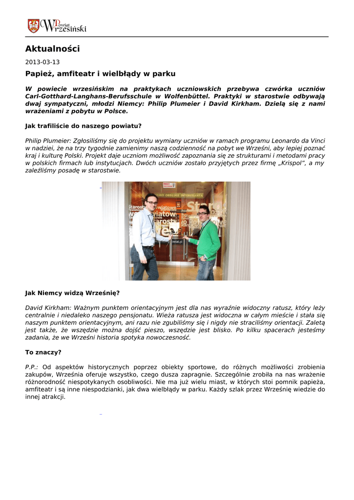 Aktualności 2013-03-13 Papież, amfiteatr i wielbłądy w parku W powiecie wrzesińskim na praktykach uczniowskich przebywa czwórka uczniów Carl-Gotthard-Langhans-Berufsschule w Wolfenbüttel. Praktyki w starostwie odbywają dwaj sympatyczni, młodzi Niemcy: Philip Plumeier i David Kirkham. Dzielą się z nami wrażeniami z pobytu w Polsce. Jak trafiliście do naszego powiatu? Philip Plumeier: Zgłosiliśmy się do projektu wymiany uczniów w ramach programu Leonardo da Vinci w nadziei, że na trzy tygodnie zamienimy naszą codzienność na pobyt we Wrześni, aby lepiej poznać kraj i kulturę Polski. Projekt daje uczniom możliwość zapoznania się ze strukturami i metodami pracy w polskich firmach lub instytucjach. Dwóch uczniów zostało przyjętych przez firmę „Krispol”, a my zaleźliśmy posadę w starostwie. Jak Niemcy widzą Wrześnię? David Kirkham: Ważnym punktem orientacyjnym jest dla nas wyraźnie widoczny ratusz, który leży centralnie i niedaleko naszego pensjonatu. Wieża ratusza jest widoczna w całym mieście i stała się naszym punktem orientacyjnym, ani razu nie zgubiliśmy się i nigdy nie straciliśmy orientacji. Zaletą jest także, że wszędzie można dojść pieszo, wszędzie jest blisko. Po kilku spacerach jesteśmy zadania, że we Wrześni historia spotyka nowoczesność. To znaczy? P.P.: Od aspektów historycznych poprzez obiekty sportowe, do różnych możliwości zrobienia zakupów, Września oferuje wszystko, czego dusza zapragnie. Szczególnie zrobiła na nas wrażenie różnorodność niespotykanych osobliwości. Nie ma już wielu miast, w których stoi pomnik papieża, amfiteatr i są inne niespodzianki, jak dwa wielbłądy w parku. Każdy szlak przez Wrześnię wiedzie do innej atrakcji. A więc zostaniecie ambasadorami Wrześni? D.K.: Pewnie, tutaj nie można się nudzić. Możliwość zrobienia zakupów w centrum i na deptaku, parki i różne propozycje sportowe zapewniają atrakcyjne spędzanie czasu. Można się także wiele dowiedzieć o historii powiatu wrzesińskiego. Szczególnie opłaca się poznać historię dzieci wrzesińskich, z którego słynie Września. Podsumowując: mimo że miasto należy do mniejszych w Polsce, to na pewno nie musi się ukrywać i jest godne polecenia dla turystów w każdym wieku. Rozmawiała (ami)
