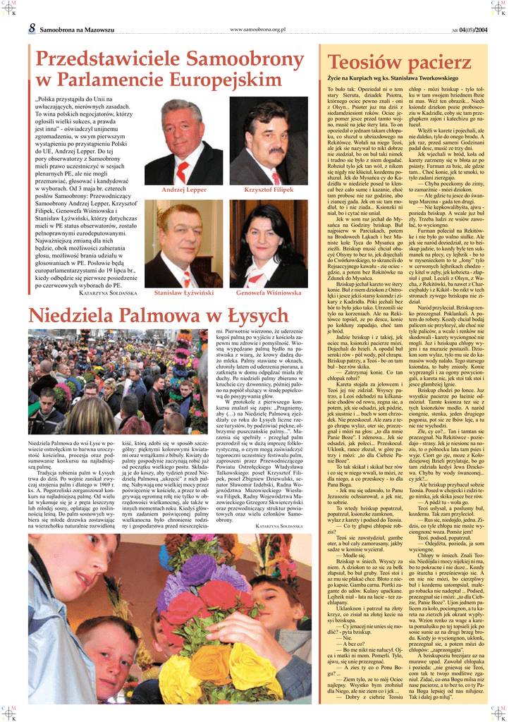 C M C M Y K Y K 8 Samoobrona na Mazowszu www.samoobrona.org.pl Przedstawiciele Samoobrony w Parlamencie Europejskim „Polska przystąpiła do Unii na uwłaczających, nierównych zasadach. To wina polskich negocjatorów, którzy ogłosili wielki sukces, a prawda jest inna” - oświadczył unijnemu zgromadzeniu, w swym pierwszym wystąpieniu po przystąpieniu Polski do UE, Andrzej Lepper. Do tej pory obserwatorzy z Samoobrony mieli prawo uczestniczyć w sesjach plenarnych PE, ale nie mogli przemawiać, głosować i kandydować w wyborach. Od 3 maja br. czterech posłów Samoobrony: Przewodniczący Samoobrony Andrzej Lepper, Krzysztof Filipek, Genowefa Wiśniowska i Stanisław Łyżwiński, którzy dotychczas mieli w PE status obserwatorów, zostało pełnoprawnymi eurodeputowanymi. Najważniejszą zmianą dla nich będzie, obok możliwości zabierania głosu, możliwość brania udziału w głosowaniach w PE. Posłowie będą europarlamentarzystami do 19 lipca br., kiedy odbędzie się pierwsze posiedzenie po czerwcowych wyborach do PE. K ATARZYNA SOŁDAŃSKA Andrzej Lepper Krzysztof Filipek Stanisław Łyżwiński Genowefa Wiśniowska Niedziela Palmowa w Łysych Niedziela Palmowa do wsi Łyse w powiecie ostrołęckim to barwna uroczystość kościelna, procesja oraz podsumowanie konkursu na najładniejszą palmę. Tradycja robienia palm w Łysych trwa do dziś. Po wojnie zanikał zwyczaj strojenia palm i dlatego w 1969 r. ks. A. Pogorzeliski zorganizował konkurs na najładniejszą palmę. Od wielu lat wykonuje się je z pręta leszczyny lub młodej sosny, oplatając go roślinnością leśną. Do palm sosnowych wybiera się młode drzewka zostawiając na wierzchołku naturalnie rozwidloną kiść, którą zdobi się w sposób szczególny: pięknymi kolorowymi kwiatami oraz wstążkami z bibuły. Kwiaty do palmy gospodynie zaczynają robić już od początku wielkiego postu. Składają je do koszy, aby tydzień przed Niedzielą Palmową „ukręcić” z nich palmę. Nabywają one wielkiej mocy przez poświęcenie w kościele, a przez to odgrywają ogromną rolę nie tylko w obrzędowości wielkanocnej, ale także w innych momentach roku. Kiedyś głównym zadaniem poświęconej palmy wielkanocna było chronienie rodziny i gospodarstwa przed nieszczęścia- mi. Pierwotnie wierzono, że uderzenie kogoś palmą po wyjściu z kościoła zapewni mu zdrowie i pomyślność. Wiosną wypędzano palmą bydło na pastwiska z wiarą, że krowy dadzą dużo mleka. Palmy stawiane w oknach, chroniły latem od uderzenia pioruna, a zatknięta w domu odpędzać miała złe duchy. Po niedzieli palmy zbierano w kruchcie czy dzwonnicy, później palono na popiół służący w środę popielcową do posypywania głów. W protokole z pierwszego konkursu znalazł się zapis: „Pragniemy, aby (…) na Niedzielę Palmową zjeżdżały co roku do Łysych liczne rzesze turystów, by podziwiać piękne, olbrzymie puszczańskie palmy...”. Marzenia się spełniły - przegląd palm przerodził się w dużą imprezę folklorystyczną, o czym mogą zaświadczyć tegoroczni uczestnicy festiwalu palm, zaproszeni przez Przewodniczącego Powiatu Ostrołęckiego Władysława Talkowskiego: poseł Krzysztof Filipek, poseł Zbigniew Dziewulski, senator Sławomir Izdebski, Radna Województwa Mazowieckiego Wiesława Filipek, Radny Województwa Mazowieckiego Grzegorz Skwierczyński oraz przewodniczący struktur powiatowych oraz wielu członków Samoobrony. K ATARZYNA SOŁDAŃSKA NR 04(05)/2004 Teosiów pacierz Życie na Kurpiach wg ks. Stanisława Tworkowskiego To buło tak: Opoziedał ni o tem stary Sieruta, dziadek Psiotra, którnego ociec pewno znali - oni z Olsyn... Psioter juz ma dziś z siedamdziesiont roków. Ociec jego pomer jesce przed tamto wojno, musić na jeke śtery lata. To on opoziedał o jednam takam chłopaku, co słuzuł u ubziazdowego na Rekitówce. Wołali na niego Teoś, ale jek sie nazywał to nikt dobrze nie ziedział, bo on buł taki nimek i trudno sie było z niem dogadać. Robziuł tylo jek tan wół, z nikem się nigdy nie kłóciuł, kozdemu posłuzuł. Jek do Mysańca cy do Kadzidła w niedziele posed to klencał bez cało sume i kazanie, choć tam probosc nie raz godzine, abo i ziancej gada. Jek on sic tam modluł, to i nie ziada... Ksionzki ni niał, bo i cytać nie uniał. Jek w som raz jechał do Mysańca na Godziny bziskup. Buł najpsierw w Parciakach, potem na Brodowech Łąkach i bez Maniste kole Tyca do Mysańca go zieźli. Bziskup musić chciał obacyć Olsyny to bez to, jek dojechali do Cwórkowskiego, to skrancili do Rejsaccyjnego kawału - zie ociec gdzie, a potem bez Rokitówke na Zdunek do Mysańca. Bziskup jechał kareto we śtery konie. Buł z niem dziokon z Ostrołęki i jesce jekiś starsy ksiondz i zikary z Kadzidła. Póki jechali bez bór to było jeko tako. Utrzonśli sie tylo na korzeniach. Ale na Rekitówce topsiel, ze po descu, konie po kołduny zapadajo, choć tam je bród. Jadzie bziskup i z takiej, jek ociec ma, ksionzki pacierze mózi. Dojechali do bzieli. A opodal buł seroki rów - pół wody, pół chrapu. Bziskup patrzy, a Teoś - bo on tam buł - bez rów skika. — Zatrzymaj konie. Co tan chłopak robzi? Kareta stojała za jełowcem i Teoś jej nie zidział. Wsyscy patrzo, a Leoś odchodzi na kilkanaście chodów od rowu, zegna sie, a potem, jek sie odsadzi, jek pódzie, jek siustnie i ... buch w som chrzodek. Nie przeskocuł. Ale zara z tego chrapu wylaz, oter sie, przezegnał i mózi na głos: „to dla mnie Panie Boze”. I zdenowa... Jek sie odsadzi, jak poleci... Przeskocuł. Uklonk, rance złozuł, w góre patrzy i mózi: „to dla Ciebzie Panie Boze”. To tak skikał i skikał bez rów i co się w niego wwali, to mózi, ze dla niego, a co przeskocy - to dla Pana Boga. - Jek mu się udawało, to Panu Jezusoziu ochsiarował, a jek nie, to sobzie. To wtedy bziskup popatrzuł, popatrzuł, ksionzke zamknon, wylaz z karety i podsed do Teosia. — Co ty głups