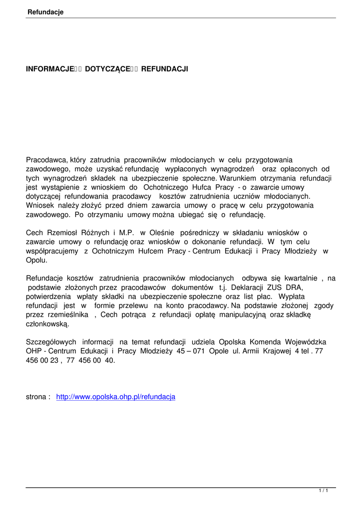 Refundacje INFORMACJE DOTYCZĄCE REFUNDACJI Pracodawca, który zatrudnia pracowników młodocianych w celu przygotowania zawodowego, może uzyskać refundację wypłaconych wynagrodzeń oraz opłaconych od tych wynagrodzeń składek na ubezpieczenie społeczne. Warunkiem otrzymania refundacji jest wystąpienie z wnioskiem do Ochotniczego Hufca Pracy - o zawarcie umowy dotyczącej refundowania pracodawcy kosztów zatrudnienia uczniów młodocianych. Wniosek należy złożyć przed dniem zawarcia umowy o pracę w celu przygotowania zawodowego. Po otrzymaniu umowy można ubiegać się o refundację. Cech Rzemiosł Różnych i M.P. w Oleśnie pośredniczy w składaniu wniosków o zawarcie umowy o refundację oraz wniosków o dokonanie refundacji. W tym celu współpracujemy z Ochotniczym Hufcem Pracy - Centrum Edukacji i Pracy Młodzieży w Opolu. Refundacje kosztów zatrudnienia pracowników młodocianych odbywa się kwartalnie , na podstawie złożonych przez pracodawców dokumentów t.j. Deklaracji ZUS DRA, potwierdzenia wpłaty składki na ubezpieczenie społeczne oraz list płac. Wypłata refundacji jest w formie przelewu na konto pracodawcy. Na podstawie złożonej zgody przez rzemieślnika , Cech potrąca z refundacji opłatę manipulacyjną oraz składkę członkowską. Szczegółowych informacji na temat refundacji udziela Opolska Komenda Wojewódzka OHP - Centrum Edukacji i Pracy Młodzieży 45 – 071 Opole ul. Armii Krajowej 4 tel . 77 456 00 23 , 77 456 00 40. strona : http://www.opolska.ohp.pl/refundacja 1/1