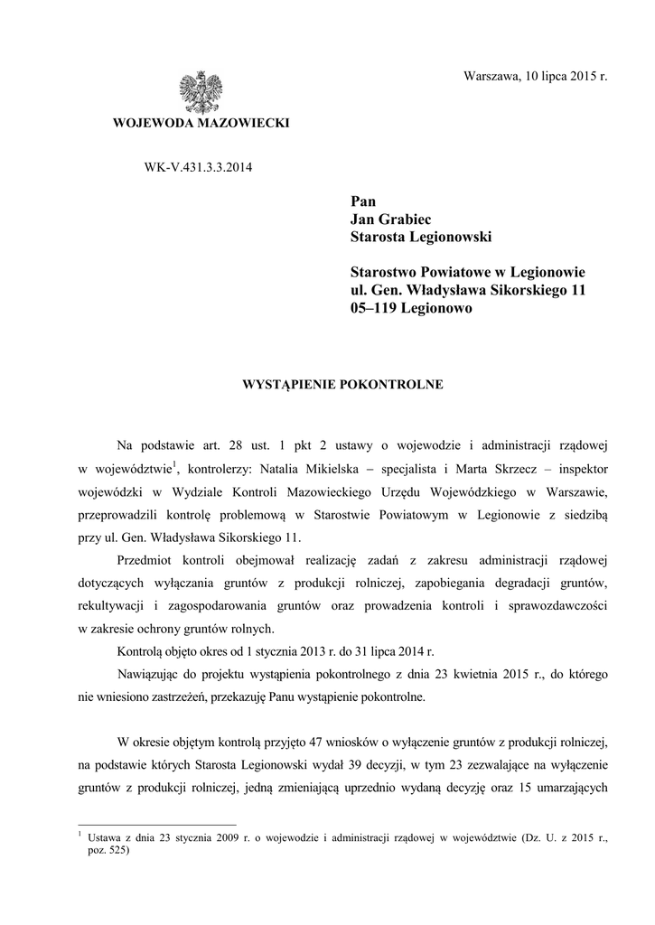 Warszawa, 10 lipca 2015 r. WOJEWODA MAZOWIECKI WK-V.431.3.3.2014 Pan Jan Grabiec Starosta Legionowski Starostwo Powiatowe w Legionowie ul. Gen. Władysława Sikorskiego 11 05–119 Legionowo WYSTĄPIENIE POKONTROLNE Na podstawie art. 28 ust. 1 pkt 2 ustawy o wojewodzie i administracji rządowej w województwie1, kontrolerzy: Natalia Mikielska specjalista i Marta Skrzecz – inspektor wojewódzki w Wydziale Kontroli Mazowieckiego Urzędu Wojewódzkiego w Warszawie, przeprowadzili kontrolę problemową w Starostwie Powiatowym w Legionowie z siedzibą przy ul. Gen. Władysława Sikorskiego 11. Przedmiot kontroli obejmował realizację zadań z zakresu administracji rządowej dotyczących wyłączania gruntów z produkcji rolniczej, zapobiegania degradacji gruntów, rekultywacji i zagospodarowania gruntów oraz prowadzenia kontroli i sprawozdawczości w zakresie ochrony gruntów rolnych. Kontrolą objęto okres od 1 stycznia 2013 r. do 31 lipca 2014 r. Nawiązując do projektu wystąpienia pokontrolnego z dnia 23 kwietnia 2015 r., do którego nie wniesiono zastrzeżeń, przekazuję Panu wystąpienie pokontrolne. W okresie objętym kontrolą przyjęto 47 wniosków o wyłączenie gruntów z produkcji rolniczej, na podstawie których Starosta Legionowski wydał 39 decyzji, w tym 23 zezwalające na wyłączenie gruntów z produkcji rolniczej, jedną zmieniającą uprzednio wydaną decyzję oraz 15 umarzających 1 Ustawa z dnia 23 stycznia 2009 r. o wojewodzie i administracji rządowej w województwie (Dz. U. z 2015 r., poz. 525) postępowanie w przedmiocie wyłączenia gruntów z produkcji oraz 6 postanowień o odmowie wszczęcia postępowania. Ponadto jeden wniosek pozostawiono bez rozpoznania ze względu na nieusunięcie jego braków w wyznaczonym terminie, a jeden został wycofany przez wnioskodawcę. Starosta Legionowski nie wydawał decyzji w sprawie rekultywacji i zagospodarowania gruntów ani nakazujących zalesienie, zadrzewienie lub zakrzewienie gruntów, lub założenie na nich trwałych użytków rolnych ze względu na ochronę gleb przed erozją i ruchami masowymi ziemi. Organ we wskazanym okresie nie prowadził także kontroli stosowania przepisów ustawy o ochronie gruntów rolnych i leśnych2. Kontroli poddano 30 spraw dotyczących wyłączenia gruntów z produkcji rolniczej, w tym 16 zakończonych wydaniem decyzji zezwalających na wyłączenie, sześć wydaniem decyzji umarzających postępowanie, sześć postanowień o odmowie wszczęcia postępowania oraz dwie sprawy, w przypadku których wniosek, odpowiednio, wycofano, oraz pozostawiono bez rozpoznania. W kontrolowanej jednostce opracowano wzór wniosku o wyłączenie gruntów z produkcji rolniczej, który określał wymagane załączniki, i udostępniono go na stronie BIP urzędu oraz w Wydziale Geodezji i Gospodarki Nieruchomościami. Skontrolowane decyzje dotyczące wyłączenia gruntów rolnych z produkcji rolniczej zostały wydane z zachowaniem właściwości rzeczowej i miejscowej organu określonej w art. 5 ust. 1 ustawy o ochronie gruntów rolnych i leśnych oraz art. 21 § 1 k.p.a.3 Decyzje zezwalające dotyczyły gruntów określonych w art. 11 ust. 1 ustawy o ochronie gruntów rolnych i leśnych i zawierały elementy, o których mowa w art. 107 § 1 k.p.a, a także stosownie do przedmiotu decyzji określały: - należności za wyłączenie gruntu z produkcji rolniczej oraz zwolnienie z ich zapłaty, - opłatę roczną (lub jednorazową) z tytułu użytkowania na cele nierolnicze gruntów wyłączonych z produkcji rolniczej, - termin uiszczenia opłaty oraz numer konta bankowego, na które należy ją wnieść, - obowiązek zdjęcia i wykorzystania wierzchniej warstwy gleby na poprawę wartości użytkowej gruntów, - pouczenie o skutkach nieterminowego wnoszenia opłat i konieczności uprzedzenia nabywcy o obowiązku uiszczania opłat rocznych w razie zbycia gruntów objętych decyzją. W przypadku dziewięciu spraw oznaczonych: GN.6124.1.8.2013, GN.6124.1.20.2013.BK, GN.6124.1.28.2013.KK2, 2 3 GN.6124.1.31.2013.MB1, GN.6124.1.33.2013.KK2, Ustawa z dnia 3 lutego 1995 r. o ochronie gruntów rolnych i leśnych (Dz. U. z 2013 r., poz. 1205, z późn. zm.). Ustawa z dnia 14 czerwca 1960 r. Kodeks postępowania administracyjnego (Dz. U. z 2013 r. poz. 267, z późn. zm.). 2 GN.6124.1.36.2013.KK2, GN.6124.39.2014.KK2, GN.6124.41.2014.KK2 oraz GN.6124.46.2014.KK2 wnioskodawców, na podstawie art. 12a ustawy o ochronie gruntów rolnych i leśnych, nie dotyczył obowiązek uiszczenia należności i opłat rocznych z uwagi na wyłączenie gruntów z produkcji rolniczej na cele budownictwa mieszkaniowego. W pozostałych poddanych kontroli sprawach oznaczonych: GN.6124.1.7.2013.MB1, GN.6124.1.26.2013.AZ4, GN.6124.2.2014.NS, GN.6124.33.2014.KK2, GN.6124.1.12.2013.MB1, GN.6124.1.2014.KK2 oraz GN.6124.31.2014.KK2 wnioskodawcy byli zwolnieni z obowiązku uiszczenia jednorazowej należności stosownie do art. 12 ust. 6 ww. ustawy, ponieważ wartość gruntu przewyższała wartość należności. Opłaty roczne, stanowiące 10% wartości należności określonych zgodnie z art. 12 ust. 7 ustawy o ochronie gruntów rolnych i leśnych – zostały ustalone w prawidłowej wysokości. Przed nałożeniem na strony obowiązku zdjęcia oraz wykorzystania próchniczej warstwy gleby na cele poprawy wartości użytkowej gruntów w 15 sprawach oznaczonych: GN.6124.1.7.2013.MB1, GN.6124.1.26.2013.AZ4, GN.6124.2.2014.NS, GN.6124.33.2014.KK2, GN.6124.1.8.2013, GN.6124.1.12.2013.MB1, GN.6124.1.20.2013.BK, GN.6124.1.28.2013.KK2, GN.6124.1.33.2013.KK2, GN.6124.31.2014.KK2, GN.6124.1.36.2013.KK2, GN.6124.39.2014.KK2, GN.6124.1.2014.KK2, GN.6124.41.2014.KK2 oraz GN.6124.46.2014.KK2 Starosta Legionowski, stosownie do art. 14 ust. 1 ustawy o ochronie gruntów rolnych i leśnych, zasięgnął opinii wójta właściwego ze względu na położenie działki. Poddane kontroli decyzje w sprawie wyłączenia gruntów z produkcji rolniczej oraz postanowienia od