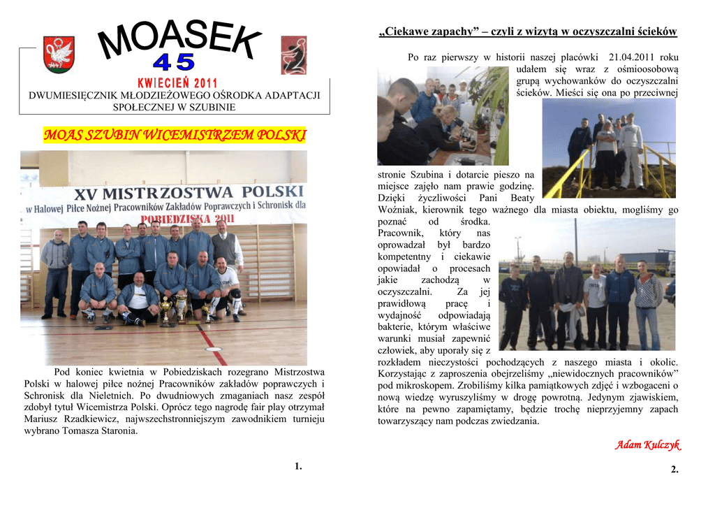 „Ciekawe zapachy” – czyli z wizytą w oczyszczalni ścieków DWUMIESIĘCZNIK MŁODZIEŻOWEGO OŚRODKA ADAPTACJI SPOŁECZNEJ W SZUBINIE Po raz pierwszy w historii naszej placówki 21.04.2011 roku udałem się wraz z ośmioosobową grupą wychowanków do oczyszczalni ścieków. Mieści się ona po przeciwnej MOAS SZUBIN WICEMISTRZEM POLSKI Pod koniec kwietnia w Pobiedziskach rozegrano Mistrzostwa Polski w halowej piłce nożnej Pracowników zakładów poprawczych i Schronisk dla Nieletnich. Po dwudniowych zmaganiach nasz zespół zdobył tytuł Wicemistrza Polski. Oprócz tego nagrodę fair play otrzymał Mariusz Rzadkiewicz, najwszechstronniejszym zawodnikiem turnieju wybrano Tomasza Staronia. stronie Szubina i dotarcie pieszo na miejsce zajęło nam prawie godzinę. Dzięki życzliwości Pani Beaty Woźniak, kierownik tego ważnego dla miasta obiektu, mogliśmy go poznać od środka. Pracownik, który nas oprowadzał był bardzo kompetentny i ciekawie opowiadał o procesach jakie zachodzą w oczyszczalni. Za jej prawidłową pracę i wydajność odpowiadają bakterie, którym właściwe warunki musiał zapewnić człowiek, aby uporały się z rozkładem nieczystości pochodzących z naszego miasta i okolic. Korzystając z zaproszenia obejrzeliśmy „niewidocznych pracowników” pod mikroskopem. Zrobiliśmy kilka pamiątkowych zdjęć i wzbogaceni o nową wiedzę wyruszyliśmy w drogę powrotną. Jedynym zjawiskiem, które na pewno zapamiętamy, będzie trochę nieprzyjemny zapach towarzyszący nam podczas zwiedzania. Adam Kulczyk 1. 2. Spływ kajakowy - przetarcie szlaków SPŁYW KAJAKOWY W dniu 15 marca 2011 roku ekipa ośmiu wychowanków pod nadzorem wychowawcówinstruktorów zainaugurowała sezon kajakowy w ZP MOAS. Jako pierwszy szlak w tym roku wybraliśmy sobie nasze rodzime rzeki: Białą Strugę i Gąsawkę. Pomimo lekkiego chłodu wszyscy kajakarze dzielnie radzili sobie w nurtach zimnych i dość bystrych rzek. Po drodze pokonaliśmy liczne jazzy spiętrzające wodę, co było dodatkową atrakcją dla wszystkich uczestników. W ostatnim etapie naszego spływu znaleźliśmy przepiękne miejsce obozowania, gdzie rozpaliliśmy ognisko. Oczywiście nie obyło się bez tradycyjnej kiełbasy, upieczonej i apetycznie skonsumowanej na terenie naszego obozowiska. Następnie odbyły się indywidualne zawody kajakowe o tytuł mistrza spływu. Zwycięzcą okazał się Przemek Szutowicz, który nieznacznie wyprzedził Karola Muskałę oraz Tomka Twardowskiego. Po emocjach sportowych wszyscy wsiedli do kajaków i dopłynęliśmy do Rynarzewa, gdzie czekał już za nami pan kierowca. Sprawnie i szybko zapakowaliśmy kajaki na przyczepę i w miłych nastrojach wróciliśmy do placówki. Czekamy już z niecierpliwością na następny spływ kajakowy. Tomasz Staroń 3 W czwartek 28 kwietnia wybraliśmy się na kolejny w tym roku spływ kajakowy. Jako cel naszej wyprawy postawiliśmy sobie trasę rzeką Noteć od Pakości do Lubostronia. Trasa naszego rajdu kajakowego była dość długa, gdyż liczyła prawie 25 km. Wypłynęliśmy z Pakości spod mostu drogowego i szybko spostrzegliśmy bardzo wysoki stan wody w rzece, dzięki czemu mieliśmy większe możliwości zwiedzania okolicy i kontemplowania przyrody. Po drodze minęliśmy trzy jeziora i po około czterech godzinach dotarliśmy do Barcina. Po kilku minutach byliśmy już u brzegu jeziora Wolickiego, gdzie dokonaliśmy konsumpcji przepysznej kiełbasy z ogniska, które wcześniej bardzo szybko i sprawnie rozpaliliśmy. Po przerwie obiadowej, pełni siły i werwy ruszyliśmy w dalszą trasę. Było ciężko, gdyż pokonanie wyżej wymienionego jeziora zajęło nam około 30 minut. Następnie wpłynęliśmy ponownie w koryto rzeki Noteć i ruszyliśmy w kierunku północnym. Po drodze napotykaliśmy liczne ptaki oraz mieliśmy możliwość zaobserwowania niszczycielskiej działalności bobrów. Po przebyciu następnych kilku kilometrów dotarliśmy do drewnianego mostu w miejscowości Lubostroń. Tam wydobyliśmy kajaki na brzeg i zapakowaliśmy je na przyczepę do wspaniałego Lublina kierowanego przez pana Jacka. Bardzo dumni i zadowoleni z przeżytej przygody wróciliśmy do placówki. Spływ kajakowy jak zwykle zorganizowali i przeprowadzili wychowawcy: Półtorak i Staroń, a uczestniczyło w nim ośmiu wychowanków uwiecznionych na zdjęciach. Tomasz Staroń 4. Już po raz czwarty przeprowadziliśmy w szkole tzw. Tydzień kolorów, który jest projektem autorstwa szubińskiego plastyka i nauczyciela, p.Grzegorza Pleszyńskiego. Akcja została wdrożona przed kilkoma laty w Zespole Szkół nr 2 w Szubinie, później kolejno obejmowała pozostałe placówki oświatowe gminy, regionu, a także poza granicami Polski. O słuszności i zainteresowaniu projektu związanego z Antydepresyjną szkołą, świadczy właśnie fakt, że tak wielu dyrektorów szkół, przedszkoli, świetlic, a przede wszystkim uczniów kontynuuje ideę p.Pleszyńskiego. Nie zapominajmy jednak, że jak mówi p.Grzegorz „Antydepresyjna Szkoła to nie tylko szkoła bez stresu. Bezstresowa szkoła jest fikcją i mrzonką. W najlepszym wypadku to pojęcie nieścisłe. Stres jest jednym z niezbędnych elementów działania. Towarzyszy nam całe życie”. Celem nadrzędnym akcji jest więc złagodzenie skutków działania stresu oraz wykorzystanie jego efektów do kształtowania pozytywnych i oczekiwanych postaw młodych ludzi. Podczas Tygodnia kolorów uczniowie powinni oderwać się w jakimś stopniu od codziennych obowiązków, zrozumieć, że szkoła to nie tylko przykry obowiązek, ale również miejsce rozwijania ich pasji, pożytecznej rozrywki. Realizacja projektu przyjmuje najróżniejsze formy, od spotkań z ciekawymi ludźmi, poprzez działania twórcze plastyczne, aktorskie, muzyczne, po kolorowy ubiór zgodny z kolorem panującym w danym dniu w szkole. Ubiór może zawierać śmieszne elementy i dodatki. Uczestnicy akcji przygotowują się do niej 