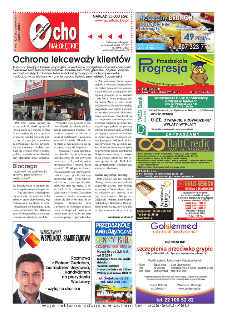 www.gazetaecho.pl DWUTYGODNIK Nr 16 (313) 10 października 2014 NAKŁAD 35 000 EGZ. Dyżury redakcyjne: BIAŁOŁĘCKIE poniedziałek–piątek 1100–1800 tel. 519-610-393 [email protected] Ochrona lekceważy klientów Głośno pikające bramki przy wyjściu wywołujące podejrzliwe spojrzenia personelu, niezdrowe zainteresowanie klientów i bardziej lub mniej grzeczne „pójdzie Pan/Pani ze mną” – każdy, kto kiedykolwiek został zatrzymany przez ochronę marketu – zakładamy, że niesłusznie – zna to uczucie irytacji, zawstydzenia i bezsilności. Pół biedy, kiedy skończy się na zajrzeniu do siatki czy torebki (swoją drogą nie wszyscy wiedzą, że nie musimy się na to zgadzać, a możemy zażądać przyjazdu policji, bo tylko ona jest uprawniona do przeszukań). Gorzej, gdy zabawa w ochroniarzy i złodziei przeciąga się w czasie. Prawie półtorej godziny spędziła w Kauflandzie przy Mehoffera nasza czytelnicz- Dlaczego maszynki nie uaktywniły alarmu przy bramce wejściowej? ka, podejrzewana o kradzież jednorazowych maszynek do golenia. – Tego dnia dzieci wcześniej wróciły ze szkoły, nie zdążyłam zrobić zakupów przed ich przyjściem, więc zostawiłam je na chwilę w domu i pojechałam do Kauflandu. Lista sprawunków była krótka. Myślałam, że po 20 minutach będę z powrotem – zaczyna swoją historię pani Jola. Wszystko szło zgodnie z planem, dopóki nie odeszła od kasy. Wtedy zapiszczała bramka i natychmiast pojawił się ochroniarz. Poprosił czytelniczkę o pokazanie zawartości torebki. Okazało się, że miała w niej kupione kilka dni wcześniej maszynki do golenia. – Zwyczajnie o nich zapomniałam. Starałam się to wytłumaczyć ochroniarzom, ale oni powtarzali jak mantrę: „uaktywnił się system antykradzieżowy i sprawę trzeba wyjaśnić”. W sklepie są kamery, więc zażądałam, aby ochrona przejrzała ich zapis i prześledziła moją drogę przez sklep – wtedy byłby dowód na to, że niczego nie ukradłam. Nikt mnie nie słuchał. W nosie mieli to, że zostawiłam małe dzieci same w domu! Zażądałam rozmowy z kimś z kierownictwa sklepu, ale nikt się do mnie nie pofatygował. Poproszono mnie o przejście do osobnego pomieszczenia, w którym jak złodzieja pilnowały mnie dwie osoby, po czym wezwano policję – opowiada kobie- ta. Zdenerwowana (dzieci przecież czekały, a izolacja w klaustrofobicznie małym pomieszczeniu powodowała dodatkowy stres) gotowa była zapłacić ponownie za te maszynki – całe 7,69 zł, bo nie mogła już dłużej czekać. Niestety, takiej możliwości nie było. Na szczęście policja przyjechała dość szybko i dopiero na wyraźne polecenie funkcjonariuszy ochroniarze zdecydowali się na przejrzenie monitoringu, choć wcześniej twierdzili, że mogą udostępnić zapis jedynie na pisemny wniosek policji lub sądu. Zrobili to po długiej rozmowie telefonicznej ze swoim szefem, bo musieli uzyskać jego zgodę. Policjanci byli bardzo zirytowani tym, że muszą czekać aż szef ochrony wyrazi zgodę na przejrzenie zapisu monitoringu. Oczywiście okazało się, że maszynki nie zostały skradzione, tym samym sprawy nie było. Padło krótkie „przepraszamy” i uznano całą sprawę za zakończoną. Bramki wejściowe milczały Pani Jola do dziś nie rozumie, dlaczego nieszczęsne maszynki nie uaktywniły alarmu przy bramce wejściowej. – Tak się zdarza. Bramka wejściowa jest szeroka, a te przy kasach węższe, dlatego bardziej czułe – wyjaśnia nam dyrekcja białołęckiego Kauflandu. Pani dyrektor podkreśla też, że w tym dniu nie była obecna w sklepie i nic jej dokończenie na stronie 2 Rozmowa z Piotrem Guziałem, burmistrzem Ursynowa, kandydatem na prezydenta Warszawy – czytaj na stronie 6 Twoja reklama odbije się Echem tel. 502-280-720 Zapraszamy do współpracy mieszkańców. Nie zwracamy materiałów niezamawianych. Zastrzegamy sobie prawo do skracania i adiustowania nadesłanych materiałów oraz opatrywania ich własnym tytułem. Nie odpowiadamy za treść reklam i ogłoszeń. dokończenie ze strony 1 nie wiadomo o tym, żeby ktokolwiek z klientów chciał z nią rozmawiać. Na pytanie, dlaczego ochroniarze nie obejrzeli zapisu monitoringu, zanim wezwali policję, odpowiada: – Takie mamy procedury. Dotyczą one nawet najtańszych rzeczy. Wzywamy policję i dopiero wtedy możemy odtworzyć zapis monitoringu – podkreśliła. Ochroniarz, który tego dnia ujął panią Jolę, nie ma wątpliwości – jego zdaniem akcja została przeprowadzona profesjonalnie. – Uaktywnił się system antykradzieżowy i pani została ujęta. Nie mam kompetencji do udzielania innych informacji – komentuje. Obiecał, że skontaktuje się z nami szef firmy chroniącej Kaufland, tak jednak się nie stało. Nie otrzymaliśmy też odpowiedzi na pytania wysłane e-mailem. Szefostwo firmy Kaufland przeprasza za sytuację, choć jedynie kurtuazyjnie i tylko dlatego, że sprawą zainteresowali się dziennikarze. Na nasze pytania odpowiada ogólnie i w zasadzie niczego się nie dowiadujemy. – Jest nam niezmiernie przykro z powodu opisanego zdarzenia i niedogodności, jakie spotkały naszą klientkę. W umowach zawartych z firmami ochroniarskimi Kaufland Polska bardzo szczegółowo określa zasady pracy, nie akceptując działań sprzecznych z polskim prawem, ani zbyt uciążliwych dla naszych klientów – mówi Grzegorz Polak z biura prasowego Kaufland Polska i dodaje, że o całym zdarzeniu poinformowany został szef działu odpowiedzialnego za współpracę z firmami ochroniarskimi. – Chciałbym zapewnić, że takie zgłoszenia traktujemy niezwykle poważnie i dołożymy wszelkich starań, by jakość obsługi była jak najlepsza, a takie sytuacje nie miały miejsca – zapewnia Polak. od tego czego ona dotyczy. Na miejscu oceniamy, czy doszło do wykroczenia, przestępstwa, czy też nic się nie stało – tłumaczy Katarzyna Balcerz z Komendy Głównej Policji. Wyjaśnia też, że