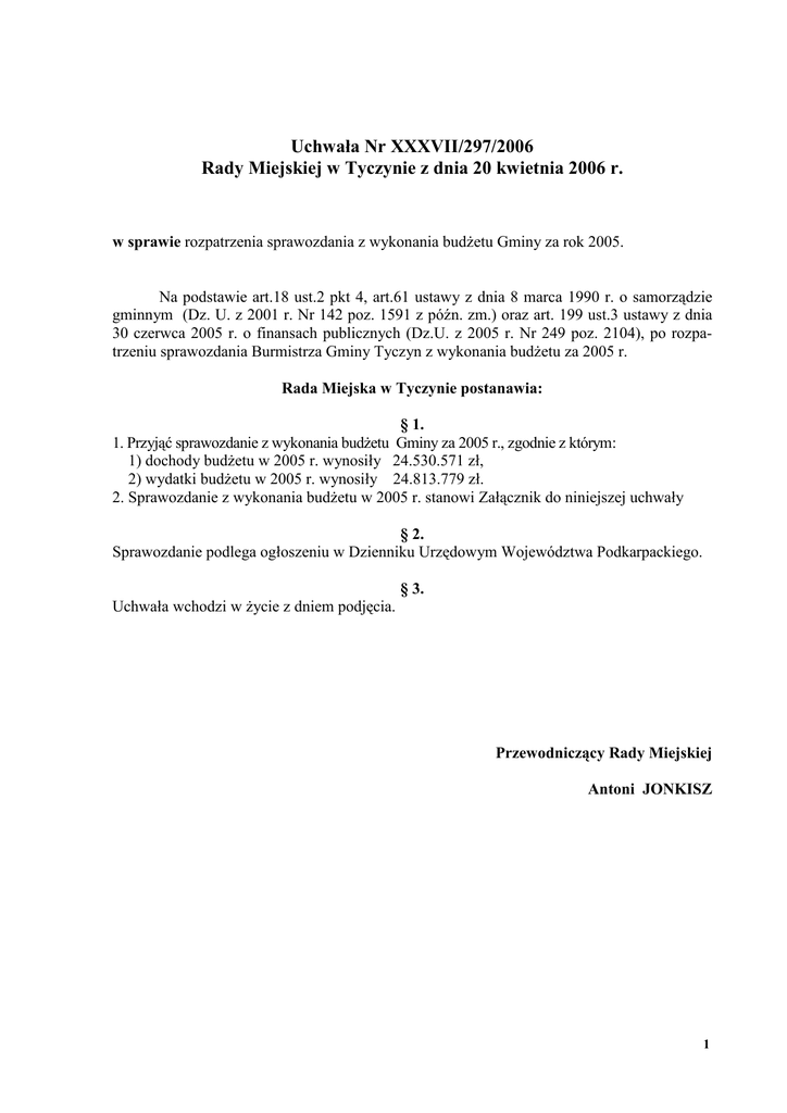 Uchwała Nr XXXVII/297/2006 Rady Miejskiej w Tyczynie z dnia 20 kwietnia 2006 r. w sprawie rozpatrzenia sprawozdania z wykonania budŜetu Gminy za rok 2005. Na podstawie art.18 ust.2 pkt 4, art.61 ustawy z dnia 8 marca 1990 r. o samorządzie gminnym (Dz. U. z 2001 r. Nr 142 poz. 1591 z późn. zm.) oraz art. 199 ust.3 ustawy z dnia 30 czerwca 2005 r. o finansach publicznych (Dz.U. z 2005 r. Nr 249 poz. 2104), po rozpatrzeniu sprawozdania Burmistrza Gminy Tyczyn z wykonania budŜetu za 2005 r. Rada Miejska w Tyczynie postanawia: § 1. 1. Przyjąć sprawozdanie z wykonania budŜetu Gminy za 2005 r., zgodnie z którym: 1) dochody budŜetu w 2005 r. wynosiły 24.530.571 zł, 2) wydatki budŜetu w 2005 r. wynosiły 24.813.779 zł. 2. Sprawozdanie z wykonania budŜetu w 2005 r. stanowi Załącznik do niniejszej uchwały § 2. Sprawozdanie podlega ogłoszeniu w Dzienniku Urzędowym Województwa Podkarpackiego. § 3. Uchwała wchodzi w Ŝycie z dniem podjęcia. Przewodniczący Rady Miejskiej Antoni JONKISZ 1 Załącznik do Uchwały Nr XXXVII/297/2006 Rady Miejskiej w Tyczynie z dnia 20 kwietnia 2006 r. Sprawozdanie z wykonania budŜetu Gminy Tyczyn za 2005 r. Uchwalony przez Radę Miejską budŜet na 2005 r. wynosił po stronie dochodów 23.271.749 zł; w ciągu roku uległ zwiększeniu do kwoty 24.435.453 zł. Zwiększenie dochodów budŜetowych o kwotę 1.253.729 zł nastąpiło z tytułu otrzymania: - subwencji oświatowej 36.662 zł, - dotacji celowych na zadania zlecone 300.187 zł, ∗ Środowiskowy Dom Samopomocy 191.250 zł; ∗ wypłatę zasiłków 40.561 zł; ∗ wybory do Sejmu i Senatu 24.120 zł; ∗ wybory Prezydenta RP 37.820 zł; ∗ wybory uzupełniające do Rady Miejskiej 6.436 zł, - dotacji celowych na zadania własne gminy 292.240 zł ∗ doŜywianie dzieci w szkołach 128.000 zł; ∗ stypendia i zasiłki szkolne 116.388 zł; ∗ wyprawki szkolne 3.872 zł; ∗ utrzymanie Ośrodka Pomocy Społecznej 9.700 zł; ∗ wypłatę zasiłków okresowych 30.400 zł; ∗ komisję kwalifikacyjną 1.300 zł; ∗ system informatyczny POMOST 2.580 zł, - dotacji na usuwanie skutków klęsk Ŝywiołowych 120.000 zł, - dotacji Ministra Kultury i Sportu na budowę hali sportowej przy Gimnazjum 200.000 zł, - dotacji Ministra Kultury i Sportu dla Publicznej Biblioteki 59.000 zł, - dotacji Wojewódzkiego Funduszu Ochrony Środowiska i Gospodarki Wodnej na zakup pomp dla OSP 3.040 zł, - pozostałych dochodów 180.600 zł, ∗ Powiatowe Biuro Pracy - refundacja wynagrodzeń 52.200 zł, ∗ wieczysta dzierŜawa gruntów 30.000 zł, ∗ zmiana planu zagospodarowania przestrzennego 20.000 zł, ∗ opłaty lokalne 11.000 zł, ∗ darowizna na remonty dróg 28.500 zł, ∗ Nadleśnictwo StrzyŜów – współfinansowanie drogi Kielnarowa Obszary Matysówka 36.600 zł, ∗ wpłaty ludności na inwestycje 2.000 zł, ∗ darowizna dla Biblioteki 300 zł; - dochodów podatkowych 62.000 zł ∗ udziały w podatku dochodowym od osób fizycznych 32.000 zł; ∗ podatek od środków transportowych 30.000 zł. Zmniejszenie dochodów o kwotę 90.025 zł nastąpiło w związku z nieotrzymaniem zaplanowanych: - wpłat ludności na wodociąg Biała Mokra Strona o kwotę 57.500 zł, 2 - wpływów z opłat za alkohole o kwotę dotacji na opłacenie składek na ubezpieczenie zdrowotne o kwotę dotacji celowych na wypłatę zasiłków stałych o kwotę dotacji celowych na wypłatę zasiłków okresowych o kwotę 6.744 zł, 5.476 zł, 305 zł, 20.000 zł. Dla sfinansowania zwiększonych wydatków w 2005 r. zaciągnięto kredyty i poŜyczki na kwotę 1.978.501 zł w tym: - poŜyczka w Wojewódzkim Funduszu Ochrony Środowiska i Gospodarki Wodnej na budowę Stacji Uzdatniania Wody w Tyczynie 994.900 zł, - kredyt w Banku Ochrony Środowiska S.A. Rzeszów na budowę kanalizacji sanitarnej Hermanowa etap II 983.601 zł. DOCHODY BUDśETOWE W wyniku wprowadzenia zmian w budŜecie gminy plan dochodów wyniósł wykonanie I. Dochody własne • z podatków i opłat lokalnych • z majątku gminy • z tytułu udziałów w podatkach PiT i CiT II. Subwencje III. Dotacje celowe IV. Refundacja środków z funduszy pomocowych V. Pozostałe dochody 24.435.453 zł 24.530.571 zł plan 7.510.965 zł 3.194.256 zł 197.100 zł 4.119.609 zł 11.006.620 zł 4.329.820 zł 1.091.246 zł 496.802 zł tj. 100,38% wykonanie 7.708.740 zł 3.202.276 zł 245.610 zł 4.260.854 zł 11.006.620 zł 4.321.803 zł 1.091.245 zł 402.163 zł Realizacja dochodów w poszczególnych działach Dział 400 600 700 710 750 751 754 756 758 801 Nazwa działu Wytwarzanie i zaopatrywanie w energię elektryczną, gaz i wodę Transport i łączność Gospodarka mieszkaniowa Działalność usługowa Administracja publiczna Urzędy naczelnych organów władzy, kontroli i ochrony prawa Bezpieczeństwo publiczne i ochrona przeciwpoŜarowa Dochody od osób prawnych, od osób fizycznych i od innych jednostek nie posiadających osobowości prawnej RóŜne rozliczenia Oświata i wychowanie Plan (w zł) Wykonanie (w zł) % planu 167.500 115.860 69,17 467.218 197.100 20.000 186.424 462.217 98.92 245.610 124,61 20.000 100,00 186.555 100,07 70.691 70.286 99,42 10.040 10.040 100,00 7.343.865 7.486.461 101,94 11.005.620 250.647 11.014.388 100,07 250.646 100,00 3 851 852 854 900 921 Ochrona zdrowia Pomoc społeczna Edukacyjna opieka wychowawcza Gospodarka komunalna i ochrona środowiska Kultura i ochrona dziedzictwa narodowego Razem: 3.619.110 116.388 921.550 200 100,00 3.615.178 99,89 109.241 93,85 884.589 95,98 59.300 59.300 100,00 24.435.453 24.530.571 100,38 Dział 400. Wytwarzanie i zaopatrywanie w energię elektryczną, gaz i wodę plan 167.500 zł wykonanie 115.860 zł tj. 69,17% Wpłaty ludności na budowę wodociągów i gazociągów: Lp. Nazwa zadania 1. Wodociąg Hermanowa Łazy 2. Wodociąg Kielnarowa Zawodzie 3. Wodociąg Borek Stary 4. Wodociąg Matysówka 5. Wodociąg Biała Mokra Strona 6. Gaz Kielnarowa Razem: - wpłata za koncesję 100 zł Dział 600. Transport