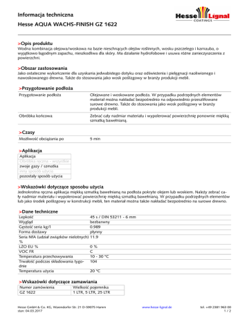 Informacja techniczna Hesse AQUA WACHS-FINISH GZ 1622 >Opis produktu Wodna kombinacja olejowa/woskowa na bazie nieschnących olejów roślinnych, wosku pszczelego i karnauba, o wyjątkowo łagodnym zapachu, nieszkodliwa dla skóry. Ma działanie hydrofobowe i usuwa różne zanieczyszczenia z powierzchni. >Obszar zastosowania Jako ostateczne wykończenie dla uzyskania jedwabistego dotyku oraz odświeżenia i pielęgnacji naoliwionego i nawoskowanego drewna. Także do stosowania jako wosk poślizgowy w branży produkcji mebli. >Przygotowanie podłoża Przygotowanie podłoża Olejowane i woskowane podłoża. W przypadku podrzędnych elementów materiał można nakładać bezpośrednio na odpowiednio przeszlifowane surowe drewno. Także do stosowania jako wosk poślizgowy w branży produkcji mebli. Obróbka końcowa Zebrać cały nadmiar materiału i wypolerować powierzchnię ponownie miękką szmatką bawełnianą. >Czasy Możliwość obciążania po 5 min >Aplikacja Aplikacja Obróbka ręczna - wszystkie zwoje gazy / szmatka inny sposób użycia pozostały sposób użycia >Wskazówki dotyczące sposobu użycia Jednokrotna ręczna aplikacja miękką szmatką bawełnianą na podłoża pokryte olejem lub woskiem. Należy zebrać cały nadmiar materiału i wypolerować powierzchnię miękką szmatką bawełnianą. W przypadku podrzędnych elementów lub jako środek poślizgowy w konstrukcji mebli, ten materiał można także nakładać bezpośrednio na surowe drewno. >Dane techniczne Lepkość 45 s / DIN 53211 - 6 mm Wygląd bezbarwny Gęstość seria kg/l 0.989 Forma dostawy płynny Seria NfA (udział związków nielotnych) 11.9 % LZO EU % 0% VOC FR C Temperatura przechowywania 10 - 30 °C Trwałość podczas składowania tygo- 104 dnie Temperatura użycia 20 °C >Wskazówki dotyczące zamawiania Numer zamówienia GZ 1622 Wielkość pojemnika 1 LTR, 5 LTR, 25 LTR Hesse GmbH & Co. KG, Warendorfer Str. 21 D-59075 Hamm stan: 04.03.2017 www.hesse-lignal.de tel. +49 2381 963 00 1/2 Informacja techniczna Hesse AQUA WACHS-FINISH GZ 1622 >Wskazówki specjalne Nie występuje niebezpieczeństwo samozapłonu. Produkt nie zawiera olejów wysychających utleniająco! Gruntowanie wstępne - w zależności od wymagań dla gotowej powierzchni oraz od materiału nośnego - jest możliwe na przykład przy zastosowaniu materiału GE 11025-2001, GE 12006-2001, GE 14004-2001 lub GE 17102. Przed czyszczeniem i odświeżeniem powłok, których dokładna struktura nie jest znana, należy koniecznie wykonać próbę w podrzędnym miejscu! >Przykład procedury Wyposażenie pokoju dziecięcego, klon naturalny Szlifowanie drewna: papierem o ziarnistości 180 - 220 z późniejszym odpyleniem. Podkład: 1 x 40 - 60 g/m² Żywica woskowa Proterra RESIT GS 17102. Suszenie: ok. 30 - 60 min / 20 °C temperatury pokojowej z wystarczającą cyrkulacją powietrza. Szlif polerujący: papierem 400 z późniejszym odpyleniem. Ostateczne wykończenie: ręczna aplikacja Wosku Hesse AQUA WACHS-FINISH GZ 1622 za pomocą miękkiej szmatki bawełnianej. Zdjąć nadmiar materiału i wypolerować powierzchnię miękką szmatką bawełnianą. >Wskazówki ogólne Malowanie próbne należy przeprowadzić w warunkach odpowiadającym rzeczywistym! >Szczególne właściwości i normy kontrolne Norma / podstawa Bezpieczeństwo zabawek DIN EN 71-3 (2002-11) Receptura nie zawiera: środków do ochrony drewna, trujących metali ciężkich, zmiękczaczy ftalowych, formaldehydu, substancji CMR w kategorii 1 + 2 ani lotnych związków aromatycznych i halogenoorganicznych. Placówka kontro- Znak lna HESSE Sprawozdanie Nr HESSE Nasze informacje techniczne są na bieżąco aktualizowane pod kątem stanu wiedzy technicznej i przepisów prawa. Podane wartości nie oznaczają specyfikacji, są to typowe dane produktów. Zawsze aktualną wersję można zobaczyć w Internecie na stronie www.hesse-lignal.de lub uzyskać od Państwa opiekuna klienta. Dane te mają charakter doradczy, opierają się na dobrej wierze i starannych badaniach zgodnie z aktualnym stanem techniki. Informacje te nie mają charakteru prawnie wiążącego. Oprócz tego odsyłamy Państwa do naszych warunków handlowych. Karta charakterystyki jest udostępniona zgodnie z rozporządzeniem (WE) nr 1907/2006. Hesse GmbH & Co. KG, Warendorfer Str. 21 D-59075 Hamm stan: 04.03.2017 www.hesse-lignal.de tel. +49 2381 963 00 2/2