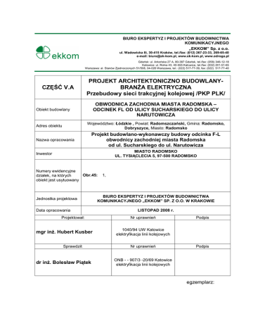 BIURO EKSPERTYZ I PROJEKTÓW BUDOWNICTWA KOMUNIKACYJNEGO „EKKOM” Sp. z o.o. ul. Wadowicka 8i, 30-415 Kraków, tel./fax: (012) 267-23-33, 269-65-40 e-mail: [email protected], www.ek-kom.pl, www.edroga.pl Gdańsk: ul. Arkońska 27 A, 80-387 Gdańsk, tel./fax: (058) 346-12-18 Katowice: ul. Rolna 43, 40-555 Katowice, tel./fax: (032) 201-51-65 Warszawa: al. Stanów Zjednoczonych 51/508, 04-026 Warszawa, tel.: (022) 517-77-39, fax: (022) 517-77-40 CZĘŚĆ V.A PROJEKT ARCHITEKTONICZNO BUDOWLANYBRANśA ELEKTRYCZNA Przebudowy sieci trakcyjnej kolejowej /PKP PLK/ OBWODNICA ZACHODNIA MIASTA RADOMSKA – ODCINEK FL OD ULICY SUCHARSKIEGO DO ULICY NARUTOWICZA Obiekt budowlany Województwo: Łódzkie , Powiat: Radomszczański, Gmina: Radomsko, Dobryszyce, Miasto: Radomsko Adres obiektu Nazwa opracowania Projekt budowlano-wykonawczy budowy odcinka F-L obwodnicy zachodniej miasta Radomska od ul. Sucharskiego do ul. Narutowicza MIASTO RADOMSKO UL. TYSIĄCLECIA 5, 97-500 RADOMSKO Inwestor Numery ewidencyjne Obr.45: działek, na których obiekt jest usytuowany Jednostka projektowa Data opracowania Projektował: mgr inŜ. Hubert Kusber Sprawdził: dr inŜ. Bolesław Piątek 1, BIURO EKSPERTYZ I PROJEKTÓW BUDOWNICTWA KOMUNIKACYJNEGO „EKKOM” SP. Z O.O. W KRAKOWIE LISTOPAD 2008 r. Nr uprawnień Podpis 1040/94 UW Katowice elektryfikacja linii kolejowych Nr uprawnień Podpis ONB - - 907/3 -20/69 Katowice elektryfikacja linii kolejowych egzemplarz: Projekt obwodnicy zachodniej miasta Radomska – odcinek F – L – opis techniczny do projektu budowlano – wykonawczego Przebudowy sieci trakcyjnej kolejowej /PKP PLK/ SPIS ZAWARTOŚCI OPRACOWANIA Lp. Nazwa Nr strony 1 Strona tytułowa 1 2 Spis zawartości opracowania 2 2 Oświadczenie projektanta i sprawdzającego 3 3 Opis techniczny 4 4 Zestawienie podstawowych robót 14 5 Karty montaŜowe – szt. 2 16 6 Załączniki 19 Rysunki: nr rysunku 7 Plan orientacyjny 01 8 Plan sytuacyjny km 184,865 – 185,990 02 9 Profilowanie sieci trakcyjnej pod wiaduktem w km 185,438 03 BEiPBK „EKKOM” Sp. z o.o. wersja 11.2008 2 Projekt obwodnicy zachodniej miasta Radomska – odcinek F – L – opis techniczny do projektu budowlano – wykonawczego Przebudowy sieci trakcyjnej kolejowej /PKP PLK/ Kraków, listopad 2008 r. OŚWIADCZENIE ZGODNIE Z ARTYKUŁEM 20 UST. 4 USTAWY Z DNIA 07 LIPCA 1994 r. „PRAWO BUDOWLANE” (z późniejszymi zmianami), OŚWIADCZAM, śE PROJEKT BUDOWLANO-WYKONAWCZY BUDOWY ODCINKA F-L OBWODNICY ZACHODNIEJ MIASTA RADOMSKA (OD UL. SUCHARSKIEGO DO UL. NARUTOWICZA) W ZAKRESIE BRANśY ELEKTRYCZNEJ - PRZEBUDOWA SIECI TRAKCYJNEJ KOLEJOWEJ /PKP PLK/ ZOSTAŁ SPORZĄDZONY ZGODNIE Z OBOWIĄZUJĄCYMI PRZEPISAMI ORAZ ZASADAMI WIEDZY TECHNICZNEJ. DOKUMENTACJA NINIEJSZA JEST KOMPLETNA Z PUNKTU WIDZIENIA CELU, KTÓREMU MA SŁUśYĆ. PROJEKTANT ................................................ SPRAWDZAJĄCY ................................................ BEiPBK „EKKOM” Sp. z o.o. wersja 11.2008 3 Projekt obwodnicy zachodniej miasta Radomska – odcinek F – L – opis techniczny do projektu budowlano – wykonawczego Przebudowy sieci trakcyjnej kolejowej /PKP PLK/ I. OPIS TECHNICZNY Do projektu budowlanego - wykonawczego branŜy sieć trakcyjna kolejowa - odcinek F-L Zgodny z § 11 ust. 2 Rozporządzenia MI z dnia 10.07.2003 r. w sprawie szczegółowego zakresu i formy projektu budowlanego (Dz. U. Nr 120, poz.1133) BEiPBK „EKKOM” Sp. z o.o. wersja 11.2008 4 Projekt obwodnicy zachodniej miasta Radomska – odcinek F – L – opis techniczny do projektu budowlano – wykonawczego Przebudowy sieci trakcyjnej kolejowej /PKP PLK/ SPIS TREŚCI nr strony OŚWIADCZENIE 3 I. OPIS TECHNICZNY 4 1. PRZEDMIOT I PODSTAWA OPRACOWANIA 6 2. NORMY I DOKUMENTY ZWIĄZANE 7 2.1. Normy. 7 2.2. Dokumenty związane 8 3. OPIS STANU ISTNIEJĄCEGO 10 4. OPIS STANU PROJEKTOWANEGO 10 4.1. Zakres projektu 10 4.2. Typ sieci trakcyjnej 10 4.3. Konstrukcje wsporcze i fundamenty 11 4.4. Sieć jezdna 12 4.5. Ochrona odgromowa i przeciwporaŜeniowa. 12 5. GOSPODARKA ODPADAMI 12 6. PRZEPISY BHP 13 7. UWAGI OGÓLNE. 13 8. ZESTAWIENIE PODSTAWOWYCH ROBÓT I MATERIAŁÓW 14 8.1. Konstrukcje wsporcze ( montaŜ i demontaŜ ) 14 8.2. Sieć jezdna ( montaŜ i demontaŜ ) 15 9. KARTY MONTAśOWE ZAŁĄCZNIKI BEiPBK „EKKOM” Sp. z o.o. wersja 11.2008 16 19 5 Projekt obwodnicy zachodniej miasta Radomska – odcinek F – L – opis techniczny do projektu budowlano – wykonawczego Przebudowy sieci trakcyjnej kolejowej /PKP PLK/ 1. PRZEDMIOT I PODSTAWA OPRACOWANIA Przedmiotem opracowania jest projekt budowy zachodniej obwodnicy miasta Radomska, na odcinku od ulicy Sucharskiego do skrzyŜowania ulic Narutowicza, Sikorskiego, Piotrkowskiej i Dobryszyckiej, zlokalizowanego przy północnej granicy miasta Radomska. Projektowana obwodnica krzyŜuje, w km 185,438, linię kolejową nr 1 relacji Warszawa – Katowice. W ramach budowy odcinka F-L, nad linią kolejową zostanie wykonany wiadukt kolejowy. Niniejsze opracowanie obejmuje przebudowę i profilowanie kolejowej sieci trakcyjnej. Podstawę opracowania stanowią: • umowa nr TIN.52/08 z dnia 27 maja 2008 r. zawarta pomiędzy Urzędem Miasta Radomska, a Biurem Ekspertyz i Projektów Budownictwa Komunikacyjnego „EKKOM” sp. z o.o. w Krakowie • Specyfikacja Istotnych Warunków Zamówienia • Koncepcja zachodniej miasta Radomska – odcinek F-L (2006r) wraz z późniejszymi opracowaniami – opracowana przez Biuro Ekspertyz i Projektów Budownictwa Komunikacyjnego „EKKOM” sp. z o.o. w Krakowie, • Projekt budowlano-wykonawczy obwodnicy zachodniej miasta Radomska – odcinek C-F (2006r.) – opracowany przez Biuro Ekspertyz i Projektów Budownictwa Komunikacyjnego „EKKOM” sp. z o.o. w Krakowie, • badania geotechniczne wykonane przez firmę „NPG” w Częstochowie, • mapa do celów projektowych i pomiary geodezyjne uzupełniające wykonane przez firmę Geomap s.c. Andrzej Klimczak, Marek Osumek, ul. Warszyca 17, 97-500 Radomsko • 