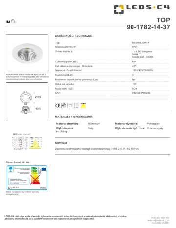 TOP 90-1782-14-37 IN WŁAŚCIWOŚCI TECHNICZNE Wykończenie zdjęcia może nie zgadzać się z wykończeniem nr referencyjnego. Dla określenia rzeczywistego zobacz opis wykończenia. Typ: DOWNLIGHTY Stopień ochrony IP: IP54 Źródło światła 1: 1 x LED Bridgelux 5,5W Ciepła biel - 3000K Całkowity pobór (W): 6,5 Kąt układu optycznego / Odbłyśnik: 42º Napięcie / Częstotliwość: 100-240V/50-60Hz Gwarancja (Lat): 2 Możliwość przedłużenia gwarancji (Lat): No Sztuk na pudełko: 100 Masa netto (kg): 0.21 EAN: 8435381406295 MATERIAŁY / WYKOŃCZENIA Materiał struktury: Aluminium Materiał dyfuzora: Poliwęglan Wykończenie struktury: Biały Wykończenie dyfuzora: Przezroczysty OSPRZĘT Zawiera elektroniczny osprzęt wielonapięciowy. (110-240 V / 50-60 Hz) Pobierz format .ldt / .ies Kliknij na zdjęcie aby pobrać etykietę energetyczną. LEDS-C4 zastrzega sobie prawo do wykonania stosownych zmian technicznych w celu udoskonalenia właściwości produktu. Zalecamy skontaktować się z działem handlowym dla wyjaśnienia jakiejkolwiek wątpliwości. (+34) 973 468 100 [email protected] www.leds-c4.com Luminaire Code 90-1782-14-37 Name Downlight led TOP 5,5W Line Eulumdat Measurem. Code 90-1782-14-37 Name Downlight led TOP 5,5W Date 18-11-2014 Lamp Code Number Position Efficiency 100.00% Coordinate system CG Total Flux Maximum value 455.02 cd Position C=0.00 G=0.00 Double Symmetrical 89 mm 56 mm Height Height 90-1782-14-37 1 345.29 lm Round Luminaire Round Luminous Area Diam. Diam. Horizontal Luminous Area Emitting area on Plane 0° Emitting area on Plane 90° 0.002463 m2 0.000000 m2 0.000000 m2 Emitting area on Plane 180° Emitting area on Plane 270° Glare area at 76° 0.000000 m2 0.000000 m2 0.000596 m2 Symmetry Type Measurement Distance Double Symmetrical 0.00 Maximum Gamma Angle Measurement Flux 90 345.29 lm Operator Temperature Humidity Notes Asselum T3 25.00 °C 60.00 % Source voltage Source current Photocell Line Eulumdat Code 90-1782-14-37 C.I.E. F UTE 4 mm 0 mm Luminaire Lamps Name 90-1782-14-37 - 7.00 W 88 97 99 100 100 1.00 A D DIN 5040 B NBN Flux [lm] 345.29 Pow. [W] Q.ty 7.00 1 A60 BZ 1 Diam=89mm 90 Gamma Angles 180° 120° 0 100 105° 105° 180 270 90° 90° C Halfplanes 180.0 0.0 270.0 90.0 100 75° 75° 200 60° 60° 300 ULOR 0.00 % DLOR 100.00 % RN 45° 45° 400 0.00 % cd 500 30° LITESTAR (c)OxyTech Srl www.oxytech.it 15° 0° 15° 30° Page 1