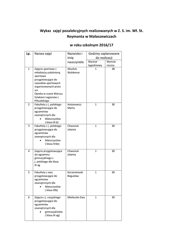 Zajęcia pozalekcyjne 2016/17 - Zespół Szkół im. Władysława