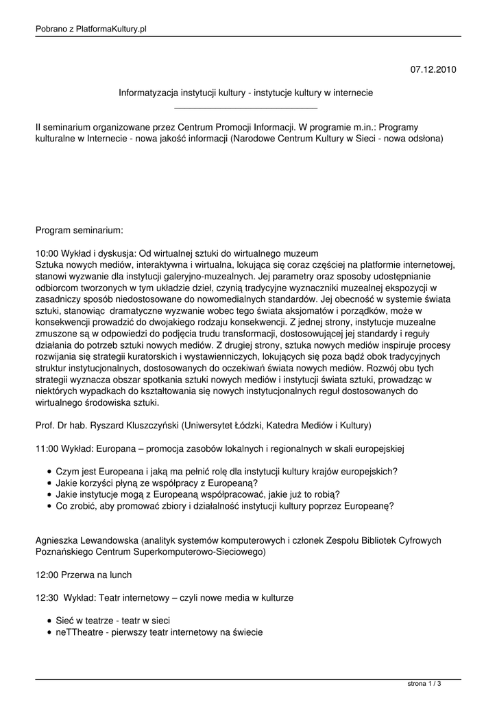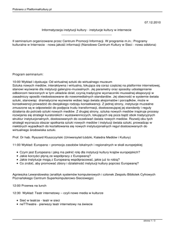 Pobrano z PlatformaKultury.pl 07.12.2010 Informatyzacja instytucji kultury - instytucje kultury w internecie ____________________________ II seminarium organizowane przez Centrum Promocji Informacji. W programie m.in.: Programy kulturalne w Internecie - nowa jakość informacji (Narodowe Centrum Kultury w Sieci - nowa odsłona) Program seminarium: 10:00 Wykład i dyskusja: Od wirtualnej sztuki do wirtualnego muzeum Sztuka nowych mediów, interaktywna i wirtualna, lokująca się coraz częściej na platformie internetowej, stanowi wyzwanie dla instytucji galeryjno-muzealnych. Jej parametry oraz sposoby udostępnianie odbiorcom tworzonych w tym układzie dzieł, czynią tradycyjne wyznaczniki muzealnej ekspozycji w zasadniczy sposób niedostosowane do nowomedialnych standardów. Jej obecność w systemie świata sztuki, stanowiąc dramatyczne wyzwanie wobec tego świata aksjomatów i porządków, może w konsekwencji prowadzić do dwojakiego rodzaju konsekwencji. Z jednej strony, instytucje muzealne zmuszone są w odpowiedzi do podjęcia trudu transformacji, dostosowującej jej standardy i reguły działania do potrzeb sztuki nowych mediów. Z drugiej strony, sztuka nowych mediów inspiruje procesy rozwijania się strategii kuratorskich i wystawienniczych, lokujących się poza bądź obok tradycyjnych struktur instytucjonalnych, dostosowanych do oczekiwań świata nowych mediów. Rozwój obu tych strategii wyznacza obszar spotkania sztuki nowych mediów i instytucji świata sztuki, prowadząc w niektórych wypadkach do kształtowania się nowych instytucjonalnych reguł dostosowanych do wirtualnego środowiska sztuki. Prof. Dr hab. Ryszard Kluszczyński (Uniwersytet Łódzki, Katedra Mediów i Kultury) 11:00 Wykład: Europana – promocja zasobów lokalnych i regionalnych w skali europejskiej Czym jest Europeana i jaką ma pełnić rolę dla instytucji kultury krajów europejskich? Jakie korzyści płyną ze współpracy z Europeaną? Jakie instytucje mogą z Europeaną współpracować, jakie już to robią? Co zrobić, aby promować zbiory i działalność instytucji kultury poprzez Europeanę? Agnieszka Lewandowska (analityk systemów komputerowych i członek Zespołu Bibliotek Cyfrowych Poznańskiego Centrum Superkomputerowo-Sieciowego) 12:00 Przerwa na lunch 12:30 Wykład: Teatr internetowy – czyli nowe media w kulturze Sieć w teatrze - teatr w sieci neTTheatre - pierwszy teatr internetowy na świecie strona 1 / 3 Pobrano z PlatformaKultury.pl Rewolucja technologiczna -eksplozja systemów komunikacji- ewolucja percepcji-entropia obecności Internauta - widz pozornie nieobecny Tomasz Rodowicz (Stowarzyszenie Teatralne Chorea) 13:10 Wykład: Lokalne instytucje kultury w internecie - blaski i cienie wirtualnego oblicza Lokalne instytucje kultury wobec internetu i swojej w nim obecności (stosunek do idei - koncepcja jej realizacji - możliwości techniczne - potencjalni odbiorcy i ich kompetencje) Wirtualne oblicza lokalnych instytucji kultury: typowe mankamenty internetowych autoprezentacji – możliwości ich usunięcia (na przykładach) Jak być może? (wzorce pozytywne) Dlaczego warto podjąć wysiłek? dr Wojciech Mazur (Instytut Studiów Regionalnych, Uniwersytet Jagielloński) 13:50 Case study: Programy kulturalne w Internecie – nowa jakość informacji (Narodowe Centrum Kultury w Sieci – nowa odsłona) Platforma Kultury – kompleksowy serwis informacyjno-kulturalny – platforma obejmująca m.in. dedykowane strony programów NCK (m.in. Kadra Kultury, Obserwatorium Kultury i inne) Mapa Kultury – nowopowstający interaktywny portal społecznościowy Kultura się liczy! – blog kampanii społecznej Akcje w Internecie – internetowy konkurs kultura się liczy na najlepszy film – prowadzony wspólnie z Telewizją Polską na stronie itvp.pl Strona NCK na facebook-u Karolina Szczepanowska (Narodowe Centrum Kultury) 14:10 Przerwa na kawę 14:30 Wykład: Promocja instytucji kultury w Internecie Komunikacja internetowa i aktywność w serwisach web2.0 (blogi, serwisy społecznościowe) Być albo nie być w wyszukiwarce (kilka uwag o pozycjonowaniu) Reklama kultury w Internecie (jak korzystać z możliwości reklamowych i promocyjnych w Internecie) Dominik Pokornowski (Centrum Sztuki Współczesnej "Znaki czasu" w Toruniu) 15:20 Wykład i konsultacje: Prawo autorskie – z uwzględnieniem specyfiki instytucji kultury Problemy przekładów, adaptacji, etc Prawo autorskie a prawo własności Nadzór autorski – problemy prawne Problem plagiatu – próby rozwiązań prawnych strona 2 / 3 Pobrano z PlatformaKultury.pl Mec. Rafał Golat (Ministerstwo Kultury i Dziedzictwa Narodowego – Departament Prawny) 16:00 Zakończenie programu, wręczenie certyfikatów. Więcej o seminarium strona 3 / 3