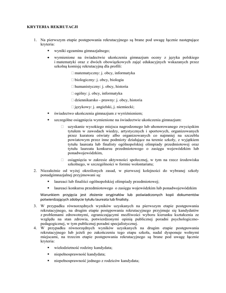 KRYTERIA REKRUTACJI 1. Na pierwszym etapie postępowania rekrutacyjnego są brane pod uwagę łącznie następujące kryteria: wyniki egzaminu gimnazjalnego; wymienione na świadectwie ukończenia gimnazjum oceny z języka polskiego i matematyki oraz z dwóch obowiązkowych zajęć edukacyjnych wskazanych przez szkolną komisję rekrutacyjną dla profili: matematyczny: j. obcy, informatyka biologiczny: j. obcy, biologia humanistyczny: j. obcy, historia ogólny: j. obcy, informatyka dziennikarsko - prawny: j. obcy, historia językowy: j. angielski, j. niemiecki; świadectwo ukończenia gimnazjum z wyróżnieniem; szczególne osiągnięcia wymienione na świadectwie ukończenia gimnazjum: uzyskanie wysokiego miejsca nagrodzonego lub uhonorowanego zwycięskim tytułem w zawodach wiedzy, artystycznych i sportowych, organizowanych przez kuratora oświaty albo organizowanych co najmniej na szczeblu powiatowym przez inne podmioty działające na terenie szkoły, z wyjątkiem tytułu laureata lub finalisty ogólnopolskiej olimpiady przedmiotowej oraz tytułu laureata konkursu przedmiotowego o zasięgu wojewódzkim lub ponadwojewódzkim, osiągnięcia w zakresie aktywności społecznej, w tym na rzecz środowiska szkolnego, w szczególności w formie wolontariatu; 2. Niezależnie od wyżej określonych zasad, w pierwszej kolejności do wybranej szkoły ponadgimnazjalnej przyjmowani są: laureaci lub finaliści ogólnopolskiej olimpiady przedmiotowej; laureaci konkursu przedmiotowego o zasięgu wojewódzkim lub ponadwojewódzkim Warunkiem przyjęcia jest złożenie oryginałów lub poświadczonych kopii dokumentów potwierdzających zdobycie tytułu laureata lub finalisty. 3. W przypadku równorzędnych wyników uzyskanych na pierwszym etapie postępowania rekrutacyjnego, na drugim etapie postępowania rekrutacyjnego przyjmuje się kandydatów z problemami zdrowotnymi, ograniczającymi możliwości wyboru kierunku kształcenia ze względu na stan zdrowia, potwierdzonymi opinią publicznej poradni psychologicznopedagogicznej, w tym publicznej poradni specjalistycznej. 4. W przypadku równorzędnych wyników uzyskanych na drugim etapie postępowania rekrutacyjnego lub jeżeli po zakończeniu tego etapu szkoła, nadal dysponuje wolnymi miejscami, na trzecim etapie postępowania rekrutacyjnego są brane pod uwagę łącznie kryteria: wielodzietność rodziny kandydata; niepełnosprawność kandydata; niepełnosprawność jednego z rodziców kandydata; niepełnosprawność obojga rodziców kandydata; niepełnosprawność rodzeństwa kandydata; samotne wychowywanie kandydata w rodzinie; objęcie kandydata pieczą zastępczą. Kryteria mają jednakową wartość.