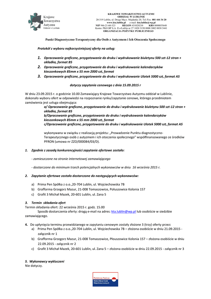 KRAJOWE TOWARZYSTWO AUTYZMU ODDZIAŁ W LUBLINIE 20-319 Lublin, ul. Droga Męcz. Majdanka 20, Tel./Fax. 081 444 34 20 www.kta.lublin.pl e-mail: [email protected] NIP 946-21-60-323 REGON 431020210 KRS 0000055648 Konto: PKO BP S.A. II o/Lublin nr 27 1020 3150 0000 3002 0030 5441 ORGANIZACJA POŻYTKU PUBLICZNEGO Punkt Diagnostyczno-Terapeutyczny dla Osób z Autyzmem i Ich Otoczenia Społecznego Protokół z wyboru najkorzystniejszej oferty na usług: 1. Opracowanie graficzne, przygotowanie do druku i wydrukowanie biuletynu 500 szt-12 stron + 2. 3. okładka, format B5 Opracowanie graficzne, przygotowanie do druku i wydrukowanie kalendarzyków kieszonkowych 85mm x 55 mm 2000 szt, format Opracowanie graficzne, przygotowanie do druku i wydrukowanie Ulotek 5000 szt, format A5 dotyczy zapytania cenowego z dnia 15.09.2015 r W dniu 23.09.2015 r. o godzinie 10.00 Zamawiający Krajowe Towarzystwo Autyzmu oddział w Lublinie, dokonało wyboru ofert w odpowiedzi na rozpoznanie rynku/zapytanie cenowe, którego przedmiotem zamówienia jest usługa obejmująca: a/ Opracowanie graficzne, przygotowanie do druku i wydrukowanie biuletynu 500 szt-12 stron + okładka, format B5 b/Opracowanie graficzne, przygotowanie do druku i wydrukowanie kalendarzyków kieszonkowych 85mm x 55 mm 2000 szt, format c/Opracowanie graficzne, przygotowanie do druku i wydrukowanie Ulotek 5000 szt, format A5 wykonywana w związku z realizacją projektu: „Prowadzenie Punktu diagnostycznoTerapeutycznego osób z autyzmem i ich otoczenia społecznego” współfinansowanego ze środków PFRON (umowa nr ZZO/000084/03/D). 1. Zgodnie z zasadą konkurencyjności zapytanie ofertowe zostało: - zamieszczone na stronie internetowej zamawiającego - dostarczone do minimum trzech potencjalnych wykonawców w dniu 16 września 2015 r. 2. Zapytanie ofertowe zostało dostarczone do następujących wykonawców: a) Prima Pen Spółka z o.o.,20-704 Lublin, ul. Wojciechowska 7B b) Grafforma Grzegorz Mazur, 21-008 Tomaszowice, Połuszowice Kolonia 157 c) Grafit 3 Michał Mazek, 20-601 Lublin, ul. Zana 5 3. Termin składania ofert Termin składania ofert: 22 września 2015 r. godz. 15.00 Sposób dostarczenia oferty: drogą e-mail na adres: [email protected] lub osobiście w siedzibie zamawiającego. 4. Do upłynięcia terminu przewidzianego w zapytaniu cenowym zostały złożone 3 (trzy) oferty przez: a) Prima Pen Spółka z o.o.,20-704 Lublin, ul. Wojciechowska 7B – złożona osobiście w dniu 21.09.2015 załącznik nr 1 b) Grafforma Grzegorz Mazur, 21-008 Tomaszowice, Płouszowice Kolonia 157 – złożona osobiście w dniu 22.09.2015 - załącznik nr 2 c) Grafit 3 Michał Mazek, 20-601 Lublin, ul. Zana 5 – złożona osobiście w dniu 22.09.2015 - załącznik nr 3 5. Wykonawcy wykluczeni Nie dotyczy. KRAJOWE TOWARZYSTWO AUTYZMU ODDZIAŁ W LUBLINIE 20-319 Lublin, ul. Droga Męcz. Majdanka 20, Tel./Fax. 081 444 34 20 www.kta.lublin.pl e-mail: [email protected] NIP 946-21-60-323 REGON 431020210 KRS 0000055648 Konto: PKO BP S.A. II o/Lublin nr 27 1020 3150 0000 3002 0030 5441 ORGANIZACJA POŻYTKU PUBLICZNEGO Punkt Diagnostyczno-Terapeutyczny dla Osób z Autyzmem i Ich Otoczenia Społecznego 6. Oferty odrzucone nie ma 7. Wybór oferty W związku z zapytaniem wpłynęły następujące oferty Lp. Nazwa Proponowana cena Uwagi 1 Prima Pen Spółka z o.o. 7.029,45 zł Oferta spełnia warunki zapytania 2 Grafforma Grzegorz Mazur 6.049,14 zł Oferta spełnia warunki zapytania 3 Grafit 3 Michał Mazek 7.749,00 zł Oferta spełnia warunki zapytania Wszystkie oferty spełniły warunki zapytania pod względem formalnym. Wybór najkorzystniejszej oferty został dokonany na podstawie oferowanej ceny. Do wykonania usługi wybrano ofertę: Grafforma Grzegorz Mazur z siedzibą 21-008 Tomaszowice, Płouszowice Kolonia 157 Postępowanie przeprowadził: Teresa Wojtachnia - Członek Zarządu KTA Lublin Agnieszka Lenard – specjalista ds. KTA Lublin