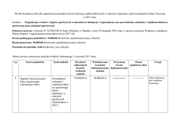 Wyniki Konkursu ofert dla organizacji pozarządowych na realizację zadań publicznych w zakresie wspierania i upowszechniania kultury fizycznej w 2017 roku Konkurs - Organizacja eventów i imprez sportowych o charakterze lokalnym i regionalnym oraz prowadzenie szkolenia i współzawodnictwa sportowego poza sekcjami sportowymi. Podstawa prawna: Uchwała Nr XXXII/390/16 Rady Miejskiej w Słupsku z dnia 30 listopada 2016 roku w sprawie przyjęcia Programu współpracy Miasta Słupska z organizacjami pozarządowymi na 2017 rok. Kwota podlegająca podziałowi: 50.000,00 zł (słownie: pięćdziesiąt tysięcy złotych) Rozdysponowano: 50.000,00 zł (słownie: pięćdziesiąt tysięcy złotych) Pozostało do podziału: 0,00 zł (słownie: zero złotych) Tabela zawiera zestawienie podziału środków dokonanego 13 stycznia 2017 roku. Lp 1 Nazwa podmiotu Słupskie Stowarzyszenie Tańca Sportowego Cheerleaders Maxi Tytuł zadania Wysokość całkowitych kosztów realizacji zadania Prowadzenie szkolenia i współzawodnict wa sportowego dzieci, młodzieży w sekcjach sportowych Cheerleaders w 2017 r. 35.600,00 zł Wnioskowana Przyznana Ocena wysokość kwota punktowa ofert dofinansowania dofinansowania zadania 20.000,00 zł --------------- ------------- Uwagi Oferta odrzucona pod względem formalnym 2 Uczniowski Klub Sportowy Byki przy SP 3 Słupsk XVI halowy Turniej Piłki Nożnej „Niepodległość – Słupsk 2017” 4.800,00 zł 3.400,00 zł 1.450,00 zł 38 3 Fundacja Indygo Zawody sprawnościowe – Pokaż swoją siłę, zwinność i sprawność 17.648,00 zł 14.998,00 zł 6.543,00 zł 38 4 Słupskie Wodne Ochotnicze Pogotowie Ratunkowe Dzień Dziecka ze Słupskim WOPR 10.092,00 zł 5.852,00 zł 3.052,00 zł 37 5 Słupskie Wodne Ochotnicze Pogotowie Ratunkowe Pływamy z Mikołajem 14.162,00 zł 7.602,00 zł 5.052,00 zł 37 6 Słupskie Towarzystwo Brydżowe XVII Turniej o Puchar Prezydenta Miasta Słupska z okazji Dnia Niepodległości 8.450,00 zł 3.000,00 zł 1.400,00 zł 35 7 Stowarzyszenie Akademia Małego Lekkoatlety Organizacja cyklu zawodów Czwartki Lekkoatletyczne 23.520,00 zł 12.240,00 zł 7.710,00 36 8 Słupski Uniwersytet Trzeciego Wieku Turnieje brydża sportowego o Puchary Prezydenta Miasta 3.507,00 zł 2.160,00 zł 1.200,00 zł 37 9 Stowarzyszenie Turystyki Rowerowej Szprycha II dwubój ze Szprychą 7.280,00 zł 5.660,00 zł 3.000,00 zł 35 10 Fundacja Wychowanie przez Sport ul. Potocka Organizacja zajęć sportowych BiegamBoLubię w Słupsku 20.780,00 zł 9.380,00 zł 3.550,00 zł 27 11 Stowarzyszenie Sportowe V Jubileusz Futbol Klub Oldboje Słupsk Międzynarodow y Turniej Oldbojów i Superjuniorów 17.700,00 zł 10.250,00 zł 1.000,00 zł 37 12 Klub Tańca Sportowego Paktan w Słupsku Roztańczone marzenia- Chcę być mistrzemorganizacja szkolenia sportowego dzieci i młodzieży 19.440,80 zł 12.812,80 zł 5.221,00 zł 36 13 Towarzystwo Pływackie Skalar Słupsk Zawody Pływackie z okazji Dnia Dziecka 15.470,00 zł 4.220,00 zł 1.752,00 zł 37 14 Zarząd Okręgu Polskiego Związku Wędkarskiego Zawody Wędkarskie na Stawie Łabędzim w Słupsku 3.762,00 zł 1.000,00 zł --------------- ------------- 15 Trójmiejskie Stowarzyszenie Rowerowe Cyklo Słupsk MTB 41.025,00 zł 6.200,00 zł 3.500,00 zł 36,25 16 Pomorski Klub Oyama Karate Organizacja szkolenia dzieci i młodzieży 10.000,00 zł 5.000,00 zł 500,00 zł 27 17 Fundacja Indygo Zostań esportowcem 40.180,70 zł 34.230,70 zł 5.070,00 zł 36 293.417,50 zł 158.005,50 zł 50.000,00 zł ------------------ Ogółem: Oferta odrzucona pod względem formalnym Z up. PREZYDENTA Miasta Słupska Krystyna Danilecka – Wojewódzka ZASTĘPCA PREZYDENTA ------------------