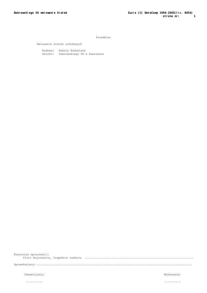 Dabr owski ego 58 mal owani e kl at ek Zuzi a ( C) Dat aComp 1994- 2005( l i c. 8054) st r ona nr : 1 Przedmiar Malowanie klatek schodowych Budowa: Obiekt: Roboty Budowlane Dabrowskiego 58 w Rzeszowie Kosztorys opracowali: Piotr Bujniewicz, Inspektor nadzoru .......................................................................... Sprawdzajacy: ...................................................................................................... Zamawiajacy: Wykonawca: .......... .......... Dabr owski ego 58 mal owani e kl at ek Zuzi a ( C) Dat aComp 1994- 2005( l i c. 8054) st r ona nr : 2 Przedmiar Podstawa nakladu, opis pozycji, wyliczenie ilosci robót 1 1 2 3 4 5 6 7 8 9 10 11 12 13 14 15 Malowanie klatek schodowych KNR 202/925/1 (2) Oslony okien, folia polietylenowa - drzwi 0,80*2,00*9 = Ilosc 14,4 14,4 KNR 401/709/5 (2) Uzupelnienie tynków zwyklych wewnetrznych kategorii III (powierzchnia do 0,5·m2), podloze z cegly, pustaków ceramicznych, betonu; zaprawa cem-wap, ?ciany KNR 23/2612/8 Ocieplenie scian budynków plytami styropianowymi system Stopter, ochrona narozników wypuklych katownikiem metalowym ORGB 202/1134/2 (1) Gruntowanie podlozy, powierzchnie pionowe, preparatem 2,22*5,08 = 11,2776 2,22*13*2+5,08*13*2 = 189,8 2,12*1,10*3+2,20* 1,10*3 = 14,256 2,60*1,10*6 = 17,16 -0,80*2,05*9 = -14,76 -1,47*2,11 = -3,1017 -46*1,40 = -64,4 -0,80*2,05*2 = -3,28 146,9519 KNR 401/1204/8 Malowanie farbami emulsyjnymi starych tynków, przygotowanie powierzchni z poszpachlowaniem nierównosci (sfalowan) powierzchni tynku KNR 401/1204/1 Malowanie farbami emulsyjnymi starych tynków, 2-krotne, sufity i sciany wewnetrzne KNR 23/933/1 Zagruntowanie powierzchni scian - grunt z piaskiem kwarcowym KNR 401/1206/2 (1) Malowanie farbami olejnymi starych tynków wewnetrznych, sciany, bez szpachlowania, 2-krotne - lamperia KNR 401/1206/5 (1) Malowanie farbami olejnymi starych tynków wewnetrznych, sciany, z 2-krotnym szpachlowaniem, 2-krotne - 25% pow. scian - lamperia KNR 401/1207/2 (1) Malowanie farbami olejnymi pasów (cokolów) o wysokosci do 20·cm, 2-krotne, farby olejne - cokól 46 = 46,0 46,0 KNR 401/1212/4 Malowanie farba olejna elementów metalowych, kraty i balustrady z pretów prostych, 1-krotne 19*0,90 = 17,1 17,1 KNR 401/1207/2 (1) Malowanie farbami olejnymi pasów (cokolów) o wysokosci do 20·cm, 2-krotne, farby olejne - boki schodów KNR 401/415/3 Analogia - Wykonanie nowego wylazu dachowego z plyty /wylaz wewnetrzny/ nowe oblistwowanie, wylaz otwierany przesuwnie na szynach KNR 401/1212/23 (1) Malowanie farba olejna elementów metalowych, grzejniki rurowo-zebrowe, 2-krotne 0,72*4 = 2,88 2,88 KNR 401/1209/10 (1) Malowanie farba olejna stolarki uprzednio malowanej, drzwi, scianki, szafki, 2-krotne, ponad 1,0·m2 Krot. Jedn. ~14,40 3,00 m2 3,00 3,00 szt 18,00 3,00 mb ~146,95 3,00 m2 146,95 3,00 m2 146,95 3,00 m2 16,10 3,00 m2 48,30 3,00 m2 16,10 3,00 m2 ~46,00 3,00 m ~17,10 3,00 m2 19,00 3,00 m 1,00 3,00 szt ~2,88 3,00 m Mal owani e kl at ek schodowych Dabr owski ego 58 mal owani e kl at ek Zuzi a ( C) Dat aComp 1994- 2005( l i c. 8054) st r ona nr : 3 Podstawa nakladu, opis pozycji, wyliczenie ilosci robót drzwi piwniczne obustronnie drzwi do lokalu jednostronnie 16 17 18 19 20 21 22 23 24 25 Ilosc 0,80*2,05*2,75 = 4,51 0,80*2,08*1,75 = 2,912 7,422 KNR 401/1212/30 Malowanie farba olejna elementów metalowych, rury wodociagowe i gazowe, srednica 50-100·mm, 1-krotne KNR 401/1212/11 (1) Malowanie farba olejna elementów metalowych, siatki ciagnione i plecione z ramkami stalowymi, 2-krotne 1,80*0,50*3 = 2,7 2,7 KNR 401/1209/16 (1) Analogia - szlifowanie pochwytu drewnianego i pomalowanie lakierobejca 2x KNRW 202/1610/2 Rusztowania ramowe warszawskie, 1-kolumnowe, wysokosc do 6·m Cena ryczaltowa Codzienne mycie i sprzatanie klatek schodowych po pracacch remontowych (okna na dzien odbioru) Kalkulacja wlasna Wykonanie szablonu w formie znaku zakazu i namalowanie na kazdej kondygnacji klatek schodowych "zakaz palenia" Kalkulacja wlasna Demontaz i ponowny montaz istniejacych przycisków elektrycznych na klatce schodowej oraz zabezpieczenie nowych lamp oswietleniowych Kalkulacja wlasna Umocowanie oderwanych listew na scianach z instalacja medialna Kalkulacja wlasna Malowanie numeracji mieszkan nad przyciskami dzwonka - 27 szt Kalkulacja wlasna Drobne naprawy lub uzupelnienia dekli puszek elektrycznych Krot. Jedn. ~7,42 2,00 m2 130,00 3,00 m ~2,70 3,00 m2 19,00 3,00 m 1,00 3,00 kolumna 1,00 3,00 kpl 3,00 szt 1,00 kpl 1,00 kpl 1,00 kpl 1,00 kpl Mal owani e kl at ek schodowych
