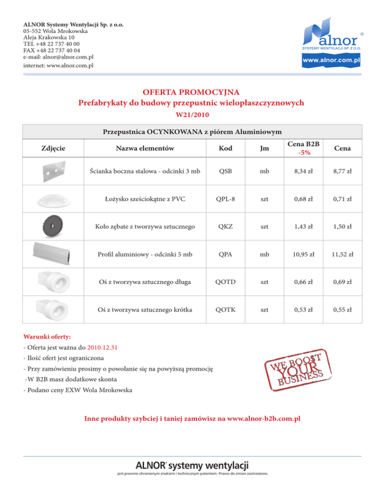 ALNOR Systemy Wentylacji Sp. z o.o. 05-552 Wola Mrokowska Aleja Krakowska 10 TEL +48 22 737 40 00 FAX +48 22 737 40 04 e-mail: [email protected] internet: www.alnor.com.pl OFERTA PROMOCYJNA Prefabrykaty do budowy przepustnic wielopłaszczyznowych W21/2010 Przepustnica OCYNKOWANA z piórem Aluminiowym Nazwa elementów Kod Jm Cena B2B -5% Cena Ścianka boczna stalowa - odcinki 3 mb QSB mb 8,34 zł 8,77 zł Łożysko sześciokątne z PVC QPL-8 szt 0,68 zł 0,71 zł Koło zębate z tworzywa sztucznego QKZ szt 1,43 zł 1,50 zł Profil aluminiowy - odcinki 5 mb QPA mb 10,95 zł 11,52 zł Oś z tworzywa sztucznego długa QOTD szt 0,66 zł 0,69 zł Oś z tworzywa sztucznego krótka QOTK szt 0,53 zł 0,55 zł Zdjęcie Warunki oferty: - Oferta jest ważna do 2010.12.31 - Ilość ofert jest ograniczona - Przy zamówieniu prosimy o powołanie się na powyższą promocję -W B2B masz dodatkowe skonta - Podano ceny EXW Wola Mrokowska Inne produkty szybciej i taniej zamówisz na www.alnor-b2b.com.pl ALNOR® systemy wentylacji jest prawnie chronionym znakiem i technicznym patentem. Prawo do zmian zastrzeżone.