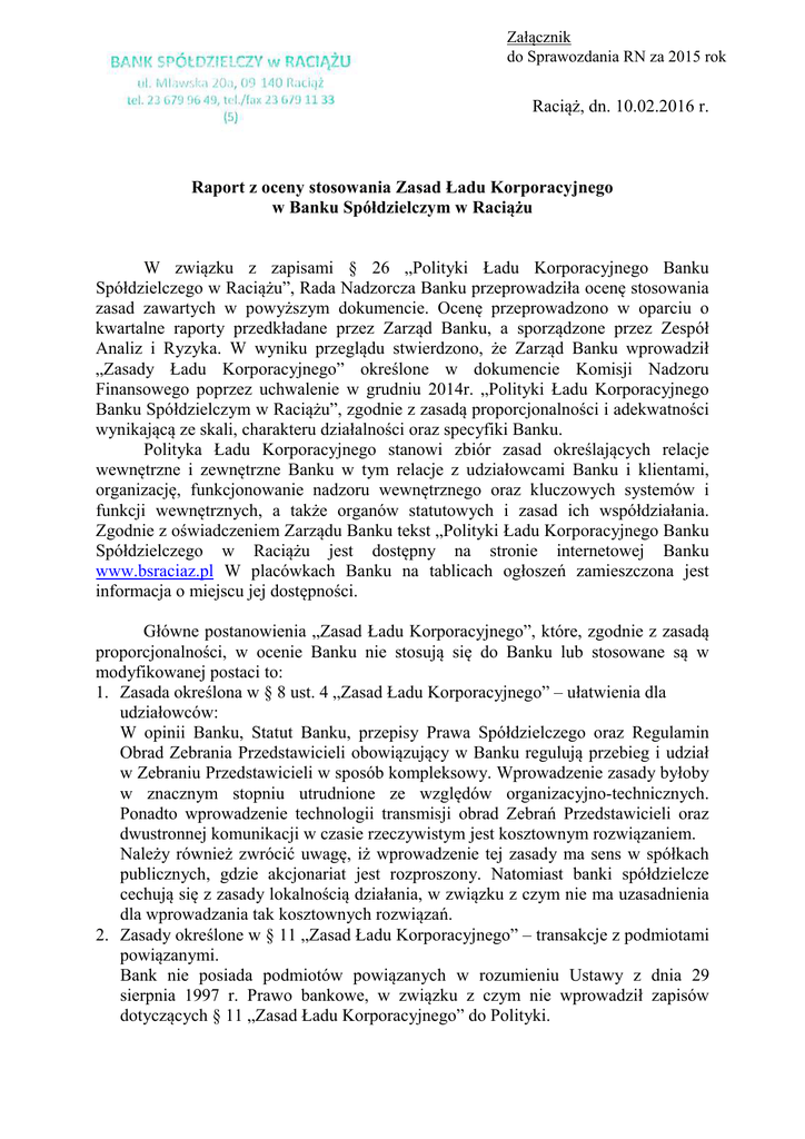 Załącznik do Sprawozdania RN za 2015 rok Raciąż, dn. 10.02.2016 r. Raport z oceny stosowania Zasad Ładu Korporacyjnego w Banku Spółdzielczym w Raciążu W związku z zapisami § 26 „Polityki Ładu Korporacyjnego Banku Spółdzielczego w Raciążu”, Rada Nadzorcza Banku przeprowadziła ocenę stosowania zasad zawartych w powyższym dokumencie. Ocenę przeprowadzono w oparciu o kwartalne raporty przedkładane przez Zarząd Banku, a sporządzone przez Zespół Analiz i Ryzyka. W wyniku przeglądu stwierdzono, że Zarząd Banku wprowadził „Zasady Ładu Korporacyjnego” określone w dokumencie Komisji Nadzoru Finansowego poprzez uchwalenie w grudniu 2014r. „Polityki Ładu Korporacyjnego Banku Spółdzielczym w Raciążu”, zgodnie z zasadą proporcjonalności i adekwatności wynikającą ze skali, charakteru działalności oraz specyfiki Banku. Polityka Ładu Korporacyjnego stanowi zbiór zasad określających relacje wewnętrzne i zewnętrzne Banku w tym relacje z udziałowcami Banku i klientami, organizację, funkcjonowanie nadzoru wewnętrznego oraz kluczowych systemów i funkcji wewnętrznych, a także organów statutowych i zasad ich współdziałania. Zgodnie z oświadczeniem Zarządu Banku tekst „Polityki Ładu Korporacyjnego Banku Spółdzielczego w Raciążu jest dostępny na stronie internetowej Banku www.bsraciaz.pl W placówkach Banku na tablicach ogłoszeń zamieszczona jest informacja o miejscu jej dostępności. Główne postanowienia „Zasad Ładu Korporacyjnego”, które, zgodnie z zasadą proporcjonalności, w ocenie Banku nie stosują się do Banku lub stosowane są w modyfikowanej postaci to: 1. Zasada określona w § 8 ust. 4 „Zasad Ładu Korporacyjnego” – ułatwienia dla udziałowców: W opinii Banku, Statut Banku, przepisy Prawa Spółdzielczego oraz Regulamin Obrad Zebrania Przedstawicieli obowiązujący w Banku regulują przebieg i udział w Zebraniu Przedstawicieli w sposób kompleksowy. Wprowadzenie zasady byłoby w znacznym stopniu utrudnione ze względów organizacyjno-technicznych. Ponadto wprowadzenie technologii transmisji obrad Zebrań Przedstawicieli oraz dwustronnej komunikacji w czasie rzeczywistym jest kosztownym rozwiązaniem. Należy również zwrócić uwagę, iż wprowadzenie tej zasady ma sens w spółkach publicznych, gdzie akcjonariat jest rozproszony. Natomiast banki spółdzielcze cechują się z zasady lokalnością działania, w związku z czym nie ma uzasadnienia dla wprowadzania tak kosztownych rozwiązań. 2. Zasady określone w § 11 „Zasad Ładu Korporacyjnego” – transakcje z podmiotami powiązanymi. Bank nie posiada podmiotów powiązanych w rozumieniu Ustawy z dnia 29 sierpnia 1997 r. Prawo bankowe, w związku z czym nie wprowadził zapisów dotyczących § 11 „Zasad Ładu Korporacyjnego” do Polityki. 3. Zasady określone w § 12 ust. 1 i 2 „Zasad Ładu Korporacyjnego” – dokapitalizowanie i dofinansowanie Banku przez udziałowców. W ocenie Banku zasady te nie dotyczą Banku, m.in. ze względu na fakt, iż aktualnie obowiązujące przepisy prawa nie dopuszczają możliwości zaliczenia funduszu udziałowego do funduszy własnych Banku tzw. CET I, co oznacza, iż nie ma możliwości skutecznego dekapitalizowania Banku. Ponadto obowiązek dostarczenia wsparcia finansowego wydaje się być racjonalny dla banków komercyjnych, gdzie występują udziałowcy większościowi. W przypadku Banku, który posiada dużą liczbę udziałowców będących osobami fizycznymi, nałożenie na nich dodatkowego obowiązku udzielenia wsparcia finansowego jest niewykonalne i nieracjonalne. W związku z powyższym Bank postanowił nie stosować zasad określonych w tych przepisach. 4. Zasady określone w § 13 oraz w § 19 „Zasad Ładu Korporacyjnego” –kompetencje członków organów Banku. W związku z faktem, iż Bank, w przeciwieństwie do innych podmiotów nadzorowanych przez Komisję Nadzoru Finansowego, posiada stosowne regulacje określające kompetencje członków Zarządu i członków Rady Nadzorczej, Bank uznaje, iż realizuje obowiązki określone w tych zasadach poprzez stosowanie powszechnie obowiązujących przepisów prawa, wytycznych, rekomendacji i zaleceń, określonych przez Europejski Urząd Nadzoru Bankowego oraz Komisję Nadzoru Finansowego, regulujących tą materię, z zachowaniem zasady proporcjonalności. W związku z powyższym Bank przyjął w § 12 ust. 6 oraz w § 18 ust. 5 Polityki jednolitą zasadę, iż: „Bank realizuje powyższe zasady poprzez stosowanie przepisów prawa powszechnie obowiązującego oraz wytycznych, rekomendacji i zaleceń, określonych przez Europejski Urząd Nadzoru Bankowego oraz Komisję Nadzoru Finansowego, regulujących tą materię, z zachowaniem zasady proporcjonalności”. 5. Zasady określone w § 22 ust. 1 i 2 „Zasad Ładu Korporacyjnego” – niezależność członków organów Banku. Zgodnie z Ustawą z dnia 16 września 1982 r. Prawo spółdzielcze, do organów spółdzielni mają prawo być wybierani jej członkowie. W związku z powyższym, Bank uznaje, iż zasady określone w przytoczonych przepisach, dot. niezależności członków organu nadzorującego, nie znajdują zastosowania do banku funkcjonującego w formie spółdzielni, jakim jest Bank. W związku z powyższym Bank przyjął w § 21 ust. 1 Polityki zasadę, iż: do składu Rady Nadzorczej wybierani są udziałowcy Banku, zgodnie z Prawem spółdzielczym.” 6. Zasady określone w „Zasadach Ładu Korporacyjnego” dot. komitetu audytu oraz komórki audytu. Zgodnie z art. 86 ust. 2 pkt 4) Ustawy z dnia 7 maja 2009 r. o biegłych rewidentach i ich samorządzie, podmiotach uprawnionych do badania sprawozdań finansowych oraz o nadzorze publicznym, banki spółdzielcze nie mają obowiązku powoływania komitetu audytu, w związku z czym postanowienia Zasad w tym zakresie nie stosują się do Banku. 7. Zasady określone w rozdziale 9 „Wykonywanie uprawnień z aktywów nabytych na
