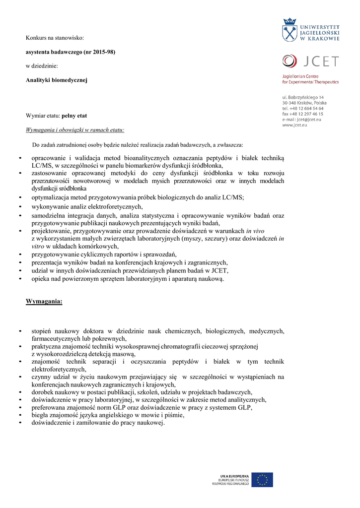 Konkurs na stanowisko: asystenta badawczego (nr 2015-98) w dziedzinie: Analityki biomedycznej Wymiar etatu: pełny etat Wymagania i obowiązki w ramach etatu: Do zadań zatrudnionej osoby będzie należeć realizacja zadań badawczych, a zwłaszcza: • • • • • • • • • • opracowanie i walidacja metod bioanalitycznych oznaczania peptydów i białek techniką LC/MS, w szczególności w panelu biomarkerów dysfunkcji śródbłonka, zastosowanie opracowanej metodyki do ceny dysfunkcji śródbłonka w toku rozwoju przerzutowośći nowotworowej w modelach mysich przerzutowości oraz w innych modelach dysfunkcji sródbłonka optymalizacja metod przygotowywania próbek biologicznych do analiz LC/MS; wykonywanie analiz elektroforetycznych, samodzielna integracja danych, analiza statystyczna i opracowywanie wyników badań oraz przygotowywanie publikacji naukowych prezentujących wyniki badań, projektowanie, przygotowywanie oraz prowadzenie doświadczeń w warunkach in vivo z wykorzystaniem małych zwierzętach laboratoryjnych (myszy, szczury) oraz doświadczeń in vitro w układach komórkowych, przygotowywanie cyklicznych raportów i sprawozdań, prezentacja wyników badań na konferencjach krajowych i zagranicznych, udział w innych doświadczeniach przewidzianych planem badań w JCET, opieka nad powierzonym sprzętem laboratoryjnym i aparaturą naukową. Wymagania: • • • • • • • • • stopień naukowy doktora w dziedzinie nauk chemicznych, biologicznych, medycznych, farmaceutycznych lub pokrewnych, praktyczna znajomość techniki wysokosprawnej chromatografii cieczowej sprzężonej z wysokorozdzielczą detekcją masową, znajomość technik separacji i oczyszczania peptydów i białek w tym technik elektroforetycznych, czynny udział w życiu naukowym przejawiający się w szczególności w wystąpieniach na konferencjach naukowych zagranicznych i krajowych, dorobek naukowy w postaci publikacji, szkoleń, udziału w projektach badawczych, doświadczenie w pracy laboratoryjnej, w szczególności w zakresie metod analitycznych, preferowana znajomość norm GLP oraz doświadczenie w pracy z systemem GLP, biegła znajomość języka angielskiego w mowie i piśmie, doświadczenie i zamiłowanie do pracy naukowej.