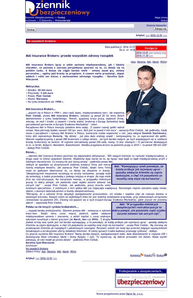 Dziennik Ubezpieczeniowy >> Szukaj Archiwum :: O Dzienniku :: Prenumerata Mapa strony Szukaj Ostatnie Dzienniki: Zaloguj się Szukaj Artykuł: <<< 2016‐12‐01 >>> Na zasadach brokera Data publikacji: 2016‐12‐01 Dz.U. nr: 4128 MAI Insurance Brokers: przede wszystkim zdrowy rozsądek Nawigacja 2016‐12‐01 |<< <<<>>> >>| 2016‐11‐30 |<< (Aon, Donoria, MAI, Marsh, Willis) MAI Insurance Brokers łączy w sobie zarówno międzynarodowy, jak i lokalny charakter, co pozwala z szerszej perspektywy spojrzeć na to, co dzieje się na polskim rynku. A dzieje się ciągle bardzo wiele ‐ zmiany zasad gry, zmiany personalne... ogólny pęd branży za przypisem. A czasem warto przystanąć, złapać oddech i robić ten biznes z zachowaniem zdrowego rozsądku. ‐ Karolina Zysk‐ Wieczorek Metryczka: + + + + + Składka: 20 mln euro Przychody: 3 mln euro Prezes: Piotr Cieślak Miasto: Warszawa Na rynku brokerskim od: 1998 r. MAI Insurance Brokers... ...pojawił się w Polsce w 1999 r. jako część dużej, międzynarodowej sieci. Jak wspomina Piotr Cieślak, prezes MAI Insurance Brokers, założyło ją ponad 20 lat temu dwóch dżentelmenów z rynku londyńskiego. "Powoli, syzyfową wręcz pracą, budowali firmę, wierząc, że mali i średni, a czasami i trochę więksi, brokerzy z Europy Zachodniej będą potrzebowali partnerów w Europie Środkowo‐Wschodniej" ‐ mówi. Początkowo MAI w Polsce tworzyły zaledwie dwie osoby. "Z czasem rozwój spółki nabrał tempa. Nasz pierwszy budżet wynosił 120 tys. euro. Dziś jest to ponad 3 mln euro" ‐ zaznacza Piotr Cieślak. Jak podkreśla, kiedy mowa o początkach i rozwoju MAI Brokers w Polsce, koniecznie trzeba wspomnieć o roli, jaką odegrał Dominik Stachiewicz, który dziś reprezentuje Donorię. "My dzisiaj ‐ już jako dużo większy zespół ‐ kontynuujemy to, co wypracował dla spółki. Obecnie współpracujemy z ponad 200 brokerami z całego świata ‐ od tych bardzo małych, po tych znajdujących się w czołówce branży brokerskiej na świecie. W regionie zatrudniamy ponad 250 osób, mamy 13 biur własnych i 12 partnerów działających m.in. w Serbii, Bułgarii, Macedonii, Kazachstanie. Składka przypisana brutto na poziomie grupy w 2015 r. to ponad 100 mln USD" ‐ dodaje Piotr Cieślak. Biznes... ...zdaniem MAI Insurance Brokers powinien się odpowiednio zbilansować. "50% naszych klientów to rachunki międzynarodowe, a druga część to klienci pozyskani lokalnie. Kładziemy duży nacisk na to, by łączyć nasz bądź co bądź międzynarodowy profil z lokalnym charakterem. Co zresztą nie jest łatwą sztuką" ‐ podkreśla prezes MAI. Jednym ze sposobów na utrzymywanie stabilnej kondycji firmy jest mocny MAI: "Wymagający rynek powoduje, że rozwój employee benefits. Jak zaznacza Piotr Cieślak, dzięki temu firma każdy próbuje jak najwięcej ugrać ‐ może ze spokojem obserwować to, co dzieje się aktualnie w branży. sposoby zdobycia klientów są często "Ubezpieczyciele nieustannie narzekają na utratę rachunków, zarządy stale dyskusyjne, a chęć ich pozyskania za się zmieniają, a ludzie przechodzą z jednego miejsca w drugie. Do tego wiele wszelką cenę staje się kuriozalna". firm się restrukturyzuje. Na marginesie mówiąc, w przypadku niektórych graczy to dobry pomysł, ale pozostała część szybko zacznie żałować tak ostrych cięć" ‐ uważa Piotr Cieślak. Jak podkreśla, pracę straciło wielu świetnych specjalistów. Z niektórymi z nich spółka MAI już rozpoczęła współpracę. Równolegle chętnie zatrudnia osoby młode, zdolne, z pewnym doświadczeniem w branży ubezpieczeniowej. "Wierzymy, że o sukcesie firmy decyduje zaangażowanie pracowników, ich wiedza i wspólna chęć do rozwoju biznesu w ustalonym kierunku. Naszym celem na najbliższych kilka lat jest stabilne zwiększanie przychodu, przy jednoczesnym utrzymaniu rentowności na poziomie 25%. Chcemy też pojawić się w tych krajach Europy Środkowo‐Wschodniej, gdzie jeszcze nie jesteśmy obecni" ‐ zapowiada Piotr Cieślak. MAI: "W przypadku niektórych ubezpieczycieli restrukturyzacja to ...wypada bardzo profesjonalnie. Zdaniem prezesa MAI ‐ zwłaszcza w zakresie dobry pomysł, ale pozostała część szybko know‐how. Dzięki temu coraz więcej polskich spółek zdobywa zacznie żałować tak ostrych cięć". Polska na tle innych rynków brokerskich... międzynarodowe uznanie i znaczenie, a polski kapitał z coraz większym sukcesem rywalizuje z takimi graczami jak Marsh, Aon czy Willis. "Z drugiej jednak strony nasz rynek jest też bardzo wymagający, a to powoduje, że każdy próbuje jak najwięcej ugrać ‐ sposoby zdobycia klientów są często dyskusyjne, a chęć ich pozyskania za wszelką cenę staje się kuriozalna" ‐ uważa Piotr Cieślak. "My staramy się przekonywać klientów do rozsądnych i jakościowych rozwiązań. Parametr stawki nie może być przecież jedynym wyznacznikiem świadczącym o atrakcyjności oferty składanej klientowi. W takiej sytuacji trudno budować przewagę rynkową" ‐ dodaje. Co jeszcze wyróżnia MAI Insurance Brokers? "Mamy bardzo fajnych, zaangażowanych ludzi, duże doświadczenie w regionie CEE i fantastyczny Dział Likwidacji Szkód i Oceny Ryzyka. I tyle. To wystarczy, by dobrze prowadzić ten biznes. Nasze wyniki pokazują, że taki model po prostu działa" ‐ podkreśla Piotr Cieślak. Karolina Zysk‐Wieczorek Archiwum: Na zasadach brokera Zobacz firmy: Aon, Donoria, MAI, Marsh, Willis Artykuł: <<< 2016‐12‐01 >>> Komentuj Prześlij Drukuj Profesjonalnie o ubezpieczeniach.. Strona przygotowana przez Ogma Sp. z o.o.