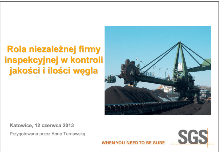 Rola niezależnej firmy inspekcyjnej w kontroli jakości i ilości węgla Katowice, 12 czerwca 2013 Przygotowana przez Annę Tarnawską MISJA PSC Niezależna inspekcja oraz badania: dają podstawę do rozliczeń finansowych są bazą do podejmowania odpowiednich decyzji w trudnych sytuacjach Pomagają chronić interesy stron kontarktu. 2 Niezależna inspekcja – co daje? Jedna inspekcja w jednym miejscu - koszt o połowę mniejszy Jedna próbka / jeden niezależny wynik – koniec dyskusji o rozbieżnościach / braku bezstronności Próbka rozjemcza – laboratorium arbitrażowe Niezależność – wpis w kontrakcie; 2 zleceniodawców; płatność 50/50 3 Zakres inspekcji surowców energetycznych: kontrola jakości Typowe czynności inspekcyjne: • pobieranie i przygotowanie próbek – ręczne, przy pomocy autosamplerów • oznaczanie parametrów jakościowych – analiza chemiczna, analiza sitowa • nadzór nad za/wyładunkiem: – nadzór nad prawidłowością prac za/wyładunkowych, – kontrola czystości wagonów / ładowni – kontrola szczelności luków ładowni – inspekcja czystości urządzeń przeładunkowych – wizualna inspekcja czystości i ogólnego stanu towaru – kontrola opróżnienia ładowni 4 Zakres inspekcji surowców energetycznych: kontrola ilości Typowe czynności inspekcyjne: • nadzór nad ważeniem: – sprawdzenie legalizacji wagi – nadzór nad prawidłowością czynności ważenia vs instrukcja • Draft Survey (pomiar wagi na podstawie zanurzenia statku) • Obmiar ilości paliwa na składowiskach (inwentaryzacja) na podstawie: – pomiaru gęstości (gęstość nasypowa lub ciężar objętościowy) – obmiaru objętości (tachimetr, GPS, skaner laserowy) 5 Kontrakty Ustalenia w kontrakcie: Miejsce inspekcji Wielkość pojedynczych partii Zakres inspekcji Dopuszczalne tolerancje dla poszczególnych parametrów Czas i miejsce przechowywania próbek rozjemczych Dystrybucja próbek Laboratorium arbitrażowe 6 Założenia wg normy PN-90/G-04502 „Węgiel kamienny i brunatny. Metody pobierania i przygotowania próbek do badań laboratoryjnych” Z tablicy nr 1 w/w normy wynika, że postępując zgodnie z normą, pomiędzy dwoma niezależnym próbobraniami tego samego węgla w niezmienionej ilości i w takich samych warunkach, oznaczenie zawartości popiołu Ad lub wilgoci Wtr powinno wykonywać się z dokładnością: Dla węgli o zawartości popiołu poniżej 9%: ± 5,0% względnie (Co oznacza, że węgiel o zawartości popiołu 6,0% powinien dać wynik pomiędzy 5,7% i 6,3.) Dla węgli o zawartości popiołu do 20%: ± 10,0% względnie (Co oznacza, że węgiel o zawartości popiołu 15,0% powinien dać wynik pomiędzy 13,5% i 16,5%) Dla węgli o zawartości popiołu powyżej 20%: ± 2,0% bezwzględnie (Co oznacza, że węgiel o zawartości popiołu 25,0% powinien dać wynik pomiędzy 23,0% i 27,0%) 7 Wpływ balastu (popiołu i wilgoci) na wartość opałową 1% popiołu ok. 350 kJ/kg ok. 85 kcal/kg 1% wilgoci ok. 350 kJ/kg ok. 85 kcal/kg tolerancja metody na oznaczanie ciepła spalania ok. 330 kJ/kg ok. 80 kcal/kg W sumie może to być nawet 1030 kJ/kg (250 kcal/kg). 8 SGS Polska Sp. z o.o. Węgiel, szczególnie surowy i niewzbogacony (nie poddany wstępnej obróbce) jest kopaliną mineralną bardzo niejednorodną. Uzyskanie odtwarzalności wyników w przypadku takiego towaru jest bardzo trudne. Między innymi z tego powodu normy dopuszczają duże tolerancje oznaczanych parametrów, które muszą być uwzględniane przy porównywaniu wyników. Jest praktycznie niemożliwe uzyskanie identycznych wyników z dwóch niezależnych analiz. Podane w normach dopuszczalne różnice powinny być uwzględniane podczas rozliczeń, a dla wartości parametrów kontraktowych powinien być przyjęty przedział w takich granicach jak określa to norma. 9 SGS Polska Sp. z o.o. Dziękuję za uwagę 10