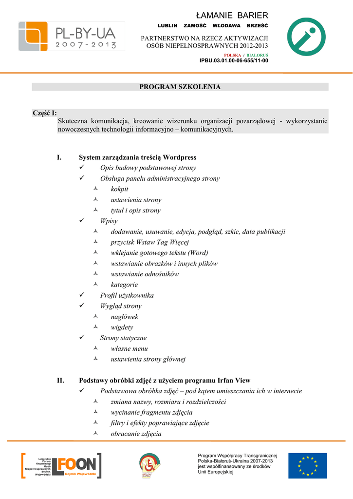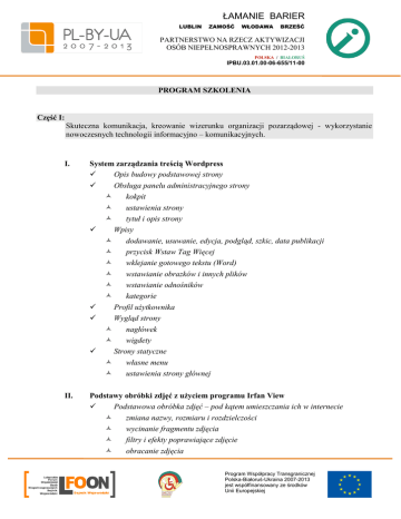 ŁAMANIE BARIER LUBLIN ZAMOŚĆ WŁODAWA BRZEŚĆ PARTNERSTWO NA RZECZ AKTYWIZACJI OSÓB NIEPEŁNOSPRAWNYCH 2012-2013 POLSKA / BIAŁORUŚ IPBU.03.01.00-06-655/11-00 PROGRAM SZKOLENIA Część I: Skuteczna komunikacja, kreowanie wizerunku organizacji pozarządowej - wykorzystanie nowoczesnych technologii informacyjno – komunikacyjnych. I. System zarządzania treścią Wordpress Opis budowy podstawowej strony Obsługa panelu administracyjnego strony kokpit II. ustawienia strony tytuł i opis strony Wpisy dodawanie, usuwanie, edycja, podgląd, szkic, data publikacji przycisk Wstaw Tag Więcej wklejanie gotowego tekstu (Word) wstawianie obrazków i innych plików wstawianie odnośników kategorie Profil użytkownika Wygląd strony nagłówek wigdety Strony statyczne własne menu ustawienia strony głównej Podstawy obróbki zdjęć z użyciem programu Irfan View Podstawowa obróbka zdjęć – pod kątem umieszczania ich w internecie zmiana nazwy, rozmiaru i rozdzielczości wycinanie fragmentu zdjęcia filtry i efekty poprawiające zdjęcie obracanie zdjęcia Program Współpracy Transgranicznej Polska-Białoruś-Ukraina 2007-2013 jest współfinansowany ze środków Unii Europejskiej ŁAMANIE BARIER LUBLIN ZAMOŚĆ WŁODAWA BRZEŚĆ PARTNERSTWO NA RZECZ AKTYWIZACJI OSÓB NIEPEŁNOSPRAWNYCH 2012-2013 POLSKA / BIAŁORUŚ IPBU.03.01.00-06-655/11-00 Grupowa obróbka zdjęć – edycja wielu wybranych plików automatycznie zmiana rozmiaru i rozdzielczości automatyczna zmiana nazw plików III. Praca w chmurze Zalety i zagrożenia Kalendarz w sieci Przestrzeń dyskowa w chmurze tworzenie, usuwanie plików udostępnianie plików innym użytkownikom współużytkowanie plików Albumy zdjęć w chmurze IV. Webinaria oraz e-learning Wymagania sprzętowe Telekonferencje i wideokonferencje Webinarium opis, zastosowania, wady i zalety prezentowanie pulpitu udostępnianie pulpitu E-learning różne sposoby nauczania z wykorzystaniem mediów elektronicznych grupa docelowa korzyści i zagrożenia Przykładowe darmowe i komercyjne narzędzia Przeprowadzenie próbnego webinarium Program Współpracy Transgranicznej Polska-Białoruś-Ukraina 2007-2013 jest współfinansowany ze środków Unii Europejskiej