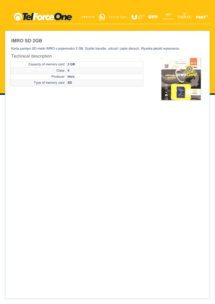 IMRO SD 2GB Karta pamięci SD marki IMRO o pojemności 2 GB. Szybki transfer, odczyt i zapis danych. Wysoka jakość wykonania. Technical description Capacity of memory card 2 GB Class 4 Producer Imro Type of memory card SD