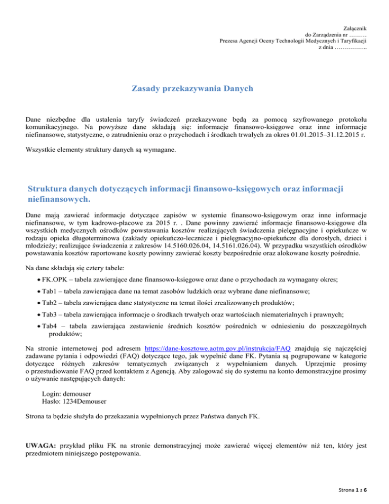 Załącznik do Zarządzenia nr ……… Prezesa Agencji Oceny Technologii Medycznych i Taryfikacji z dnia …………….. Zasady przekazywania Danych Dane niezbędne dla ustalenia taryfy świadczeń przekazywane będą za pomocą szyfrowanego protokołu komunikacyjnego. Na powyższe dane składają się: informacje finansowo-księgowe oraz inne informacje niefinansowe, statystyczne, o zatrudnieniu oraz o przychodach i środkach trwałych za okres 01.01.2015–31.12.2015 r. Wszystkie elementy struktury danych są wymagane. Struktura danych dotyczących informacji finansowo-księgowych oraz informacji niefinansowych. Dane mają zawierać informacje dotyczące zapisów w systemie finansowo-księgowym oraz inne informacje niefinansowe, w tym kadrowo-płacowe za 2015 r. . Dane powinny zawierać informacje finansowo-księgowe dla wszystkich medycznych ośrodków powstawania kosztów realizujących świadczenia pielęgnacyjne i opiekuńcze w rodzaju opieka długoterminowa (zakłady opiekuńczo-lecznicze i pielęgnacyjno-opiekuńcze dla dorosłych, dzieci i młodzieży; realizujące świadczenia z zakresów 14.5160.026.04, 14.5161.026.04). W przypadku wszystkich ośrodków powstawania kosztów raportowane koszty powinny zawierać koszty bezpośrednie oraz alokowane koszty pośrednie. Na dane składają się cztery tabele: FK.OPK – tabela zawierające dane finansowo-księgowe oraz dane o przychodach za wymagany okres; Tab1 – tabela zawierająca dane na temat zasobów ludzkich oraz wybrane dane niefinansowe; Tab2 – tabela zawierająca dane statystyczne na temat ilości zrealizowanych produktów; Tab3 – tabela zawierająca informacje o środkach trwałych oraz wartościach niematerialnych i prawnych; Tab4 – tabela zawierająca zestawienie średnich kosztów pośrednich w odniesieniu do poszczególnych produktów; Na stronie internetowej pod adresem https://dane-kosztowe.aotm.gov.pl/instrukcja/FAQ znajdują się najczęściej zadawane pytania i odpowiedzi (FAQ) dotyczące tego, jak wypełnić dane FK. Pytania są pogrupowane w kategorie dotyczące różnych zakresów tematycznych związanych z wypełnianiem danych. Uprzejmie prosimy o przestudiowanie FAQ przed kontaktem z Agencją. Aby zalogować się do systemu na konto demonstracyjne prosimy o używanie następujących danych: Login: demouser Hasło: 1234Demouser Strona ta będzie służyła do przekazania wypełnionych przez Państwa danych FK. UWAGA: przykład pliku FK na stronie demonstracyjnej może zawierać więcej elementów niż ten, który jest przedmiotem niniejszego postępowania. Strona 1 z 6 Format tabeli FK.OPK Uwaga! Kolumna Zakładu opiekuńczo-leczniczego została wypełniona dla przykładu – w pliku docelowym prosimy wpisać rzeczywiste dane jednostki. Kod oddziałowy świadczeniodawcy Nazwa świadczeniodawcy i adres (ulica, miejscowość, kod pocztowy) Osoba do kontaktu, Imię i Nazwisko, telefon, adres email Numer konta OPK Nazwa konta OPK [OPK = Ośrodek Powstawania Kosztów] Kod resortowy10 charakteryzujący specjalność komórki organizacyjnej, stanowiący część VIII systemu resortowych kodów identyfikacyjnych [jeśli komórka ma więcej kodów, należy je podać po przecinku] Rok: np. 3302562 np. Zakład Opiekuńczo-Leczniczy XYZ, ul. Warszawska 123, 12-345 Warszawa np. Jan Kowalski, tel. 22 123-45-67, [email protected] np. 510-18-01 np. Zakład opiekuńczo-leczniczy np. 5170 2015 CZĘŚĆ PODSTAWOWA I - PRZYCHODY (dla zdefiniowanych kategorii należy przyporządkować właściwe przychody): 1 2 PRZYCHODY RAZEM: (suma pozycji 2, 3, 4, 5 i 6) Przychody z tytułu kontraktu z NFZ (w części wynikającej z kontraktu dotyczące danego okresu) Przychody z tytułu nadwykonań zrealizowanych w danym roku (niezależnie od tego czy zostały zapłacone) 4 Przychody z tytułu dopłat pacjentów 5 Przychody z innych tytułów (np. dotacje, wynagrodzenia rezydentów) 6 Przychody z tytułu refundacji wzrostu wynagrodzeń pielęgniarek CZĘŚĆ PODSTAWOWA II - KOSZTY (dla zdefiniowanych kategorii kosztowych [poz. A-J] należy przyporządkować właściwe koszty z danych FK umieszczonych poniżej w części szczegółowej): KOSZTY CAŁKOWITE1, w tym: A (koszty całkowite są równe sumie pozycji B, C, D, E, F, G, H, I, J) B Koszty leków i wyrobów medycznych b1 w tym: koszty preparatów żywieniowych do żywienia dojelitowego i pozajelitowego C Koszty amortyzacji2 (suma pozycji c1 do c5) c1 w tym: budynków, lokali, prawa do lokali i obiektów inżynierii lądowej i wodnej c2 w tym: urządzeń technicznych i maszyn c3 w tym: środków transportu c4 w tym: innych środków trwałych c5 w tym: wartości niematerialnych i prawnych D Koszty procedur3 E Koszty zarządu4, w tym wynagrodzenia personelu administracyjnego Koszty wynagrodzeń personelu wraz z pochodnymi wynikające z tytułu umów o pracę 5 (suma pozycji F f1 do f10) f1 w tym: lekarzy niebędących rezydentami f2 w tym: pielęgniarek f3 w tym: fizjoterapeutów f4 w tym: logopedów f5 w tym: psychologów f6 w tym: specjalistów terapii uzależnień f7 w tym: terapeutów zajęciowych f8 w tym: opiekunów medycznych f9 w tym: innych przedstawicieli personelu medycznego6 f10 w tym: pozostałego personelu niemedycznego7 Koszty wynagrodzeń personelu wynikające z umów cywilno-prawnych, kontraktów itp.8 (suma pozycji G g1 do g10) g1 w tym: lekarzy niebędących rezydentami g2 w tym: pielęgniarek g3 w tym: fizjoterapeutów g4 w tym: logopedów g5 w tym: psychologów g6 w tym: specjalistów terapii uzależnień g7 w tym: terapeutów zajęciowych g8 w tym: opiekunów medycznych g9 w tym: innych przedstawicieli personelu medycznego6 g10 w tym: pozostałego personelu niemedycznego7 H Wynagrodzenia rezydentów (suma pozycji h1 do h2) h1 refundowane h2 ze środków własnych podmiotu leczniczego I Koszty stażystów i wolontariuszy, w tym wynagrodzeń (suma pozycji i1 do i2) i1 refundowane i2 ze środków własnych podmiotu leczniczego J Pozostałe koszty9 2 360 908,62 2