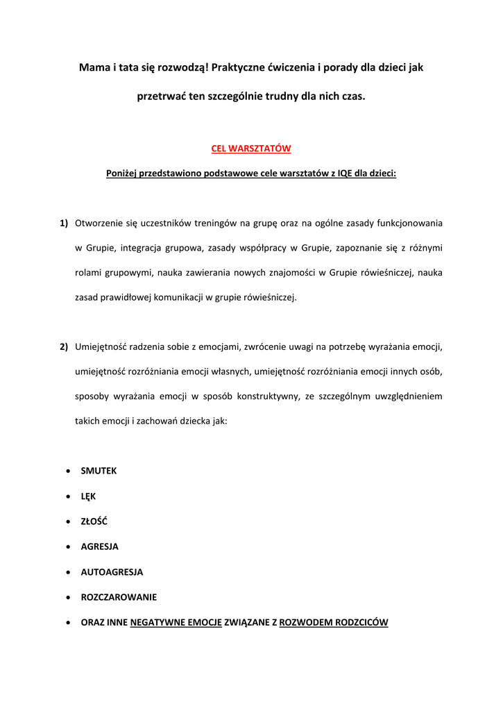 Mama i tata się rozwodzą! Praktyczne ćwiczenia i porady dla dzieci jak przetrwać ten szczególnie trudny dla nich czas. CEL WARSZTATÓW Poniżej przedstawiono podstawowe cele warsztatów z IQE dla dzieci: 1) Otworzenie się uczestników treningów na grupę oraz na ogólne zasady funkcjonowania w Grupie, integracja grupowa, zasady współpracy w Grupie, zapoznanie się z różnymi rolami grupowymi, nauka zawierania nowych znajomości w Grupie rówieśniczej, nauka zasad prawidłowej komunikacji w grupie rówieśniczej. 2) Umiejętność radzenia sobie z emocjami, zwrócenie uwagi na potrzebę wyrażania emocji, umiejętność rozróżniania emocji własnych, umiejętność rozróżniania emocji innych osób, sposoby wyrażania emocji w sposób konstruktywny, ze szczególnym uwzględnieniem takich emocji i zachowań dziecka jak: SMUTEK LĘK ZŁOŚĆ AGRESJA AUTOAGRESJA ROZCZAROWANIE ORAZ INNE NEGATYWNE EMOCJE ZWIĄZANE Z ROZWODEM RODZCICÓW PRZYKŁADOWE ĆWICZENIA Poniżej przedstawiono przykładowe tematy poszczególnych zajęć warsztatowych: 1. Integracja oraz zwiększenie poczucia bezpieczeństwa w grupie: przedstawienie zaimka JA, kompozycja plastyczna MÓJ ŚWIAT, zabawa we WSZYSTKIE DZIECI KTÓRE, ćwiczenie: Jestem, Potrafię, Mam, zabawa w Jestem Dumny, w czterech kątach moje mocne strony – zabawa psychoedukacyjna. 2. Nauka rozpoznawania emocji własnych związanych z Rozwodem Rodziców dziecka: zabawa w JAKIE TO UCZUCIE, test niedokończonych zdań, kalambury z emocjami wg listy podstawowych emocji Paula Ekmana. 3. Praktyczne sposoby radzenia sobie z emocjami negatywnymi, takimi jak lęk, czy złość: zabawa w zrzucanie balastu, obrazki Przeciwko Złości, ćwiczenie: Gdybym Był Wściekły, ćwiczenie: Wspólna Złość & Wspólny Spokój, obrona przed głupimi zaczepkami – gra symulacyjna, ćwiczenie: Lękowa pogoda & Narysuj swój Lęk, zabawa w pięć sposobów szybkiego zapanowania nad własnymi emocjami, pantomima & scenki dramowe związane z uczuciem lęku i/lub złości, bajki terapeutyczne & zajęcia relaksacyjne.