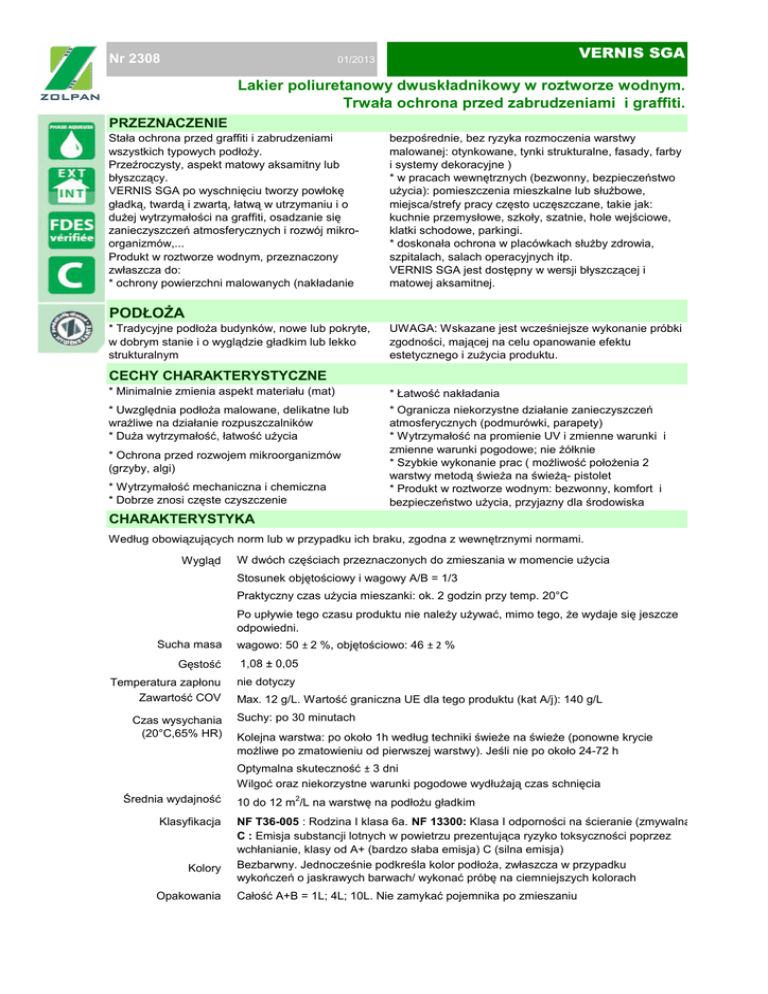Nr 2308 VERNIS SGA 01/2013 Lakier poliuretanowy dwuskładnikowy w roztworze wodnym. Trwała ochrona przed zabrudzeniami i graffiti. PRZEZNACZENIE Stała ochrona przed graffiti i zabrudzeniami wszystkich typowych podłoży. Przeźroczysty, aspekt matowy aksamitny lub błyszczący. VERNIS SGA po wyschnięciu tworzy powłokę gładką, twardą i zwartą, łatwą w utrzymaniu i o dużej wytrzymałości na graffiti, osadzanie się zanieczyszczeń atmosferycznych i rozwój mikroorganizmów,... Produkt w roztworze wodnym, przeznaczony zwłaszcza do: * ochrony powierzchni malowanych (nakładanie bezpośrednie, bez ryzyka rozmoczenia warstwy malowanej: otynkowane, tynki strukturalne, fasady, farby i systemy dekoracyjne ) * w pracach wewnętrznych (bezwonny, bezpieczeństwo użycia): pomieszczenia mieszkalne lub służbowe, miejsca/strefy pracy często uczęszczane, takie jak: kuchnie przemysłowe, szkoły, szatnie, hole wejściowe, klatki schodowe, parkingi. * doskonała ochrona w placówkach służby zdrowia, szpitalach, salach operacyjnych itp. VERNIS SGA jest dostępny w wersji błyszczącej i matowej aksamitnej. PODŁOŻA * Tradycyjne podłoża budynków, nowe lub pokryte, w dobrym stanie i o wyglądzie gładkim lub lekko strukturalnym UWAGA: Wskazane jest wcześniejsze wykonanie próbki zgodności, mającej na celu opanowanie efektu estetycznego i zużycia produktu. CECHY CHARAKTERYSTYCZNE * Minimalnie zmienia aspekt materiału (mat) * Łatwość nakładania * Uwzględnia podłoża malowane, delikatne lub wrażliwe na działanie rozpuszczalników * Duża wytrzymałość, łatwość użycia * Ogranicza niekorzystne działanie zanieczyszczeń atmosferycznych (podmurówki, parapety) * Wytrzymałość na promienie UV i zmienne warunki i zmienne warunki pogodowe; nie żółknie * Szybkie wykonanie prac ( możliwość położenia 2 warstwy metodą świeża na świeżą- pistolet * Produkt w roztworze wodnym: bezwonny, komfort i bezpieczeństwo użycia, przyjazny dla środowiska * Ochrona przed rozwojem mikroorganizmów (grzyby, algi) * Wytrzymałość mechaniczna i chemiczna * Dobrze znosi częste czyszczenie CHARAKTERYSTYKA Według obowiązujących norm lub w przypadku ich braku, zgodna z wewnętrznymi normami. Wygląd W dwóch częściach przeznaczonych do zmieszania w momencie użycia Stosunek objętościowy i wagowy A/B = 1/3 Praktyczny czas użycia mieszanki: ok. 2 godzin przy temp. 20°C Po upływie tego czasu produktu nie należy używać, mimo tego, że wydaje się jeszcze odpowiedni. Sucha masa wagowo: 50 ± 2 %, objętościowo: 46 ± 2 % Gęstość 1,08 ± 0,05 Temperatura zapłonu Zawartość COV nie dotyczy Czas wysychania (20°C,65% HR) Max. 12 g/L. Wartość graniczna UE dla tego produktu (kat A/j): 140 g/L Suchy: po 30 minutach Kolejna warstwa: po około 1h według techniki świeże na świeże (ponowne krycie możliwe po zmatowieniu od pierwszej warstwy). Jeśli nie po około 24-72 h Optymalna skuteczność ± 3 dni Wilgoć oraz niekorzystne warunki pogodowe wydłużają czas schnięcia Średnia wydajność Klasyfikacja Kolory Opakowania 10 do 12 m2/L na warstwę na podłożu gładkim NF T36-005 : Rodzina I klasa 6a. NF 13300: Klasa I odporności na ścieranie (zmywalna) C : Emisja substancji lotnych w powietrzu prezentująca ryzyko toksyczności poprzez wchłanianie, klasy od A+ (bardzo słaba emisja) C (silna emisja) Bezbarwny. Jednocześnie podkreśla kolor podłoża, zwłaszcza w przypadku wykończeń o jaskrawych barwach/ wykonać próbę na ciemniejszych kolorach Całość A+B = 1L; 4L; 10L. Nie zamykać pojemnika po zmieszaniu VERNIS SGA Nr 2308 01/2013 WYKONANIE Podkłady, przygotowanie i warunki stosowania powinny być zgodne z obowiązującymi normami / DTU Przygotowanie powierzchni Podłoże powinno być suche, w dobrym stanie, spójne i czyste pod nakładanym produktem. Sposób usuwania wszelkich zabrudzeń, soli, nalotów i osadów powinien być dostosowany do rodzaju podłoża. W zależności od przypadku: * Czyszczenie, szczotkowanie, mycie wysokociśnieniowe / suszenie, (jeśli to konieczne środkiem NETTOYANT MULTIUSAGES) itp. * Usunięcie drobnoustrojów:FONGIMOUSSE PLUS Graffiti, różne zabrudzenia: czyszczenie szmatką i środkiem czyszczącym SG12. Ochrona przed zabrudzeniami możliwa po pierwszej warstwie na podłożach gładkich. Przygotowanie produktu Rozcieńczanie Połączyć składniki A i B; mieszać wolno, aż do otrzymania substancji o jednolitej konsystencji (zalecane mieszanie mechaniczne w przypadku dużych ilości produktu. Rozcieńczyć z wodą ok. 5%. Otrzymany produkt stosować w ciągu 2h przy temp. 20°C. Narzędzia: szeroki pędzel, średni wałek, pistolet * Usunięcie graffiti poprzez mycie wodą pod wysokim ciśnieniem lub czyszczenie chemiczne lub przez maskowanie / wyrównanie aspektu PEINTURE SG Podkład * Podłoża porowate (beton, tynk): nałożyć podkład ZOLPAFIX 100 aby ograniczyć wniknięcie VERNIS SGA * Podłoża gładkie lub lekko porowate, pokryte ( wysychanie ± 3 dni jeśli farba jest świeżo położona): nakładanie bezpośrednie Nakładanie produktu Generalnie dwie warstwy w celu otrzymania najlepszej ochrony antygraffiti pozwalającej uwzględnić porowatość podłoża, usuwanie graffiti, nieregularności w nakładaniu Czyszczenie zabrudzeń i usuwanie graffiti Usuwanie graffiti jest tym łatwiejsze, im szybciej się je przeprowadzi. Tłuste zabrudzenia, odkażanie: mycie tradycyjnymi środkami czystości, ALCOOL D lub specyficznymi produktami przeznaczonymi do utrzymania czystości w szpitalach i placówkach zdrowia. Nakładać regularne warstwy krzyżowe unikając wszelkich nacieków, nadmiaru jak i niedoboru lakieru, które mogłyby obniżyć jakość ochrony i jednolitość aspektu. Jeśli niemożliwe jest nakładanie produktu techniką świeże na świeże odczekać 24h przed ponownym pokryciem (72 godziny maksymalnie) Mycie narzędzi Wodą, bezpośrednio po użyciu * Warunki nakładania: Temperatura otoczenia or