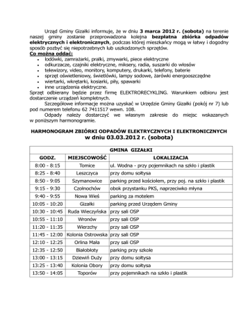 Urząd Gminy Gizałki informuje, że w dniu 3 marca 2012 r. (sobota) na terenie naszej gminy zostanie przeprowadzona kolejna bezpłatna zbiórka odpadów elektrycznych i elektronicznych, podczas której mieszkańcy mogą w łatwy i dogodny sposób pozbyć się niepotrzebnych lub uszkodzonych sprzętów. Co można oddać: lodówki, zamrażarki, pralki, zmywarki, piece elektryczne odkurzacze, czajniki elektryczne, miksery, radia, suszarki do włosów telewizory, video, monitory, komputery, drukarki, telefony, baterie sprzęt oświetleniowy, świetlówki, lampy sodowe, żarówki energooszczędne wiertarki, wkrętarki, kosiarki, piły, spawarki inne urządzenia elektryczne. Sprzęt odbierany będzie przez firmę ELEKTRORECYKLING. Warunkiem odbioru jest dostarczenie urządzeń kompletnych. Szczegółowe informacje można uzyskać w Urzędzie Gminy Gizałki (pokój nr 7) lub pod numerem telefonu 62 7411517 wewn. 108. Odpady należy dostarczyć we własnym zakresie do miejsc wskazanych w poniższym harmonogramie. HARMONOGRAM ZBIÓRKI ODPADÓW ELEKTRYCZNYCH I ELEKTRONICZNYCH w dniu 03.03.2012 r. (sobota) GMINA GIZAŁKI GODZ. MIEJSCOWOŚĆ 8:00 - 8:15 Tomice 8:25 - 8:40 Leszczyca 8:50 - 9:05 Szymanowice 9:15 - 9:30 Czołnochów obok przystanku PKS, naprzeciwko młyna 9:40 - 9:55 Nowa Wieś parking za motelem 10:05 - 10:20 Gizałki 10:30 - 10:45 LOKALIZACJA ul. Wodna - przy pojemnikach na szkło i plastik przy domu sołtysa parking przed kościołem, przy poj. na szkło i plastik parking przed Urzędem Gminy Ruda Wieczyńska przy sali OSP 10:55 - 11:10 Wronów przy sali OSP 11:20 - 11:35 Wierzchy przy sali OSP 11:45 - 12:00 Kolonia Ostrowska przy sali OSP 12:10 - 12:25 Orlina Mała przy sali OSP 12:35 - 12:50 Białobłoty parking przy szkole 13:00 - 13:15 Dziewiń Duży przy domu sołtysa 13:25 - 13:40 Kolonia Obory przy domu sołtysa 13:50 - 14:05 Toporów przy pojemnikach na szkło i plastik