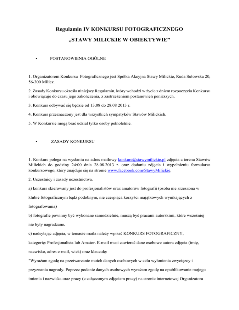 Regulamin IV KONKURSU FOTOGRAFICZNEGO „STAWY MILICKIE W OBIEKTYWIE” • POSTANOWIENIA OGÓLNE 1. Organizatorem Konkursu Fotograficznego jest Spółka Akcyjna Stawy Milickie, Ruda Sułowska 20, 56-300 Milicz. 2. Zasady Konkursu określa niniejszy Regulamin, który wchodzi w życie z dniem rozpoczęcia Konkursu i obowiązuje do czasu jego zakończenia, z zastrzeżeniem postanowień poniższych. 3. Konkurs odbywać się będzie od 13.08 do 28.08 2013 r. 4. Konkurs przeznaczony jest dla wszystkich sympatyków Stawów Milickich. 5. W Konkursie mogą brać udział tylko osoby pełnoletnie. • ZASADY KONKURSU 1. Konkurs polega na wysłaniu na adres mailowy [email protected] zdjęcia z terenu Stawów Milickich do godziny 24:00 dnia 28.08.2013 r. oraz dodaniu zdjęcia i wypełnieniu formularza konkursowego, który znajduje się na stronie www.facebook.com/StawyMilickie. 2. Uczestnicy i zasady uczestnictwa. a) konkurs skierowany jest do profesjonalistów oraz amatorów fotografii (osoba nie zrzeszona w klubie fotograficznym bądź podobnym, nie czerpiąca korzyści majątkowych wynikających z fotografowania) b) fotografie powinny być wykonane samodzielnie, muszą być pracami autorskimi, które wcześniej nie były nagradzane. c) nadsyłając zdjęcia, w temacie maila należy wpisać KONKURS FOTOGRAFICZNY, kategorię: Profesjonalista lub Amator. E-mail musi zawierać dane osobowe autora zdjęcia (imię, nazwisko, adres e-mail, wiek) oraz klauzulę: "Wyrażam zgodę na przetwarzanie moich danych osobowych w celu wyłonienia zwycięzcy i przyznania nagrody. Poprzez podanie danych osobowych wyrażam zgodę na opublikowanie mojego imienia i nazwiska oraz pracy (z załączonym zdjęciem pracy) na stronie internetowej Organizatora a także w innym mediach, gdzie prace będą prezentowane. Oświadczam także, że jestem autorem nadesłanego zdjęcia. Zgodnie z art. 81 ustawy z dnia 4 lutego 1994 r. o prawie autorskim i prawach pokrewnych (Dz. U. z 2006 r., Nr 90, poz. 631, ze zm.) wyrażam zgodę na nieodpłatne używanie i rozpowszechnianie mojego zdjęcia w celach promocyjnych miasta Radzyń Podlaski". d) w przypadku osób niepełnoletnich, wymagana jest również zgoda rodzica/opiekuna prawnego. e) Biorąc udział w konkursie uczestnicy wyrażają zgodę na zamieszczenie zdjęcia na portalu społecznościowym Facebook i na stronie www.stawymilickie.pl oraz na przetwarzanie swoich danych osobowych na potrzeby spółki Stawy Milickie SA w zakresie niezbędnym do realizacji konkursu, jak również przyjmuje do wiadomości, że został poinformowany o prawie wglądu w swoje dane osobowe, poprawiania ich, jak i zadania usunięcia ich w każdej chwili. f) Biorąc udział w konkursie uczestnicy oświadczają, że przysługują im prawa autorskie do przesłanych na konkurs zdjęć oraz, że są ich jedynymi i wyłącznymi dysponentami, i że fotografie te nie są obciążone prawami osób trzecich. g) Udział w konkursie jest jednoznaczny z nieodpłatnym udzieleniem prawa do nieodpłatnego wykorzystywania prac w następujących polach eksploatacji: druku w dowolnej liczbie publikacji i w dowolnym nakładzie, używania ich w Internecie oraz w innych formach utrwaleń, nadających się do rozpowszechniania w ramach działań spółki Stawy Milickie SA. 2. W konkursie można wziąć udział tylko raz, zamieszczając tylko jedno zdjęcie. 3. Zwycięzcę w konkursie wyłoni jury powołane przez organizatora konkursu, natomiast zdjęcie, które otrzyma najwięcej głosów do godziny 24:00 dnia 28.08.2014 r., przyznanych przez użytkowników portalu społecznościowego Facebook otrzyma wyróżnienie. 4. Ogłoszenie wyniku konkursu nastąpi 31.08.2013 podczas obchodów Dni Karpia we Wrocławiu. Wyniki Konkursu zostaną opublikowane na profilu Stawów Milickich na portalu społecznościowym Facebook oraz na stronie www.stawymilickie.pl. 5. Stawy Milickie SA zastrzega sobie prawo odwołania Konkursu w dowolnej chwili, bez podania przyczyny. Przesłane zdjęcia zostaną w przypadku anulowania Konkursu usunięte ze wszelkich nośników pamięci, należących do Spółki. • NAGRODY 1. Przewidziana nagroda główna to 500 zł oraz bilet dla dwóch osób na FotoSafari (dla każdej kategorii) do zrealizowania w dowolnym terminie w okresie od września do października 2014 zgodnie z planem wycieczek weekendowych (sobota lub niedziela) organizowanych przez Spółkę. Realizacja nagrody głównej w postaci dwóch biletów na FotoSafari możliwa jest w miarę wolnych miejsc na wybrany termin FotoSafari. Natomiast kwota 500 zł, zostanie wypłacona przez Organizatora na podane przez zwycięzcę konkursu konto bankowe. Dodatkowo przewidziane są inne nagrody rzeczowe w postaci gadżetów spółki Stawy Milickie. 2. O wynikach konkursu laureaci zostaną powiadomieni drogą elektroniczną: a) Jeżeli pomimo podjęcia próby powiadomienia uczestnika, nie uda się uzyskać odpowiedzi (odpowiedź na e-maila w ciągu 24 h) - kwalifikacja uczestnika może być anulowana. Po 3 dniach wybieramy kolejnych zwycięzców. 3. Organizatorzy nie ponoszą odpowiedzialności za jakość i ciągłość Facebooka, w szczególności za jakiekolwiek opóźnienia lub inne utrudnienia w przesyłaniu zdjęć 4. Przekazanie nagrody: a) Laureaci umawiają się z organizatorem Konkursu telefonicznie (71) 38 47 110 lub mailowo: [email protected] na konkretny termin odbioru nagrody. Nagroda realizowana jest w terminie 3 tygodni od daty ogłoszenia wyników. • POSTANOWIENIA KOŃCOWE 1. Przystąpienie do udziału w Konkursie jest jednoznaczne z przyjęciem warunków niniejszego Regulaminu. 2. Organizatorzy zastrzegają sobie możliwość zmiany niniejszego regulaminu w każdym czasie. 3. Przystąpienie do Konkursu jest równoznaczne z wyrażeniem zgody przez uczestnika Konkursu na podanie do publicznej wiadomości jego danych osobowych (imię i nazwisko), chyba że w tym samym momencie osoba złoży zastrzeżenie przeciwne. 4. W sprawach nieuregulowa