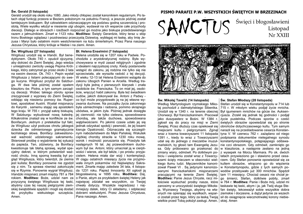 Św. Gerald (5 listopada) Gerald urodził się około roku 1080. Jako młody chłopiec został kanonikiem regularnym. Po latach objął funkcję przeora w Beziers położonym na południu Francji, a jeszcze później został tamtejszym biskupem. Był człowiekiem odznaczającym się podziwu godną szczerością i prostotą. Wiele wysiłku włożył w niesienie ulgi ubogim, wydawał na ich wsparcie całe przychody diecezji. Dlatego w obrazach i rzeźbach rozpoznać go można jako biskupa przedstawianego razem z jałmużnikiem. Zmarł w 1123 roku. Modlitwa: Święty Gerardzie, który teraz u stóp tronu Boskiego oglądasz i pozdrawiasz przeczystą Dziewicę, wybłagaj mi łaskę, aby Imię Jezusa i Maryi było ostatnim moim westchnieniem na łożu śmiertelnym. Przez Pana naszego Jezusa Chrystusa, który króluje w Niebie i na ziemi. Amen. Św. Wirgiliusz (27 listopada) Wirgiliusz urodził się w Irlandii. Był benedyktynem. Około 740 r. opuścił ojczyznę, aby dotrzeć do Ziemi Świętej. Jego wiedza i umiejętności zwróciły uwagę Pepina Krótkiego, który zatrzymał go przez około 2 lata na swoim dworze. Ok. 743 r. Pepin wysłał Wirgiliusza z listami polecającymi do swego kuzyna. Wirgiliusz przybył do Salzburga. W dwa lata później został opatem klasztoru św. Piotra, a tym samym zarządcą diecezji. Wobec takiego obrotu spraw zrezygnował z wyprawy do Ziemi Świętej, oddając się niesieniu pomocy św. Rupertowi, apostołowi Austrii. Wysłał misjonarzy do Karyntii , samemu stając się apostołem tego kraju. W 755 r. przyjął sakrę biskupią. W Salzburgu wybudował nową katedrę. Kilkakrotnie znalazł się w konflikcie ze św. Bonifacym. Jednym z pretekstów był fakt, że Wirgiliusz użył podczas chrztu jakiegoś dziecka źle odmienionego gramatycznie łacińskiego słowa. Bonifacy zakwestionował ważność udzielonego sakramentu. Skierował prośbę o wyjaśnienie tej sytuacji do papieża. Ten, zdziwiony, że Bonifacy kwestionuje tak błahą sprawę, wydał specjalny dekret, w którym potwierdził ważność chrztu. Inną sporną kwestią był pogląd Wirgiliusza, który twierdził, że ziemia jest kulista; Bonifacy ponownie nie zgodził się z nim. Ta sprawa również zakończyła się w Rzymie. Ponownie wygrał Wirgiliusz. Irlandzki misjonarz zmarł między 781 a 784 rokiem. Modlitwa: Boże, udziel nam za przyczyną świętego Wirgiliusza tej łaski, abyśmy czas tej naszej pielgrzymki ziemskiej świątobliwie spędzili i mogli się dostać do przybytku wiekuistego szczęścia. Amen. Bł. Helena Enselmini (7 listopada) Helena urodziła się w 1207 roku w Padwie. Pochodziła z arystokratycznej rodziny. Była wychowywana w myśl zasad religijnych i zgodnie z ideałami najczystszej cnoty. Kiedy postanowiła wstąpić do zakonu, jej rodzina nie tylko się nie sprzeciwiała, ale wyraziła radość z tej decyzji. W wieku 12-13 lat Helena Enselmini wstąpiła do zakonu Ubogich Panien w Arcella. Według tradycji była jedną z pierwszych klarysek i znała osobiście św. Franciszka. To on miał jej, osobiście, wręczyć habit zakonny. Była też świadkiem cudów, jakich dokonywał św. Antoni z Padwy co być może przygotowało ją na jej własne wyzwania duchowe. Na początku życia zakonnego była uśmiechnięta i radosna, pomimo skrajnego ubóstwa, w jakim żyła. Później jednak dosięgła jej ciemność: nie tylko cielesna, spowodowana chorobą, ale także duchowa, spowodowana wątpliwościami. Po jakimś czasie udało jej się jednak odzyskać spokój i pewność, że jej losami kieruje Opatrzność. Odznaczała się szczególnym nabożeństwem do Męki Pańskiej. Wskutek ciężkiej choroby straciła w 1230 roku mowę, wzrok i możność poruszania się. Przeżyła tak następnych 16 lat. Jej przewodnikiem duchowym był św. Antoni, który umacniał ją w cierpliwości i wierze, ale był także, i po prostu: przyjacielem. Helena miała dar wizji i kontemplacji. W ciągu ostatnich miesięcy życia nie przyjmowała innych pokarmów niż Najświętszy Sakrament. Zmarła mając zaledwie 34 lata, 4 listopada 1231 roku. Papież Innocenty XII ogłosił ją błogosławioną w 1695 roku. Modlitwa: Daj, o Panie, abym za przykładem świętej Heleny jak najwięcej zdziałał we wszystkim, co Twojej chwały dotyczy. Wszakże nagradzasz i najmniejszy datek, który Ci składamy, i odpłacasz dobrami wiekuistymi. Przez Jezusa Chrystusa, Pana naszego. Amen. PISMO PARAFII P.W. WSZYSTKICH ŚWIĘTYCH W BRZEZINACH SANC SANCTUS Św. Mikołaj Tavelić (14 listopada) Według Martyrologium rzymskiego Mikołaj pochodził z dalmatyńskiego Sibenika. Urodził się w 1340 r. na terenie obecnej Chorwacji. Był franciszkaninem. Pracował jako duszpasterz w Bośni. W 1384 r. zgłosił się do pracy na misji w Ziemi Świętej. Przez dłuższy czas opiekował się miejscami kultu i pielgrzymami. Zginął wraz z trzema towarzyszami 11 listopada 1391 r., kiedy to wraz z Towarzyszami udał się do jednego z meczetów muzułmańskich, by głosić tam Ewangelię Jezusa. Gdy próbowano go przekonać do zmiany wiary, odmówił. Po dotkliwym pobiciu i uwięzieniu został wraz z Towarzyszami ścięty mieczem w obecności wielkiego tłumu ludzi. Męczenników kanonizował Paweł VI . Są jedynymi kanonizowanymi franciszkańskimi misjonarzami pracującymi na terenie Ziemi Świętej. Modlitwa: Panie Jezus Chryste, racz miłościwie wysłuchać prośby nasze, które zanosimy w uroczystość świętego Mikołaja, Wyznawcy Twojego, abyśmy na własnych nie opierając się wysiłkach, wsparci zostali przez tego, który za łaską Twoją wielkie przed Tobą położył zasługi. Amen. Święci i błogosławieni Listopad Nr XXIII Św. Stefan Młodszy (28 listopada) Stefan urodził się w Konstantynopolu w 714 lub 715 r. W młodym wieku podjął życie mnicha. Był igumenem mnichów na górze św. Auksencjusza. Zrzekł się jednak tej godności i podjął życie pustelnika. Podczas sporów o cześć świętych obra