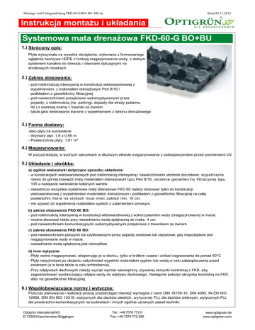 Montage- und Verlegeanleitung FKD-60-G BO+BU -DE.xls Stand 28.11.2012 Instrukcja montażu i układania erlegeanleitung Systemowa mata drenażowa FKD-60-G BO+BU 1.) Skrócony opis: Płyta wytrzymała na wysokie obciążenia, wykonana z formowanego wgłębnie tworzywa HDPE z funkcją magazynowania wody, z dolnym systemem kanałów do drenażu i otworami dyfuzyjnymi na środkowych mostkach 2.) Zakres stosowania: - pod roślinnością intensywną w konstrukcji wielowarstwowej z wypełnieniem, z materiałem drenażowym Perl 8/16 i podkładem z geowłókniny filtracyjnej - pod nawierzchniami przejściowo wykorzystywanymi przez pojazdy, z roślinnością (np. parkingi, dojazdy dla straży pożarne, itd.) z warstwą nośną + trawniki ze żwirem - także jako deskowanie tracone z wypełnieniem z betonu drenażowego 3.) Forma dostawy: Jako płyty na europalecie - Wymiary płyt: 1,9 x 0,95 m - Powierzchnia płyty: 1,81 m² 4.) Magazynowanie: W pozycji leżącej, w suchych warunkach w dłuższym okresie magazynowania z zabezpieczeniem przed promieniami UV 5.) Układanie i obróbka: a) ogólne wskazówki dotyczące sposobu układania: - w konstrukcjach wielowarstwowych pod roślinnością intensywną i nawierzchniami ułożenie doczołowe, wypełnienie równo do górnej krawędzi maty materiałem drenażowym typu Perl 8/16, ułożenie geowłókniny filtracyjnej typu 105 a następnie naniesienie kolejnych warstw. - zasadniczo wszystkie systemowe maty drenażowe FKD 60 należy stosować tylko do konstrukcji wielowarstwowej z wypełnieniem materiałem drenażowym i podkładem z geowłókniny filtracyjnej na całej powierzchni, które na stykach musi mieć zakład min. 10 cm. - nie używać do wypełnienia materiałów sypkich z uziarnieniem zerowym. b) zakres stosowania FKD 60 BO: - pod roślinnością intensywną w konstrukcji wielowarstwowej z wykorzystaniem wody zmagazynowanej w macie. - można stosować także przy nawadnianiu wodą spiętrzoną do maks. 4 cm - pod nawierzchniami komunikacyjnymi wykorzystywanymi przejściowo z trawnikiem ze żwirem c) zakres stosowania FKD 60 BU: - pod nawierzchniami pieszymi lub użytkowanymi przez pojazdy osobowe lub ciężarowe, gdy niepożądane jest magazynowanie wody w macie. - nawadnianie wodą spiętrzoną jest niemożliwe d) inne wytyczne: - Płyty wolno magazynować, eksponując je w słońcu, tylko w krótkim czasie i unikać nagrzewania do ponad 60°C - Płyty natychmiast po ułożeniu natychmiast wypełnić materiałem sypkim lub wodą w celu zabezpieczenia przed zwianiem (a w lecie także w celu schłodzenia). - Przy odpływach dachowych należy wyciąć wymiar wewnętrzny używanej skrzynki kontrolnej z FKD, aby zagwarantować wystarczający odpływ wody do odpływu dachowego. Następnie położyć skrzynkę kontrolną na FKD albo na geowłókninie filtracyjnej. 6.) Współobowiązujące normy i wytyczne: Podczas planowania i realizacji proszę przestrzegać również wymogów z norm DIN 18195-10, DIN 4095, IN EN ISO 12958, DIN EN ISO 10319, wytycznych dla dachów płaskich, wytycznej FLL dla dachów zielonych, wytycznych FLL dla powierzchni komunikacyjnych na budowlach i innych ogólnie uznanych zasad techniki. Optigrün international AG D-72505 Krauchenwies-Göggingen Tel.: +49 7576 772 0 Fax: +49 7576 772 299 www.optigruen.de www.optigreen.com