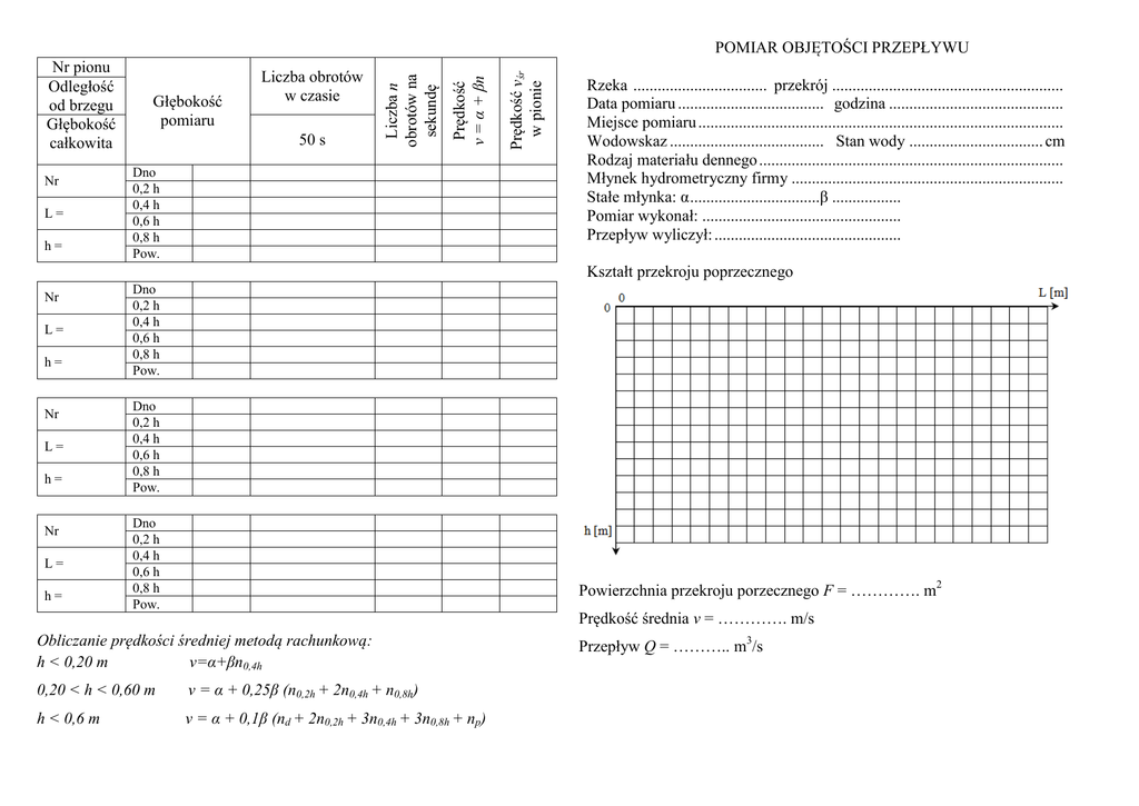 Nr L= h= 50 s Dno 0,2 h 0,4 h 0,6 h 0,8 h Pow. Prędkość vśr w pionie Głębokość pomiaru Liczba obrotów w czasie Prędkość v = α + βn Nr pionu Odległość od brzegu Głębokość całkowita Liczba n obrotów na sekundę POMIAR OBJĘTOŚCI PRZEPŁYWU Rzeka ................................. przekrój ......................................................... Data pomiaru .................................... godzina ........................................... Miejsce pomiaru .......................................................................................... Wodowskaz ...................................... Stan wody ................................. cm Rodzaj materiału dennego ........................................................................... Młynek hydrometryczny firmy ................................................................... Stałe młynka: α ................................β ................. Pomiar wykonał: ................................................. Przepływ wyliczył: .............................................. Kształt przekroju poprzecznego Nr L= h= Nr L= h= Nr L= h= Dno 0,2 h 0,4 h 0,6 h 0,8 h Pow. Dno 0,2 h 0,4 h 0,6 h 0,8 h Pow. Dno 0,2 h 0,4 h 0,6 h 0,8 h Pow. Powierzchnia przekroju porzecznego F = …………. m2 Prędkość średnia v = …………. m/s Obliczanie prędkości średniej metodą rachunkową: h < 0,20 m v=α+βn0,4h 0,20 < h < 0,60 m v = α + 0,25β (n0,2h + 2n0,4h + n0,8h) h < 0,6 m v = α + 0,1β (nd + 2n0,2h + 3n0,4h + 3n0,8h + np) Przepływ Q = ……….. m3/s 1 2 3 4 5 6 7 8 9 10 11 12 13 14 15 16 17 18 19 20 21 22 23 24 25 26 27 28 29 30 31 32 33 34 35 36 37 38 39 40 41 42 43 44 45 46 47 48 49 50 Nr L= h= Nr L= h= Nr L= h= Nr L= h= Nr L= h= 50 s Dno 0,2 h 0,4 h 0,6 h 0,8 h Pow. Dno 0,2 h 0,4 h 0,6 h 0,8 h Pow. Dno 0,2 h 0,4 h 0,6 h 0,8 h Pow. Dno 0,2 h 0,4 h 0,6 h 0,8 h Pow. Dno 0,2 h 0,4 h 0,6 h 0,8 h Pow. Prędkość vśr w pionie Głębokość pomiaru Liczba obrotów w czasie Prędkość v = α + βn Nr pionu Odległość od brzegu Głębokość całkowita Liczba n obrotów na sekundę Głębokość w pionie [m] Odległość od brzegu [m] Nr pionu sondowania Głębokość w pionie [m] Odległość od brzegu [m] Nr pionu sondowania Sondowanie przekroju poprzecznego