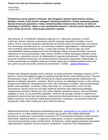 Kamera nie może być skierowana na podwórko sąsiada Paweł Wittich 6 marca 2015 Przełomowy wyrok zapadł w Kielcach. Sąd okręgowy zakazał rejestrowania obrazu i dźwięku z kamer, które swoim zasięgiem obejmują podwórko i bramę wjazdową sąsiada. Sprawa dotyczyła sąsiadów z małej, świętokrzyskiej miejscowości, którzy od wielu lat pozostają w konflikcie. Jeden z nich zainstalował kamery w obronie przed sąsiadem, przy czym chciał się bronić...obserwując podwórko sąsiada. Sąd wskazał, że „Prywatność człowieka obejmuje m.in. zdarzenia związane z życiem rodzinnym, stanem zdrowia, przeszłością również sytuację materialną, kontakty z innymi ludźmi. W tym znaczeniu pozwany dopuścił się naruszenia prawa do prywatności, do ochrony miru domowego powoda przez to, że za pomocą urządzeń nagrywających i odtwarzających miał możliwość obserwowania obrazu z części jego posesji. W ocenie sądu nie może usprawiedliwiać takiego postępowania fakt istniejącego między stronami konfliktu i poczucie zagrożenia ze strony pozwanego i jego rodziny, bowiem w takich sytuacjach pozwany może zwrócić się o udzielenie ochrony do odpowiednich organów państwowych.” Sąd nie podważył prawa do instalacji monitoringu, ale wskazał granice stosowania tego prawa, stwierdzając, że „Prawo pozwanego do podjęcia ustalonych działań dotyczących bezpieczeństwa kończy się tam, gdzie zaczyna się prawo powoda do prywatności” (źródło: „Gazeta Wyborcza”) Kielecki sąd okręgowy wydając wyrok wskazał, że osoby prywatnie instalujące systemy CCTV, powinny zwrócić szczególną uwagę na zasadę proporcjonalności sformułowaną przez Trybunał Konstytucyjny (Sygn. akt K 23/98). Wcześniej do zasady proporcjonalności odwoływano się głównie w relacjach obywatel – państwo. Wyrok oznacza, że zakładając kamery w celu ochrony posesji przed wejściem nieuprawnionych osób, albo instalując je na bloku, żeby przeciwdziałać graffiti, warto pamiętać, że kamery należy skierować np. na ścianę domu, która ma być dozorowana i obszar przed nią, tak żeby zapewnić kamerom pole widzenia pozwalające zarejestrować sprawcę. Należy przy tym unikać takiego ustawienia kamery, które pozwoliłoby zaglądać w okna, czy na podwórko sąsiadów. Jeżeli nie da się tego uniknąć to ingerencja w prywatność powinna być jak najmniejsza. Intencjonalne skierowanie kamery na czyjąś posesję, będzie wyraźnym naruszeniem zasad proporcjonalności i celowości i naruszeniem prawa do prywatności osób, które znajdą się w polu widzenia kamery. Akademia Monitoringu Wizyjnego przedstawiła powyższe stanowisko już w grudniu 2012 r. W naszej ocenie, w nowej ustawie powinny znaleźć się przepisy, które będą nakazywały prywatnym i publicznym użytkownikom systemów CCTV prowadzenie celowej i proporcjonalne obserwacji i rejestracji obrazu, co ograniczy liczbę spraw, w których rozpatrywane będzie naruszenie prywatności przez montaż kamer. W dyskusji o nowej regulacji podobne stanowisko zajął Generalny Inspektor Ochrony Danych Osobowych i Rzecznik Praw Obywatelskich. 1/2 Kamera nie może być skierowana na podwórko sąsiada Paweł Wittich 6 marca 2015 Wyrok kieleckiego sądu otwiera drogę do pozwów wobec osób, które instalując kamery CCTV, chcą oglądać więcej, niż jest to potrzebne dla zabezpieczenia ich interesów. 2/2