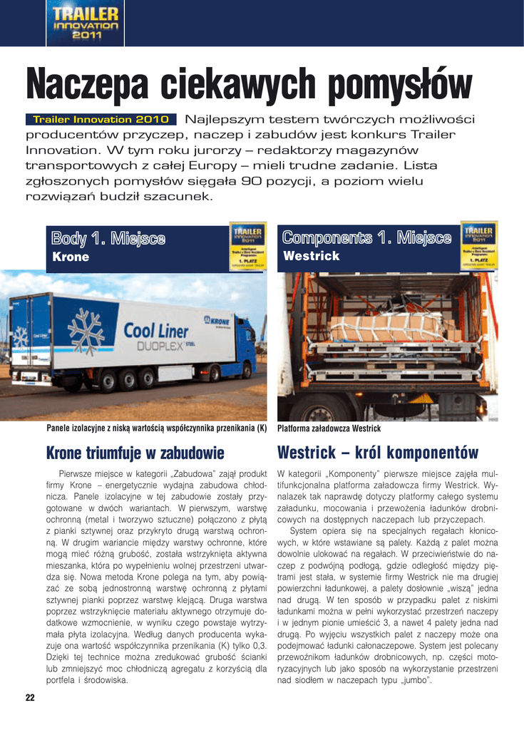 Naczepa ciekawych pomysłów Trailer Innovation 2010 Najlepszym testem twórczych możliwości producentów przyczep, naczep i zabudów jest konkurs Trailer Innovation. W tym roku jurorzy – redaktorzy magazynów transportowych z całej Europy – mieli trudne zadanie. Lista zgłoszonych pomysłów sięgała 90 pozycji, a poziom wielu rozwiązań budził szacunek. Krone 22 Westrick Panele izolacyjne z niską wartością współczynnika przenikania (K) Platforma załadowcza Westrick Krone triumfuje w zabudowie Westrick – król komponentów Pierwsze miejsce w kategorii „Zabudowa” zajął produkt firmy Krone – energetycznie wydajna zabudowa chłodnicza. Panele izolacyjne w tej zabudowie zostały przygotowane w dwóch wariantach. W pierwszym, warstwę ochronną (metal i tworzywo sztuczne) połączono z płytą z pianki sztywnej oraz przykryto drugą warstwą ochronną. W drugim wariancie między warstwy ochronne, które mogą mieć różną grubość, została wstrzyknięta aktywna mieszanka, która po wypełnieniu wolnej przestrzeni utwardza się. Nowa metoda Krone polega na tym, aby powiązać ze sobą jednostronną warstwę ochronną z płytami sztywnej pianki poprzez warstwę klejącą. Druga warstwa poprzez wstrzyknięcie materiału aktywnego otrzymuje dodatkowe wzmocnienie, w wyniku czego powstaje wytrzymała płyta izolacyjna. Według danych producenta wykazuje ona wartość współczynnika przenikania (K) tylko 0,3. Dzięki tej technice można zredukować grubość ścianki lub zmniejszyć moc chłodniczą agregatu z korzyścią dla portfela i środowiska. W kategorii „Komponenty” pierwsze miejsce zajęła multifunkcjonalna platforma załadowcza firmy Westrick. Wynalazek tak naprawdę dotyczy platformy całego systemu załadunku, mocowania i przewożenia ładunków drobnicowych na dostępnych naczepach lub przyczepach. System opiera się na specjalnych regałach kłonicowych, w które wstawiane są palety. Każdą z palet można dowolnie ulokować na regałach. W przeciwieństwie do naczep z podwójną podłogą, gdzie odległość między piętrami jest stała, w systemie firmy Westrick nie ma drugiej powierzchni ładunkowej, a palety dosłownie „wiszą” jedna nad drugą. W ten sposób w przypadku palet z niskimi ładunkami można w pełni wykorzystać przestrzeń naczepy i w jednym pionie umieścić 3, a nawet 4 palety jedna nad drugą. Po wyjęciu wszystkich palet z naczepy może ona podejmować ładunki całonaczepowe. System jest polecany przewoźnikom ładunków drobnicowych, np. części motoryzacyjnych lub jako sposób na wykorzystanie przestrzeni nad siodłem w naczepach typu „jumbo”. Schmitz Cargobull alternatywą dla 12 m pojazdów ciężarowych solo. Jej zaletą jest wymiana ciągnika i możliwość oddzielnego za- i rozładunku. Celem firmy Broshuis było stworzenie konceptu, w którym ciągnik siodłowy mógłby ciągnąć dwie naczepy City. Pojemność transportowa podnosi się wówczas nie o 50 jak w innych konceptach, ale o 100 %. W tym celu naczepy są wyposażone w podpodłogowy sprzęg siodłowy, w którym sprzężony jest jednoosiowy lub dwuosiowy wózek typu „dolly”. Pierwsza naczepa Regulacja nacisku osi w przyczepie centralnoosiowej Schmitz Cargobull liderem Pierwsze miejsce w kategorii „Podwozie” przypadło firmie Schmitz Cargobull. Nagrodzono regulację nacisku osi w przyczepie centralnoosiowej. Przyczepy z osiami centralnymi (tandem czy tridem) wymagają bardzo równomiernego rozłożenia masy ładunku. Jeśli tak się nie stanie, osie napędowe ciężarówki są niedociążone albo przeciążone. Oba stany są niekorzystne dla stateczności jazdy i niekorzystnie wpływają na sprzęg przystosowany tylko do 1000 kg nacisku. Sytuacja dodatkowo pogarsza się, jeżeli przewoźnik stosuje podwieszany wózek widłowy w przyczepie. Dlatego Schmitz Cargobull wyposaża przyczepy tandem i tridem w system kompensacji obciążenia osi. Technika ta wykorzystuje stosowany w przyczepach układ EBS regulujący ciśnienie w miechach (wywołane obciążeniem osi) jako wielkość sterującą. System sam wykrywa obciążenie i reguluje wysokość miechów między osiami. W przypadku jazdy na pusto (lub na pusto z wózkiem widłowym) układ spowoduje zmniejszenie ciśnienia w pierwszej osi. Gdy pojazd zostanie załadowany w połowie (bliżej dyszla) układ podniesie ciśnienie w miechach pierwszej osi. Dzięki zastosowaniu tego rozwiązania zestaw przyczepowy zachowuje dopuszczalne obciążenie sprzęgu, ogranicza zużycie opon oraz podnosi bezpieczeństwo jazdy. Broshuis Koncept dla Broshuis W kategorii „Koncept” zwyciężyła propozycja firmy Broshuis – zestaw naczepowy z dwoma naczepami City. Naczepa City (ok. 10,5 m długości, z osią kierowaną o nacisku 10 t) jest Euro-Combi z dwiema naczepami City posiada hydrauliczny układ kierowania osią, który jest blokowany przy sprzęgu z „dolly”. Druga naczepa City może być modelem z konwencjonalnym układem skrętu kół. Zestaw po załadowaniu np. w fabryce dociera do przedmieść miasta, w którym ma być dokonana dystrybucja ładunku. Na parkingu lub placu zestaw jest rozpinany, a ciągnik podejmując jedną z naczep wykonuje transport dystrybucyjny. Po opróżnieniu naczepy wraca po kolejną. System Broshuis wyrósł na gruncie holenderskim, gdzie w dystrybucji powszechne są naczepy jednoosiowe. Z reguły stosowane są one między miastem a centrum logistycznym. Haldex Bezpieczny Haldex W dziedzinie „Bezpieczeństwo” pierwsze miejsce uzyskał produkt firmy Haldex. Firma opracowała system bezpieczeństwa hamulców naczep i przyczep. Problem, nad którym pochylili się konstruktorzy Haldex, dotyczy sytuacji, gdy fizycznie dokonano połączenia instalacji pneumatycznych ciągnika i naczepy, ale w razie hamowania brakuje powietrza. Może to wynikać z nieszczelności układu lub niedbałego połączenia. Przy ruszaniu z miejsca kierowca może nie zauważyć braku ciśnienia powie