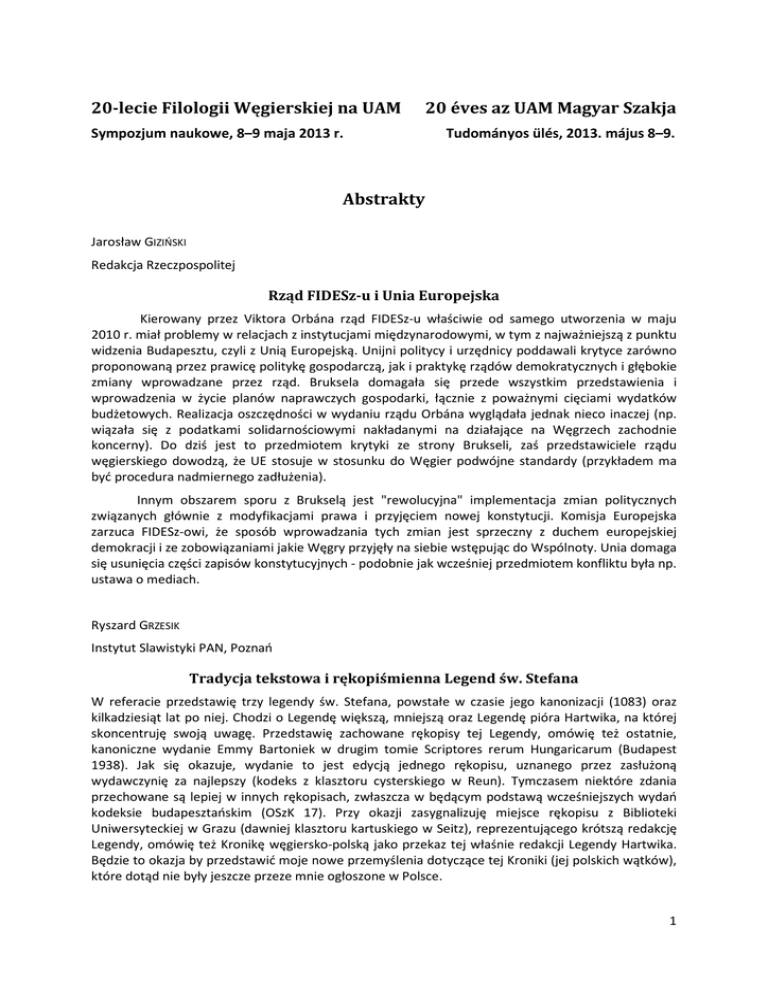 20-lecie Filologii Węgierskiej na UAM Sympozjum naukowe, 8–9 maja 2013 r. 20 éves az UAM Magyar Szakja Tudományos ülés, 2013. május 8–9. Abstrakty Jarosław GIZIŃSKI Redakcja Rzeczpospolitej Rząd FIDESz-u i Unia Europejska Kierowany przez Viktora Orbána rząd FIDESz-u właściwie od samego utworzenia w maju 2010 r. miał problemy w relacjach z instytucjami międzynarodowymi, w tym z najważniejszą z punktu widzenia Budapesztu, czyli z Unią Europejską. Unijni politycy i urzędnicy poddawali krytyce zarówno proponowaną przez prawicę politykę gospodarczą, jak i praktykę rządów demokratycznych i głębokie zmiany wprowadzane przez rząd. Bruksela domagała się przede wszystkim przedstawienia i wprowadzenia w życie planów naprawczych gospodarki, łącznie z poważnymi cięciami wydatków budżetowych. Realizacja oszczędności w wydaniu rządu Orbána wyglądała jednak nieco inaczej (np. wiązała się z podatkami solidarnościowymi nakładanymi na działające na Węgrzech zachodnie koncerny). Do dziś jest to przedmiotem krytyki ze strony Brukseli, zaś przedstawiciele rządu węgierskiego dowodzą, że UE stosuje w stosunku do Węgier podwójne standardy (przykładem ma być procedura nadmiernego zadłużenia). Innym obszarem sporu z Brukselą jest "rewolucyjna" implementacja zmian politycznych związanych głównie z modyfikacjami prawa i przyjęciem nowej konstytucji. Komisja Europejska zarzuca FIDESz-owi, że sposób wprowadzania tych zmian jest sprzeczny z duchem europejskiej demokracji i ze zobowiązaniami jakie Węgry przyjęły na siebie wstępując do Wspólnoty. Unia domaga się usunięcia części zapisów konstytucyjnych - podobnie jak wcześniej przedmiotem konfliktu była np. ustawa o mediach. Ryszard GRZESIK Instytut Slawistyki PAN, Poznań Tradycja tekstowa i rękopiśmienna Legend św. Stefana W referacie przedstawię trzy legendy św. Stefana, powstałe w czasie jego kanonizacji (1083) oraz kilkadziesiąt lat po niej. Chodzi o Legendę większą, mniejszą oraz Legendę pióra Hartwika, na której skoncentruję swoją uwagę. Przedstawię zachowane rękopisy tej Legendy, omówię też ostatnie, kanoniczne wydanie Emmy Bartoniek w drugim tomie Scriptores rerum Hungaricarum (Budapest 1938). Jak się okazuje, wydanie to jest edycją jednego rękopisu, uznanego przez zasłużoną wydawczynię za najlepszy (kodeks z klasztoru cysterskiego w Reun). Tymczasem niektóre zdania przechowane są lepiej w innych rękopisach, zwłaszcza w będącym podstawą wcześniejszych wydań kodeksie budapesztańskim (OSzK 17). Przy okazji zasygnalizuję miejsce rękopisu z Biblioteki Uniwersyteckiej w Grazu (dawniej klasztoru kartuskiego w Seitz), reprezentującego krótszą redakcję Legendy, omówię też Kronikę węgiersko-polską jako przekaz tej właśnie redakcji Legendy Hartwika. Będzie to okazja by przedstawić moje nowe przemyślenia dotyczące tej Kroniki (jej polskich wątków), które dotąd nie były jeszcze przeze mnie ogłoszone w Polsce. 1 HEGEDŰS Rita Uniwersytet Kościoła Reformowanego im. Gáspára Károliego, Katedra Językoznawstwa Węgierskiego, Budapeszt; Seminar für Hungarologie, Humboldt-Universität, Berlin Aspekt kognitywny w nauczaniu języka węgierskiego jako obcego (3) Perspektywa kognitywna wkroczyła z impetem do nauczania języka obcego, pozornie jako nowość, po tym jak podbiła i zagroziła pozbawieniem tronu kierunek generatywny, skoncentrowany na strukturze. Przynajmniej takie może odnieść wrażenie nauczyciel stojący u progu swej kariery, lecz dysponujący odpowiednim przygotowaniem teoretycznym. Uważniejsza analiza nie uprawomocnia jednak tej pospiesznej opinii. Jeśli zajmiemy się dogłębniej sposobem nauczania języka, dojdziemy do wniosku, że nauczyciel języka konceptualizuje, wyłuskuje relacje metaforyczne i metonimiczne, wskazuje na przypadkowość kategorii, na nieostrość granic. Numer (3) w tytule wykładu wskazuje na kolejność zagadnienia, które omówię, w szeregu częściowych kwestii, dotyczących nauczania węgierskiego jako języka obcego, jakimi zajmowałam się do tej pory. Po obrazowaniu i relacjach przestrzennych, moim aktualnym tematem jest określonośćnieokreśloność, a w jego ramach – analiza użycia przedimka. KÖRMENDY Adrienne Katedra Hungarystyki, Uniwersytet Warszawski Poczucie posłanictwa (misji) w węgierskiej świadomości historycznej (zarys problematyki) Eksponowana rola mesjanizmu w przetrwaniu polskiej wspólnoty narodowej w najbardziej krytycznych momentach jej historii budzi pytanie, czy w przypadku historii Węgier możemy zaobserwować podobne zjawisko. W referacie zostanie postawione pytanie o to, jakie były główne elementy ideowe tożsamości Węgrów w kluczowych momentach ich historii, a szczególnie jak postrzegali swoją historyczną rolę wobec siebie i wobec innych ludów, narodów na przestrzeni wieków; czy Madziarzy-Węgrzy mieli pewnego rodzaju poczucie misji, czy w węgierskiej myśli politycznej pojawił się motyw mesjanizmu. Referat nie daje szczegółowej i precyzyjnej odpowiedzi na te pytania. Może tylko zwrócić uwagę na kilka ważniejszych kwestii z zakresu tej problematyki; w szczególności na to, że z przyjęciem chrześcijaństwa, myśl polityczno-historyczna Węgrów została dogłębnie przesiąknięta biblijną koncepcją człowieka i historii. Węgrzy próbowali zrozumieć swoje miejsce i zadania w historii, szczególnie w najbardziej tragicznych momentach, w ramach wielkiego boskiego planu historii. W konsekwencji w węgierskiej myśli historycznej (podobnie jak u licznych innych narodów europejskich) pojawią sie motywy „narodu wybranego” i „Mesjasza”, które jednak z biegiem czasu będą związane coraz mniej z optymistyczną, a coraz bardziej z pesymistyczną wizją przyszłości. MASÁT Ádám Instytut im. Balassiego, Budapeszt Analiza porównawcza transformacji systemowej w Polsce i na Węgrzech z perspektywy obrad o